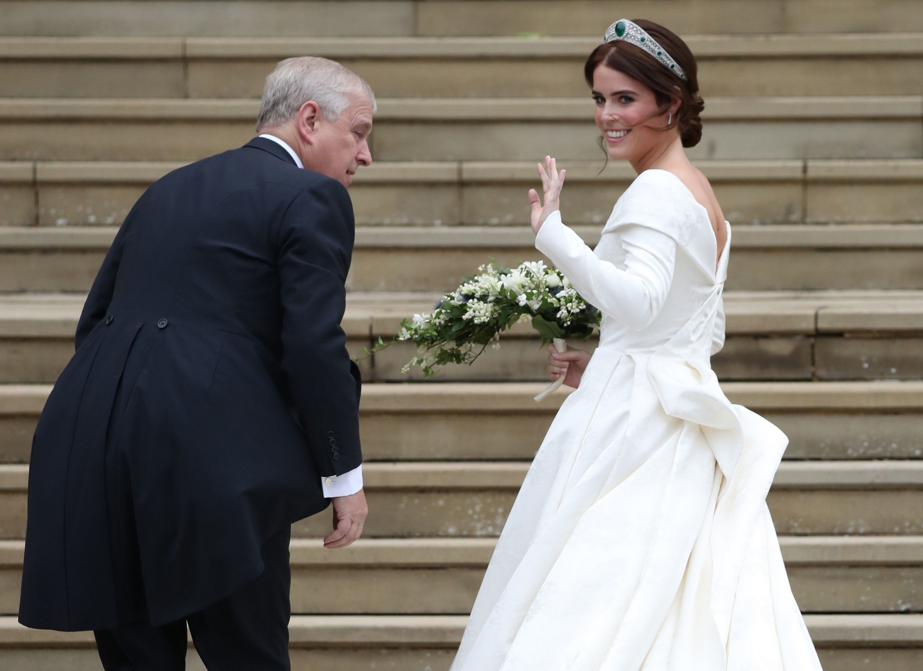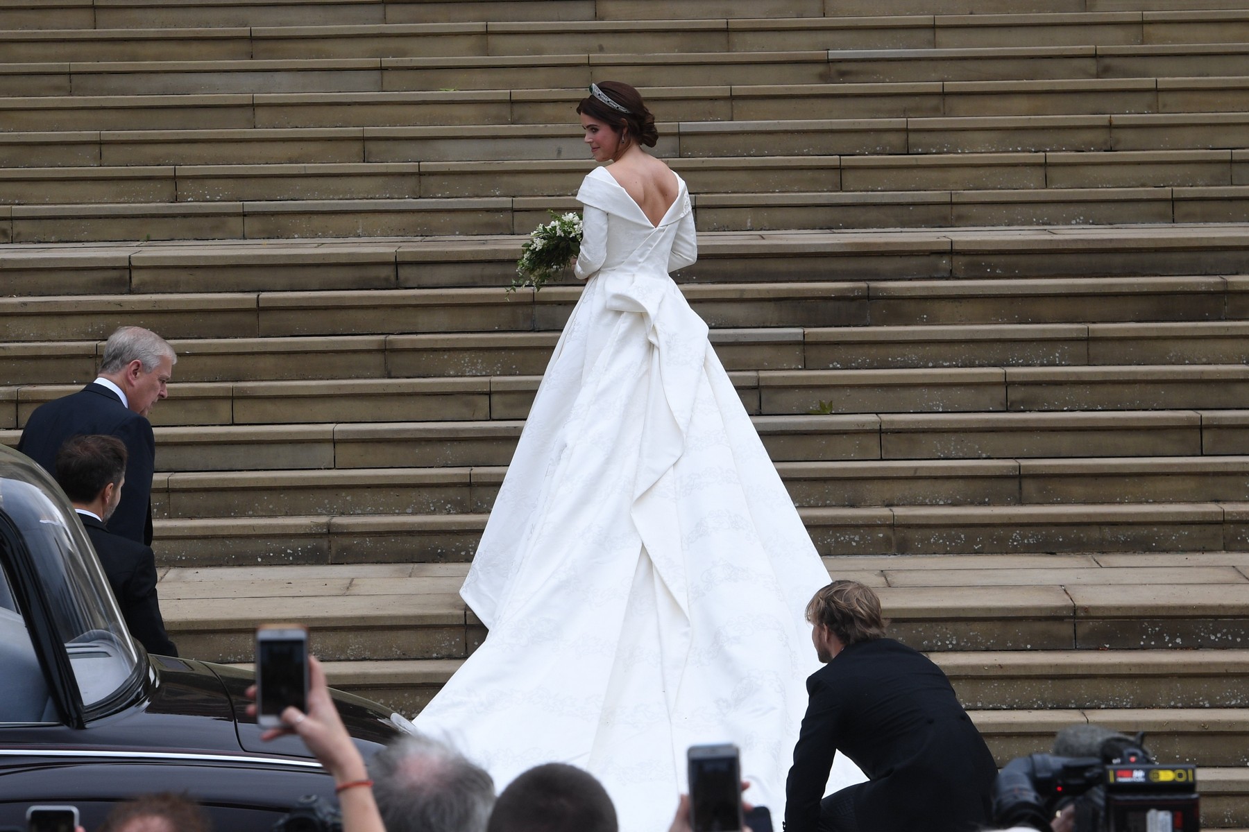 С Питером Пилотто и Кристофером де Восом, которые создавали наряд для принцессы Йоркской, она познакомилась еще в 2007 году, и с тех пор Евгения регулярно появлялась на публике в одежде бренда. Вдохновившись образами предыдущих королевских невест Великобритании, они создали платье с длинным шлейфом и широким V-образным декольте, которое переходит в открытую спину (открывая шрамы от операции, которую принцесса перенесла в 12 лет).