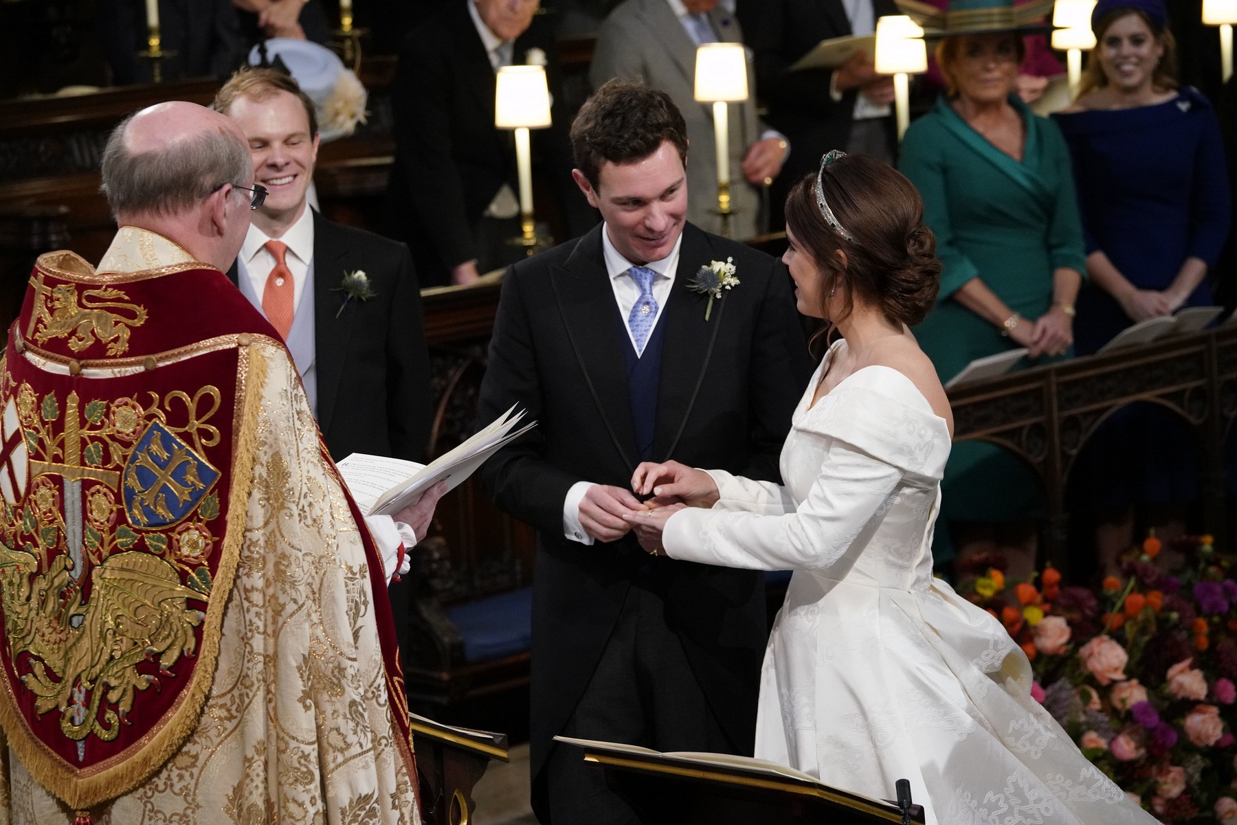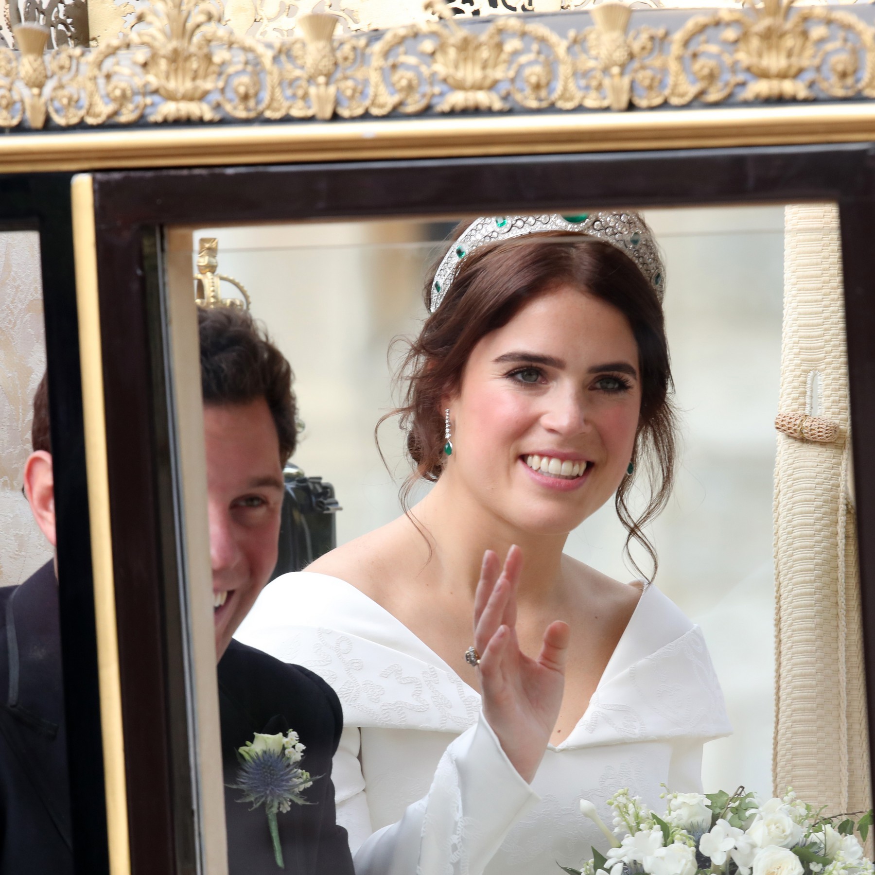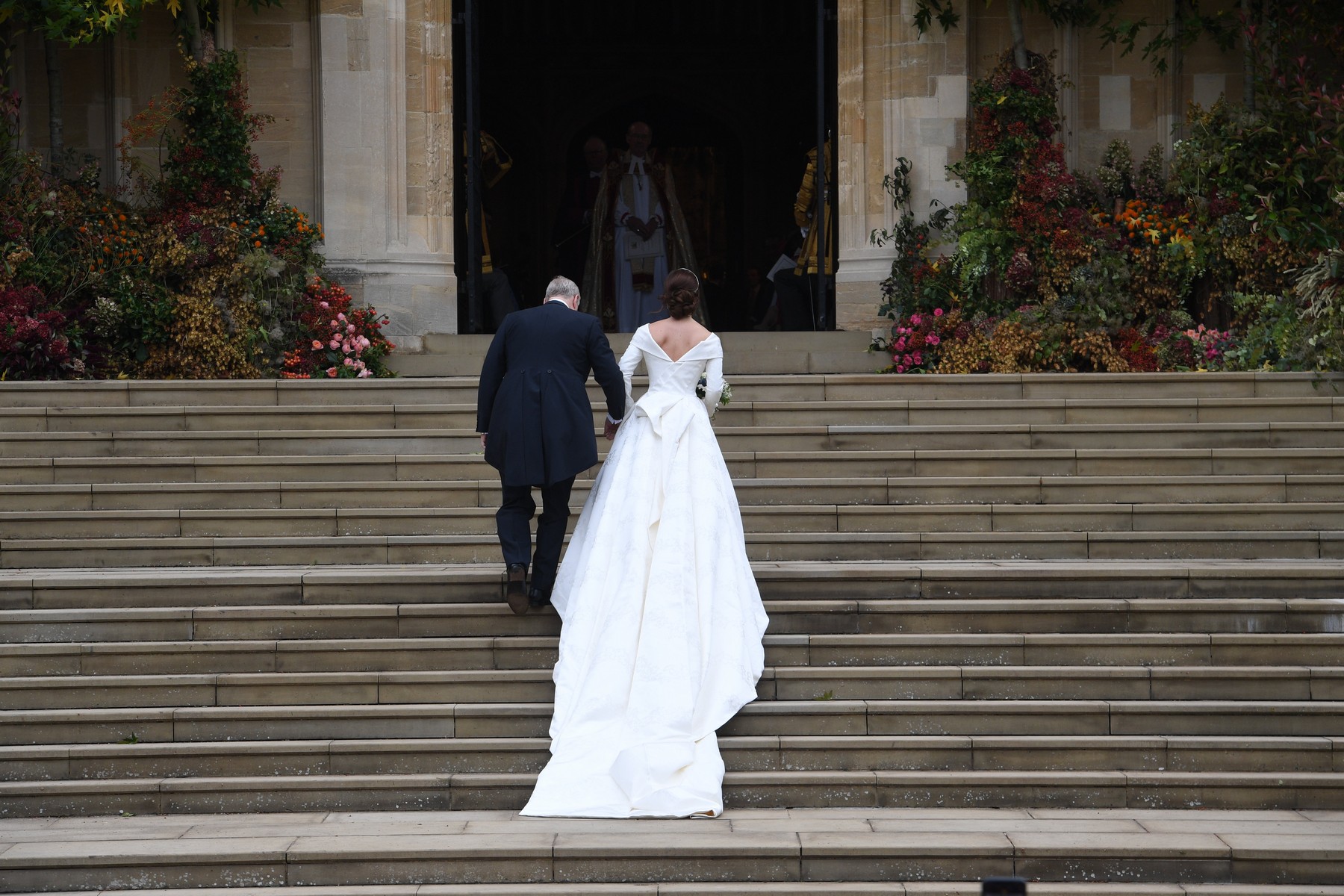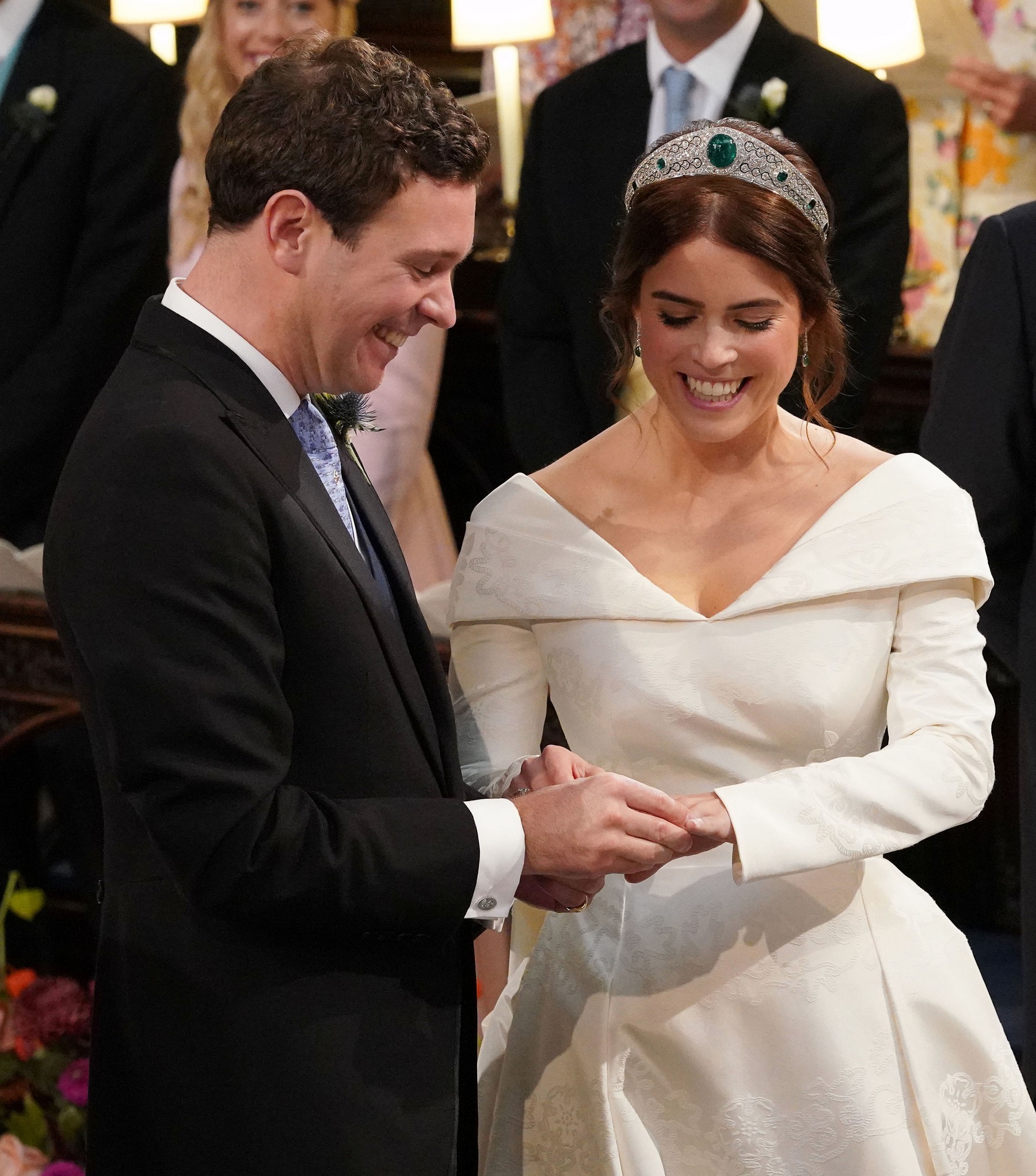 Еще когда Джек Бруксбэнк сделал предложение принцессе Евгении в начале года, она уже знала, каким будет ее образ в день свадьбы. С реализацией задумки ей помог британский бренд Peter Pilotto, создавший платье из жаккардового шелка, хлопка и вискозы. А вместо фаты принцесса надела тиару "Гренвилль" с изумрудами, которая ранее принадлежала королеве-матери.