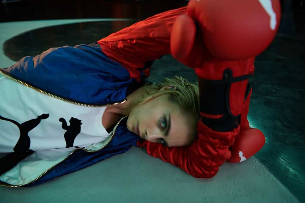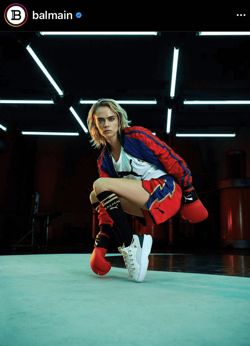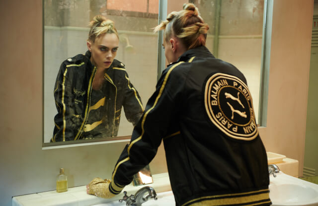 Кара Делевинь вместе с креативным директором Balmain Оливье Рустеном создали спортивную коллекцию для бренда Puma. В новую коллаборацию вошло 35 вещей для мужчин и женщин: бомберы с вышивками, футболки с принтами, кроп-топы, шорты, платья, блестящие спортивные брюки и кроссовки.