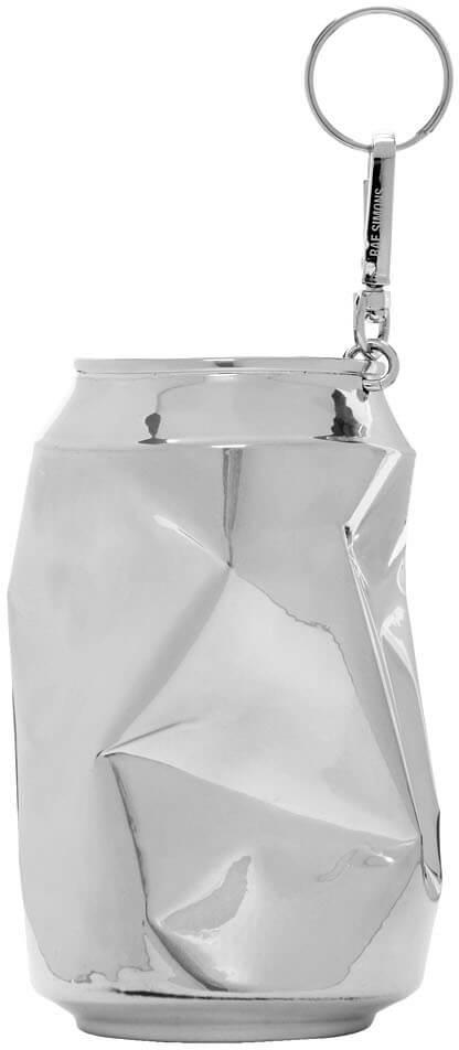 Форма брелоков в точности повторяет помятые жестяные банки. Сверху на серебряных “банках” есть язычки для открывания, а любое брендирование отсутствует. Они сделаны из алюминия в Италии.