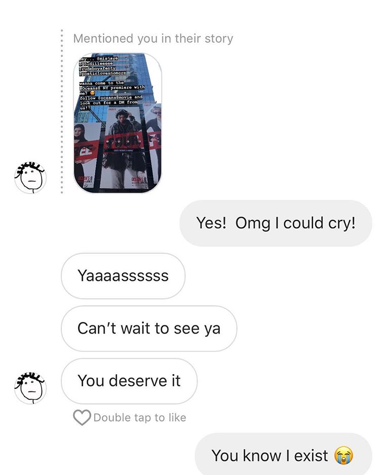 Несколько часов назад Ри выложила в инстаграм-сториз фотографию с постерами фильма «8 подруг Оушена», призвав своих поклонников подписываться на страничку фильма в инстаграме и ожидать сообщения в директе, чтобы узнать, кто станет тем самым счастливчиком, который пойдет на премьеру фильма вместе с ней. К сожалению, эта возможность есть только у тех, кто сможет посетить кинотеатр в Нью-Йорке.