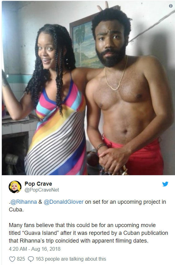 Кубинский журнал Vistar сообщил, что Рианна и Дональд Гловер, более известный как Childish Gambino, снимаются в фильме под названием Guava Island, работа над которым на данный момент происходит в Гаване.