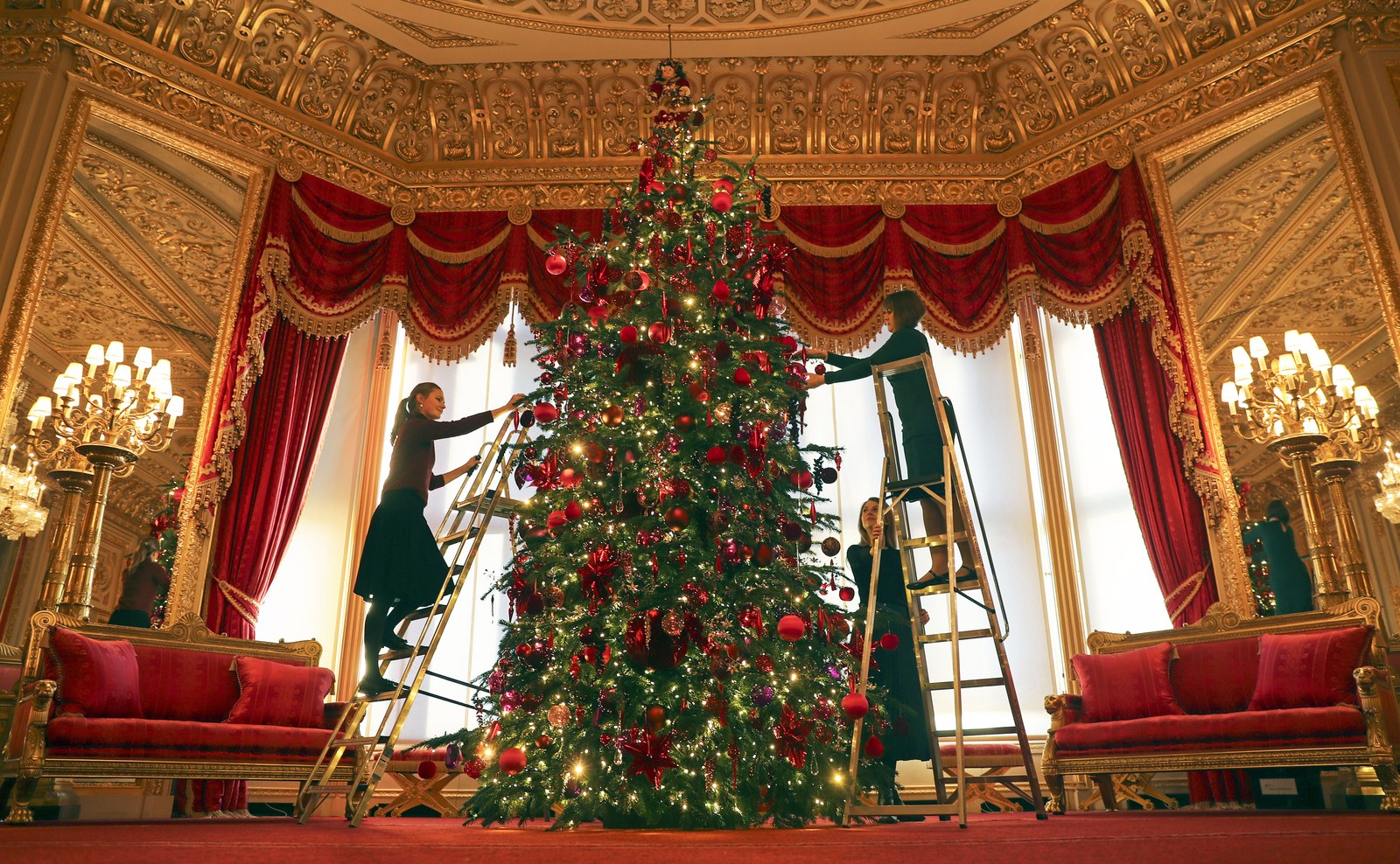 В сети появились фото новогодней елки, а также красной гостиной, в которой королева принимает гостей. В этом году Елизавета ІІ выбрала традиционный елочный декор в красных, зеленых и золотых оттенках, а также праздничные венки на стенах. Огромный стол в центре гостиной украсили золотисто-зеленой аркой и икебаной, которые прекрасно сочетаются с золотистым сервизом. Интересно, что новогоднюю елку поставили в комнате, где Меган Маркл и принц Гарри впервые показали прессе новорожденного Арчи.
