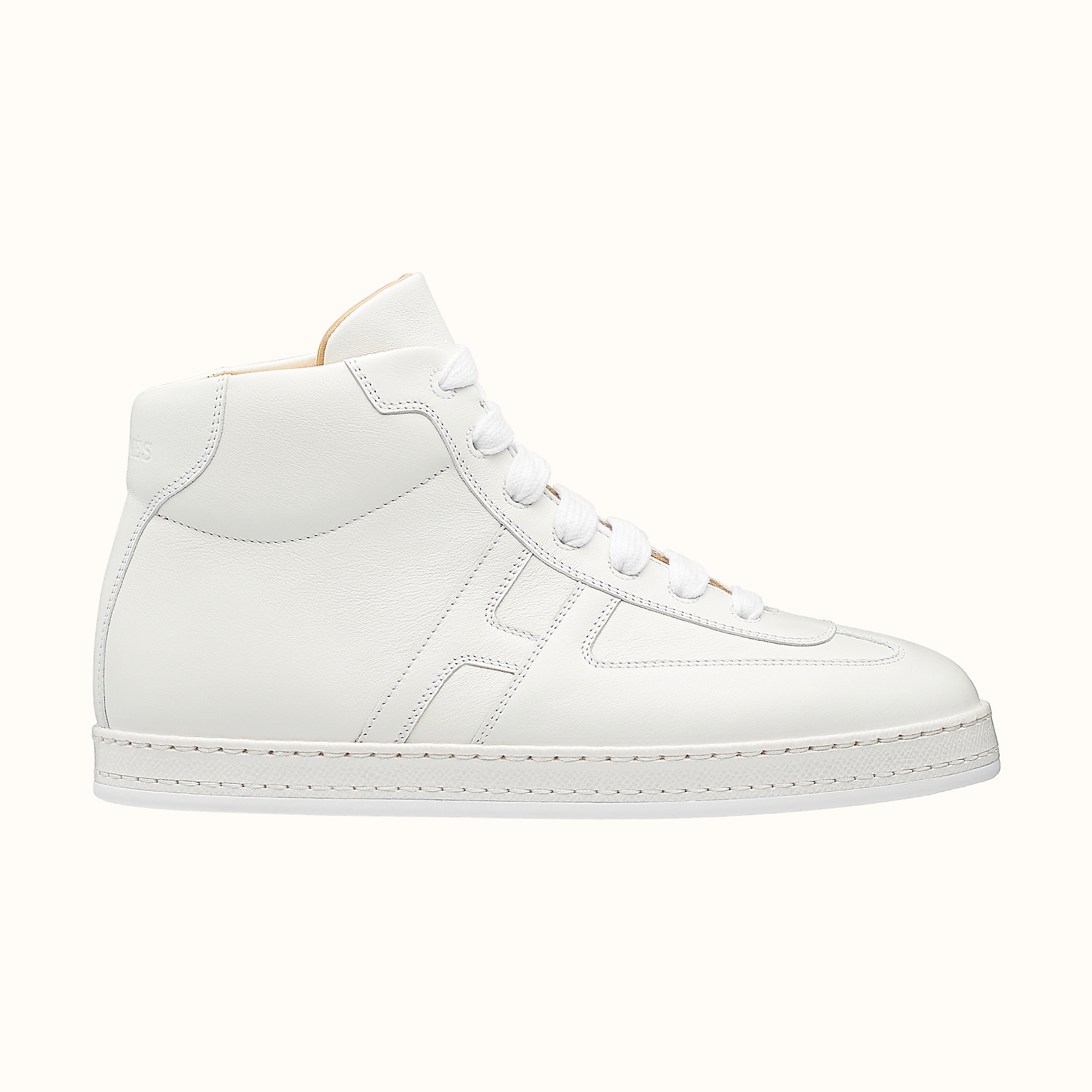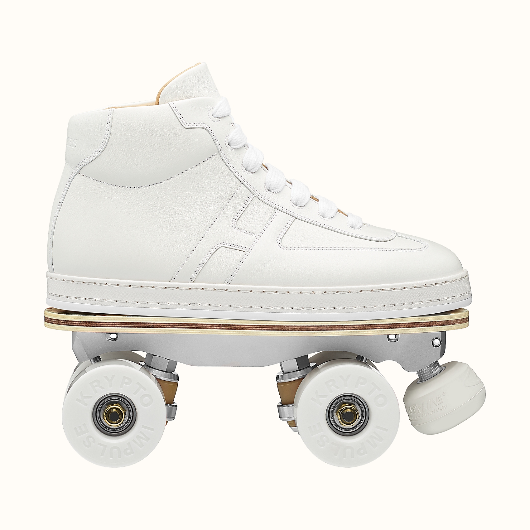 Кроссовки изготовлены из белой телячьей кожи. К подошве крепится платформа на роликах с дисками Krypto Impulse и металлической фурнитурой. Как сообщают в Hermès, эта универсальная пара обуви просто находка для прогулки по городу.