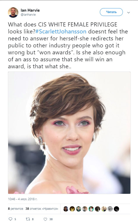 Тем не менее споры в интернете не утихают: одни продолжают настаивать на том, что актриса уже не первый раз “отбирает роли у представителей любого из существующих меньшинств”, намекая на исполнение Скарлетт Йоханссон роли японки-андроида в фильме “Призрак в доспехах”, другие же считают, что в выборе актрисы на эту роль нет ничего дискриминационного и плохого.