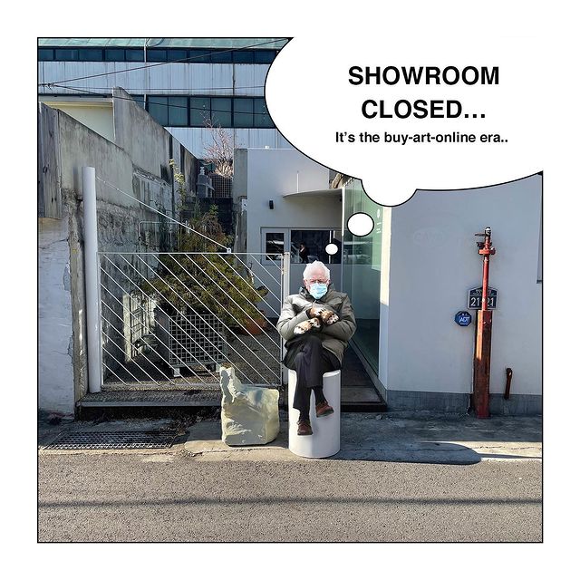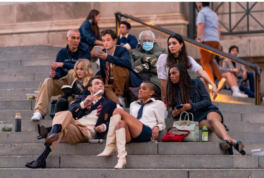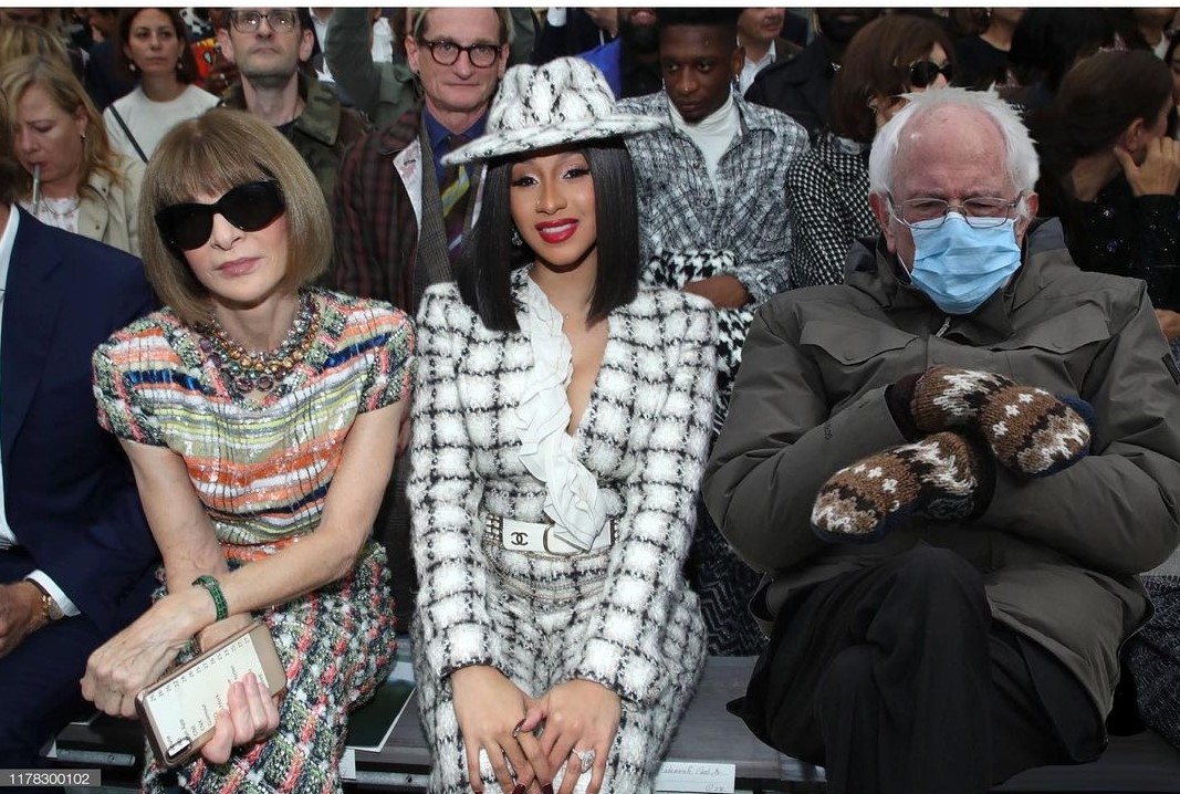 Вместо классического пальто Берни надел парку Burton GORE-TEX и спрятал руки в вязаные варежки. Конечно, его образ очень выделялся на фоне приглашенных гостей, которые явно не один день продумывали свои наряды.