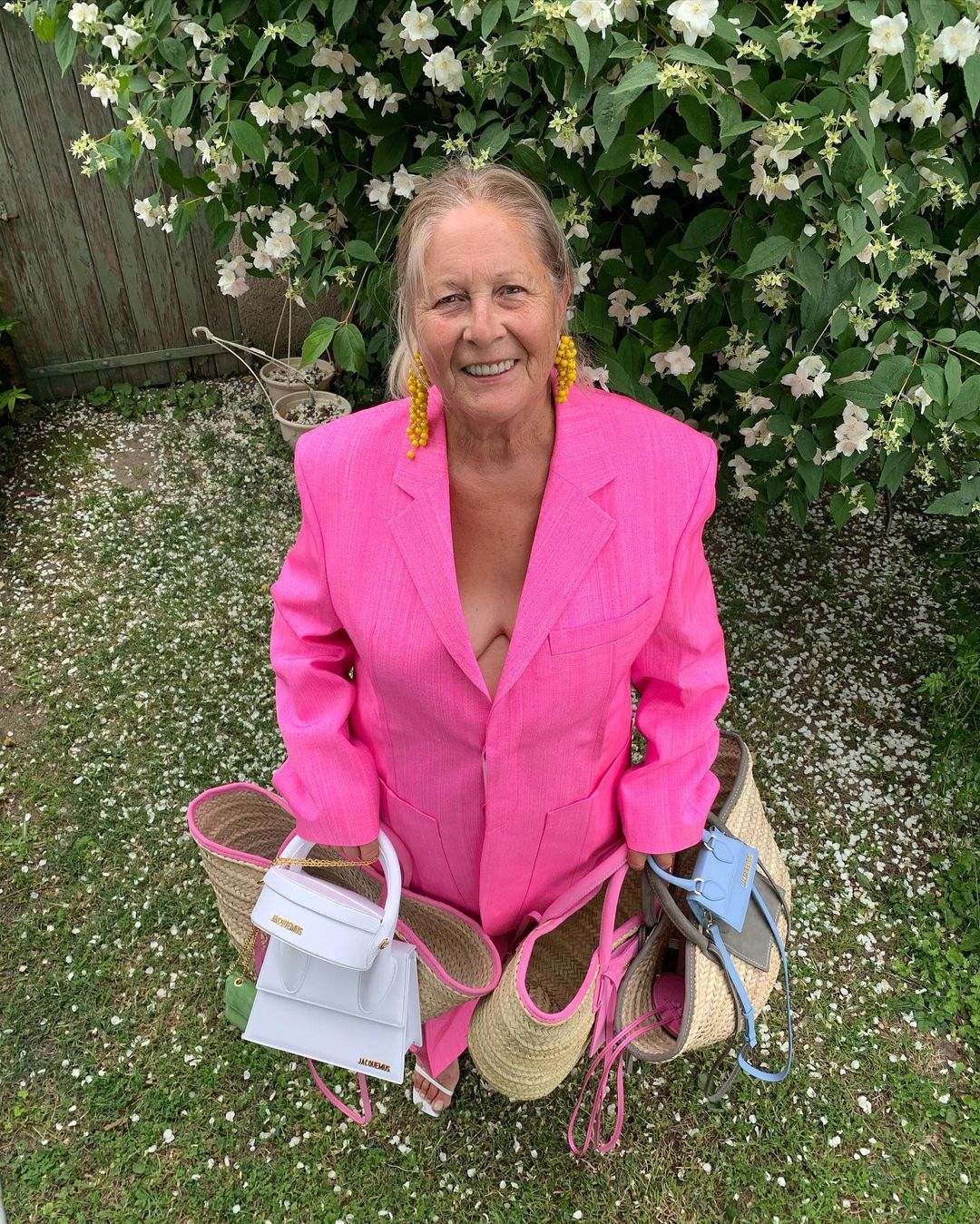 На фотографиях бабушка Симона позирует в прошлогодней летней коллекции Jacquemus: розовом и белом брючных костюмах из хлопка, а также в бледно-зеленом платье на тонких бретелях с глубоким декольте. Дополняла свои образы женщина культовыми сумками и шляпами модного дома.