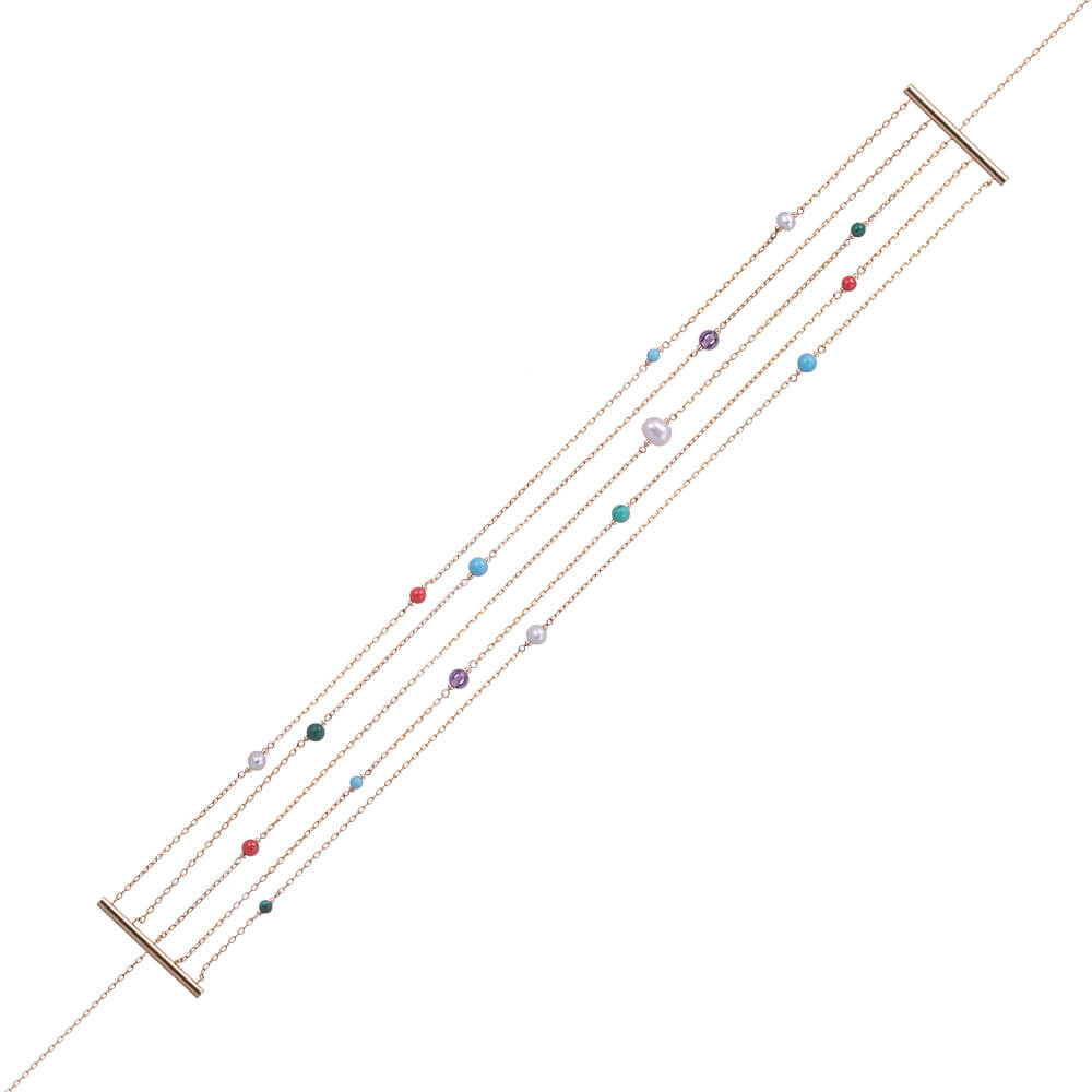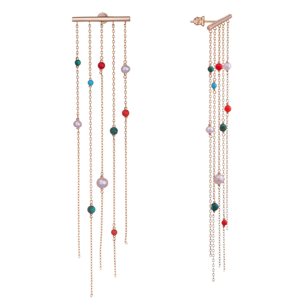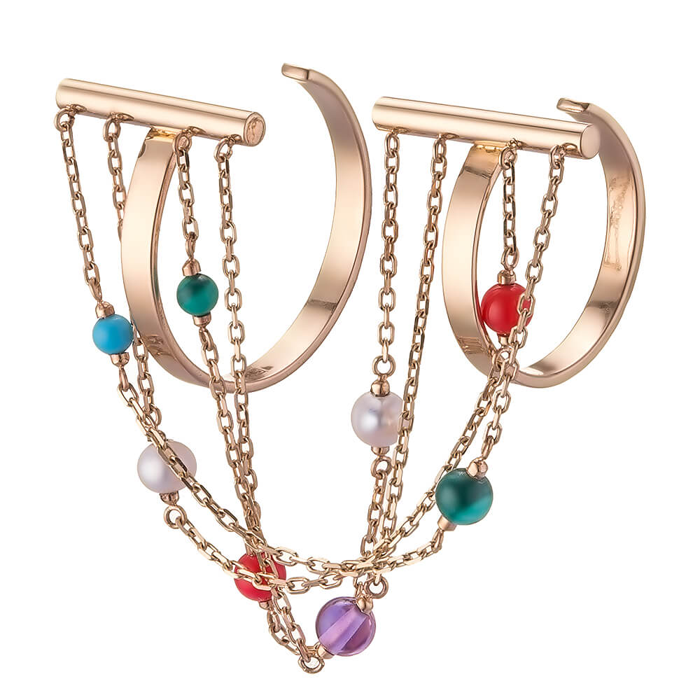 Массивные восточные серьги ювелиры SOVA интерпретировали в длинные серьги, дополненные цветочками и цветными бусинами. Для браслетов и колец бренд использует тонкие цепочки и разноцветные камни: бирюзу, коралл, аметист, оникс.