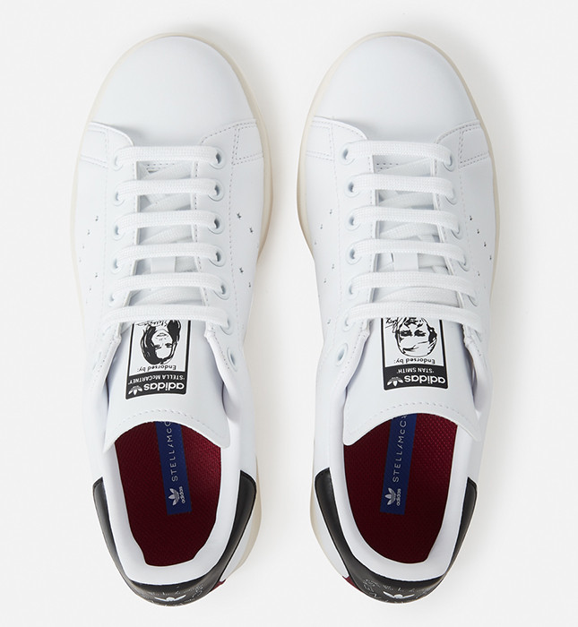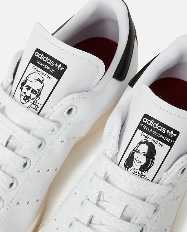 Кроссовки Stella Stan Smith визуально мало чем отличаются от хорошо всем известной модели, которая мелькает во всех стритстайл-отчетах всех сезонов без исключения. Вместо привычной зеленой пятки здесь вишнево-синяя вставка со штампом в виде логотипа Stella McCartney, а полоски по бокам кроссовок заменены миниатюрными отверстиями в виде звезд. Также на левом язычке изображен портрет самой Стеллы, а правый остался за Стэном Смитом.