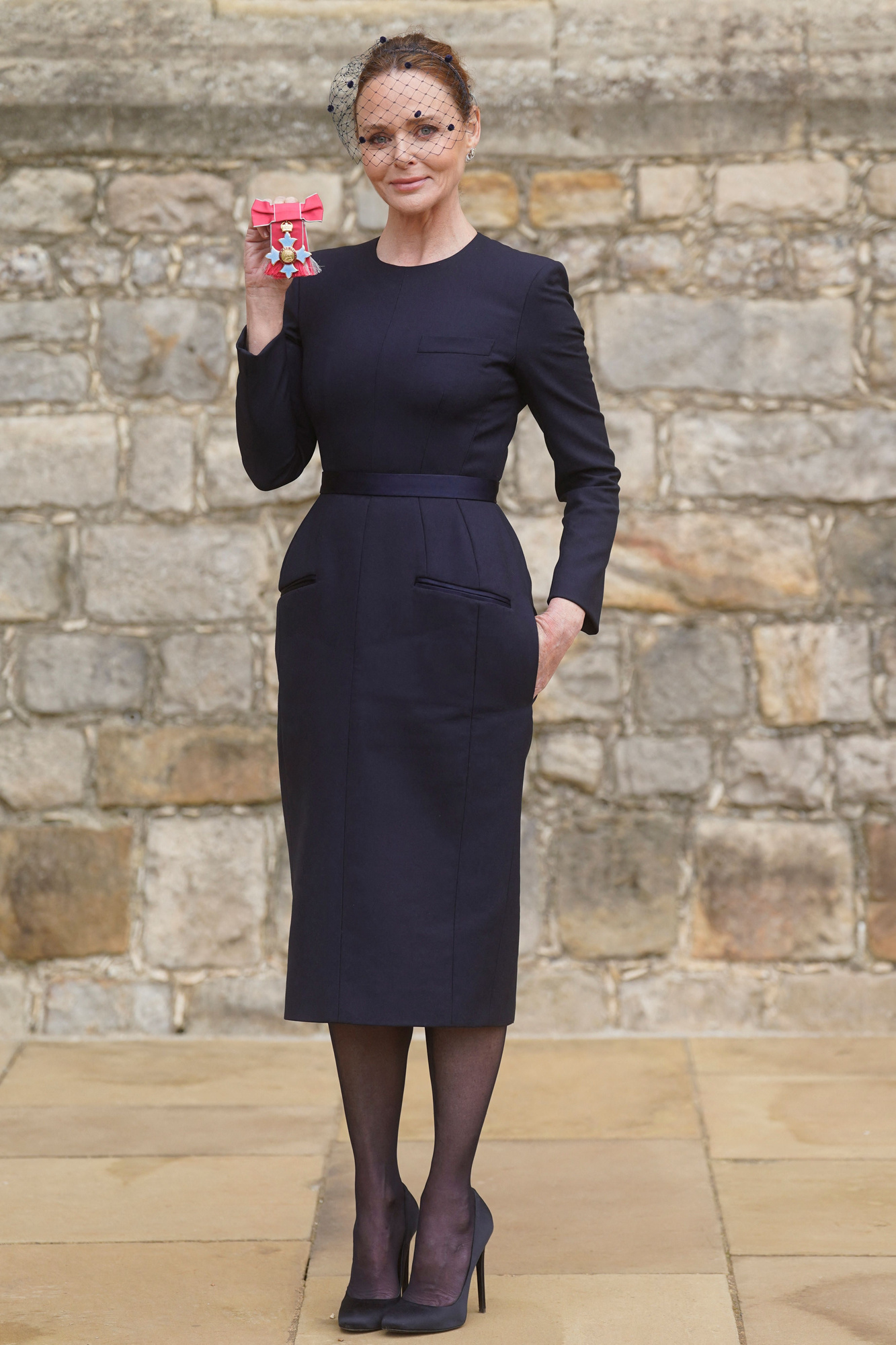 Стелла з’явилась на церемонію нагородження в темно-синій сукні, яку виготовили вручну в ательє. Її вбрання мало форму пісочного годинника та створене за екологічними стандартами — використана вовна, яка відповідає критеріям добробуту тварин. Образ дизайнерка доповнила синіми туфлями з архіву та клатчем. Згадані раніше елементи створені компанією Stella McCartney. Дизайнерка також обрала вуаль від бренду Emily-London Headwear, послугами якого користуються члени королівської родини.