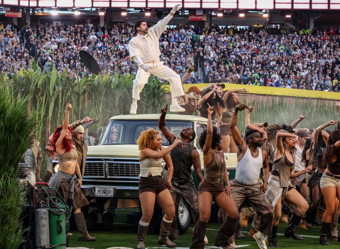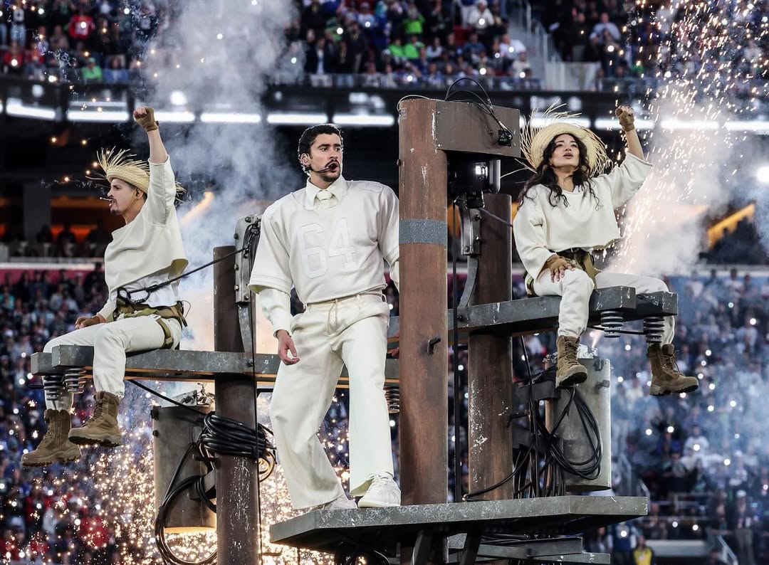 Хедлайнер шоу Bad Bunny з’явився на сцені в спортивному образі, який поєднував вуличну моду та елементи повсякденного стилю. Для виступу артист обрав одяг бренду Zara, доповнивши його кросівками BadBo 1.0, створеними у співпраці з Adidas.