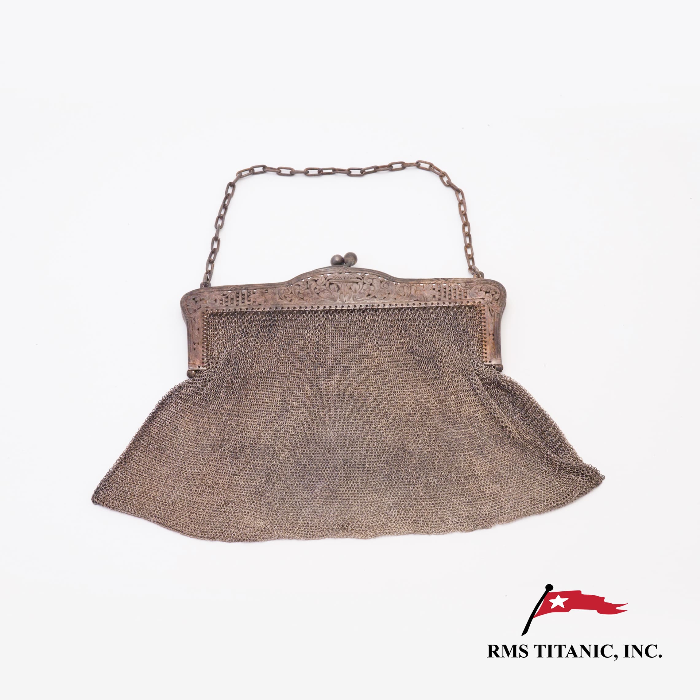 Срібна сітчаста сумка. Цю красиву сріблясту сумку з однотонної сітки, ймовірно, носили з вечірньою сукнею. Вона має ланцюжок овальної форми, а перфорований каркас – квітковий орнамент.