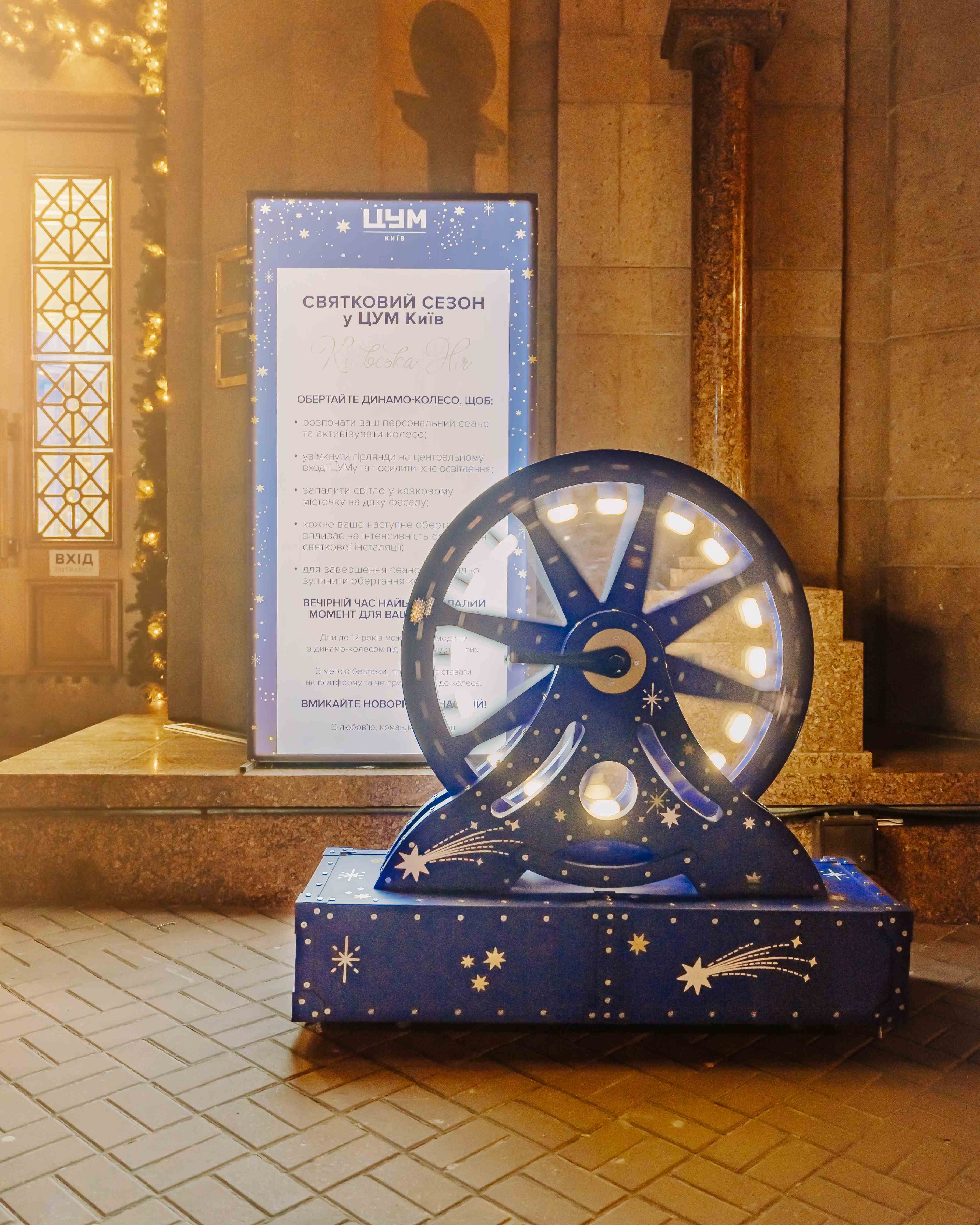 Щоб кожен з нас мав можливість хоча б на мить поринути у казкову атмосферу новорічного свята, біля центрального входу до ЦУМу встановлено інсталяцію динамо-колеса. ЦУМ запрошує кожного власноруч ввімкнути диво – прокрутивши колесо, запалити гірлянди й освітити декорації зимового містечка на вході до універмагу.
