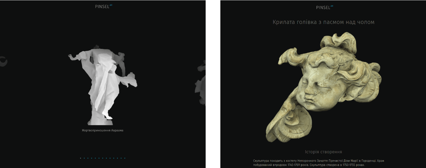 Львовская организация "Мистецька рада "Диалог" и образовательная онлайн-платформа WiseCow создали проект Pinsel.AR. Это инновационный проект, где работы украинского скульптора Иоганна Пинзеля представлены в виде трехмерных моделей.