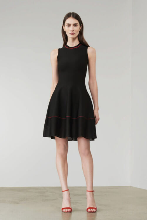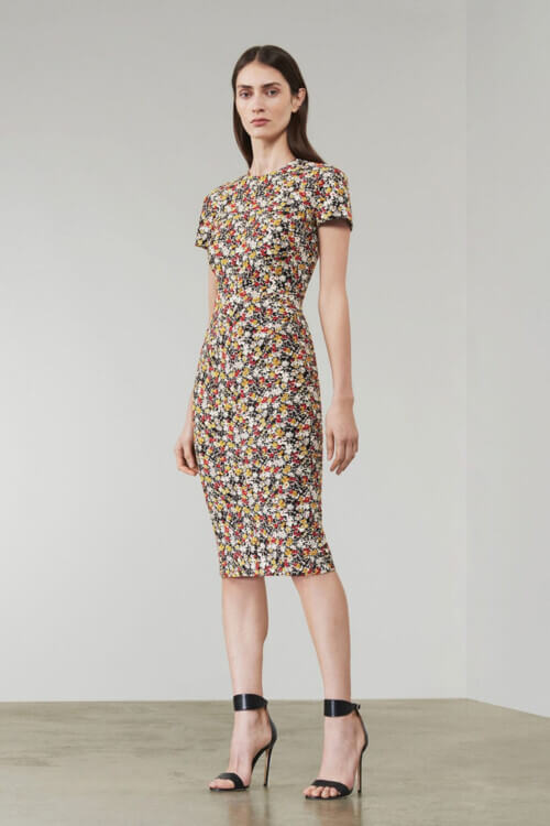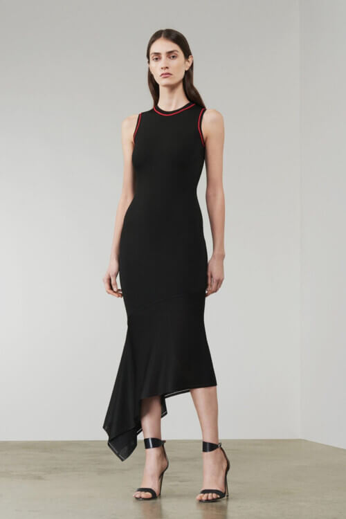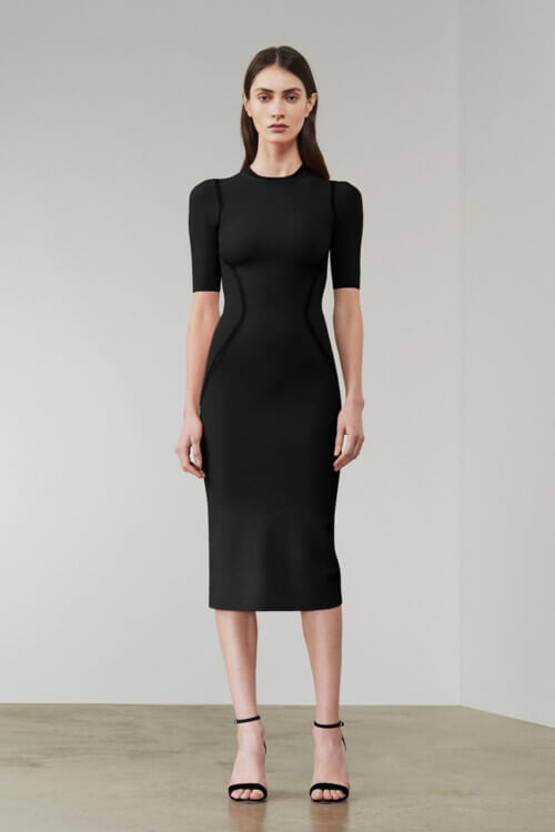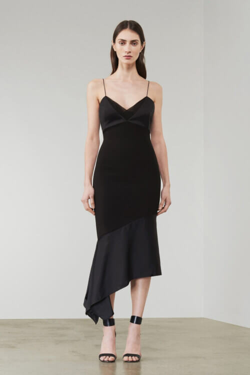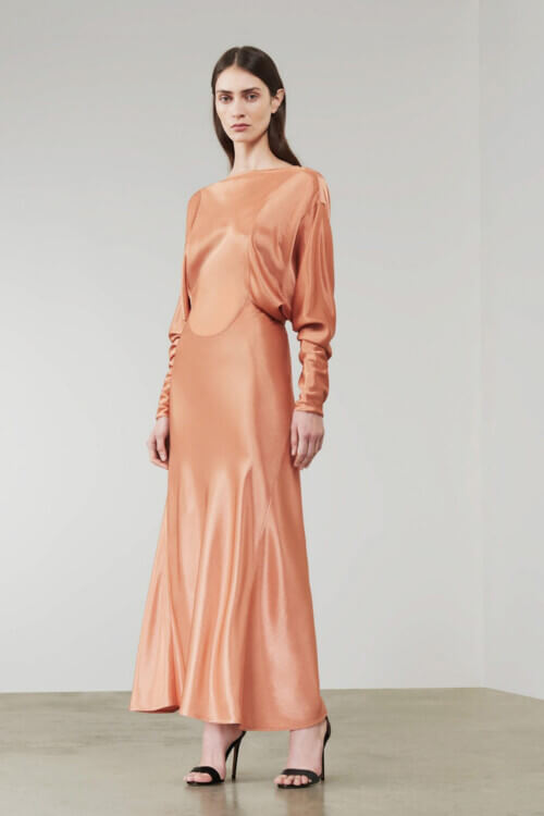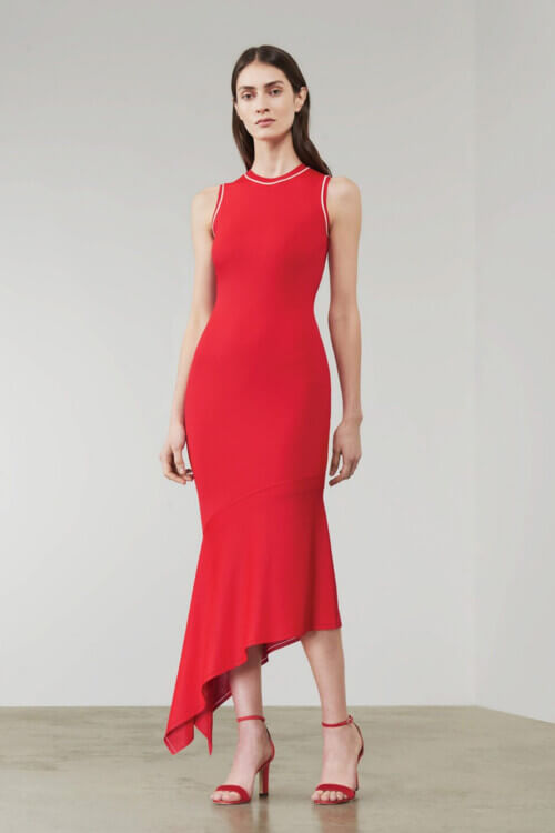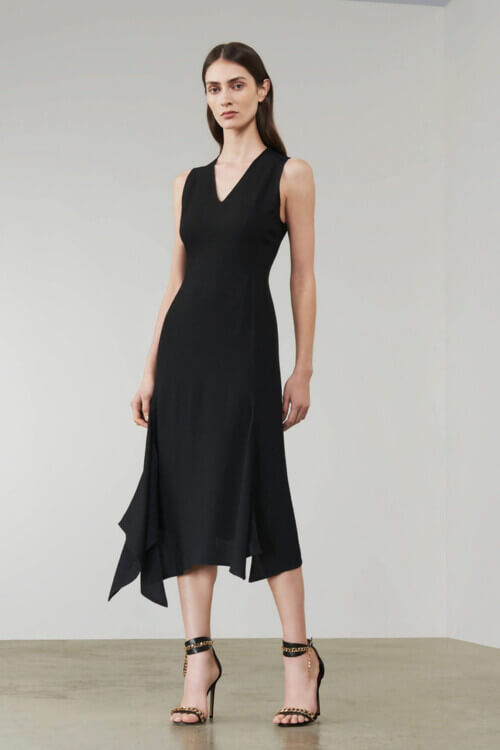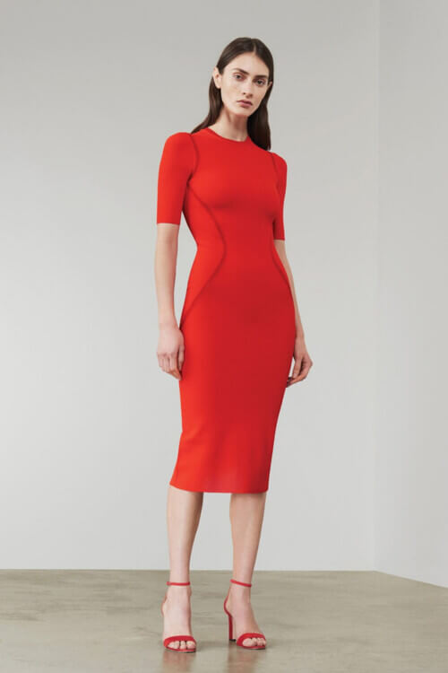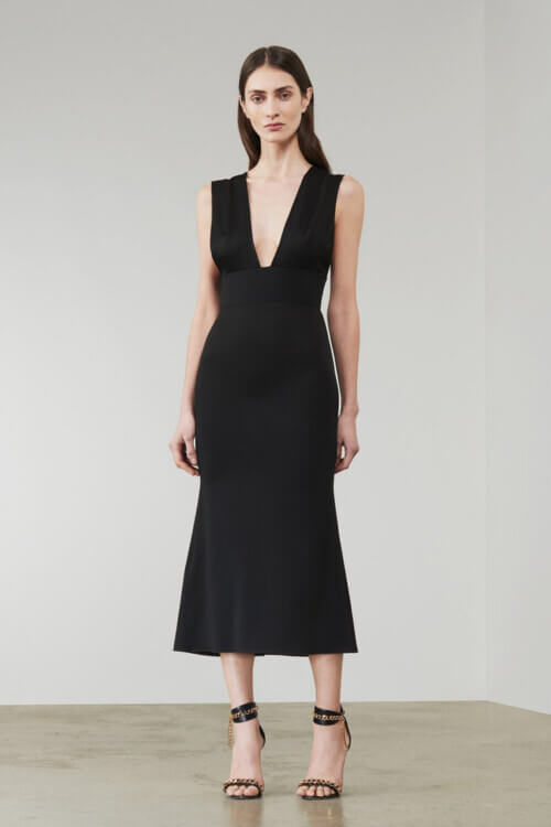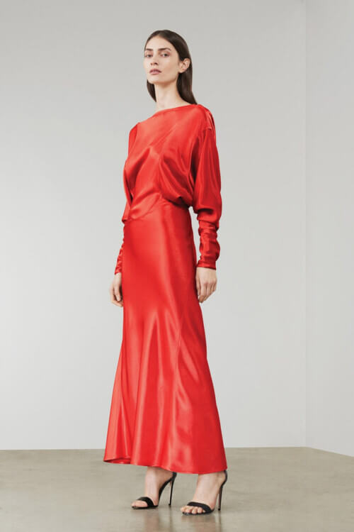 В нее вошли классические платья миди из прошлых сезонов, адаптированные под современные тренды: асимметричность, рюши, шелк и деконструкция. Цветовая палитра варьируется от светлых оттенков бежевого до черного и красного, а некоторые модели украшает жаккардовый принт в цветочек, вдохновленный стилем 70-х.