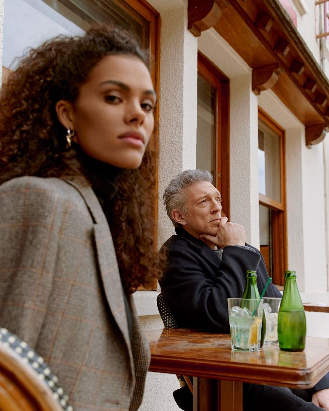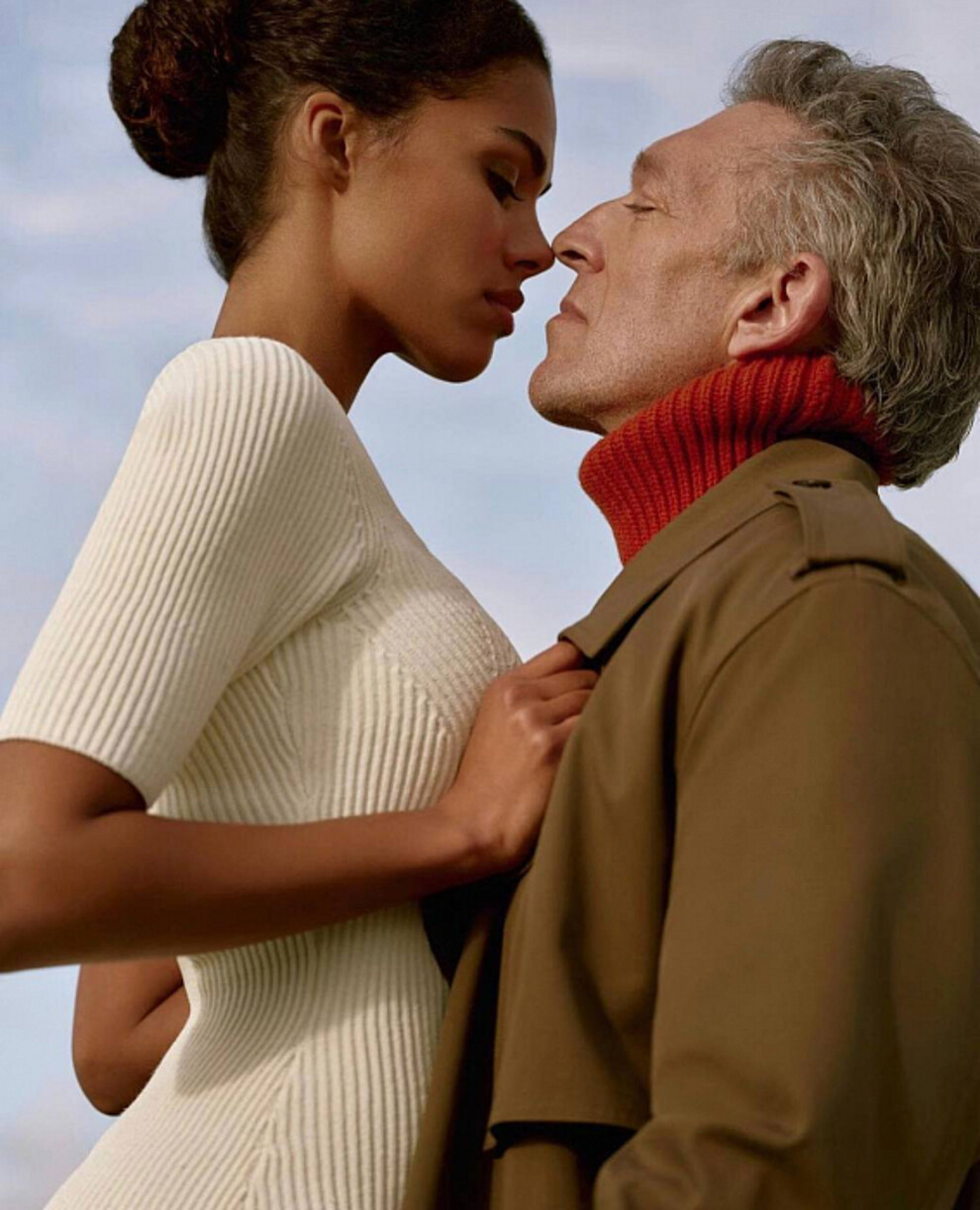 В кампейне Тина Кунаки была запечатлена в шерстяном костюме и классическом черном гольфе. Венсан примерил серый свитер, брюки и черное пальто.