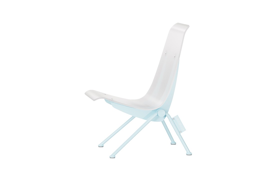 Вирджил Абло и швейцарская мебельная компания Vitra выпустили новую коллаборацию под названием Virgil Abloh c/o Vitra: US Edition. В капсульную коллекцию вошло 3 предмета интерьера в голубом цвете: керамический блок, а также ремейки кресла Antony архитектора Жана Пруве и лампы Petite Potence.