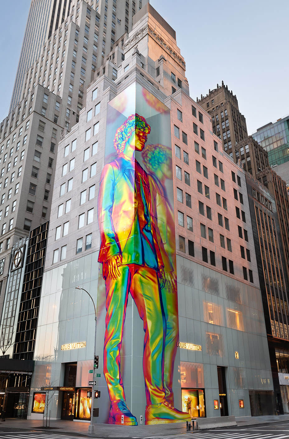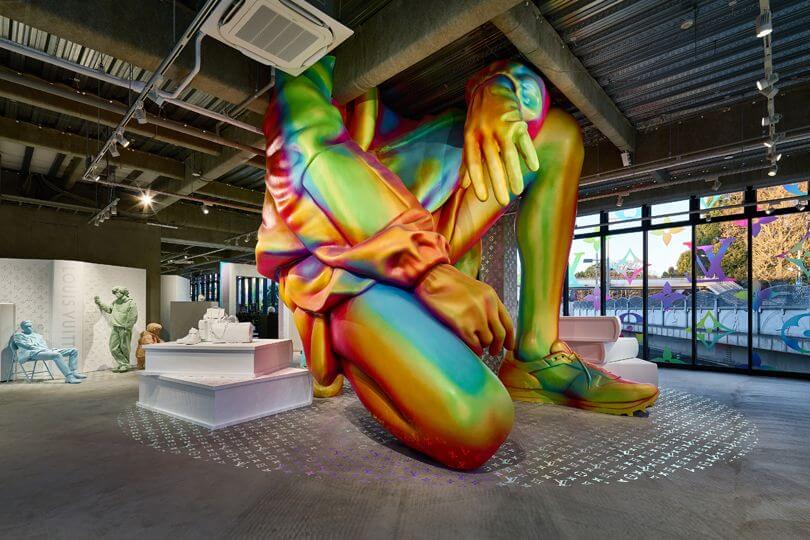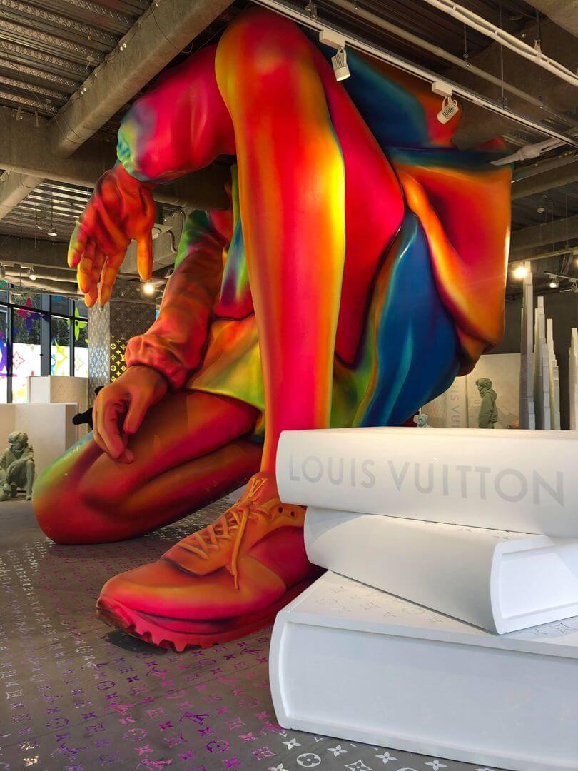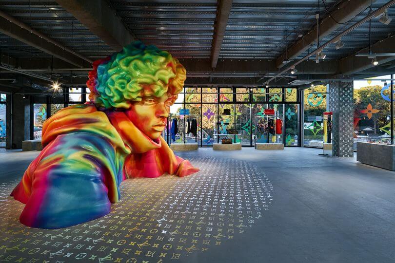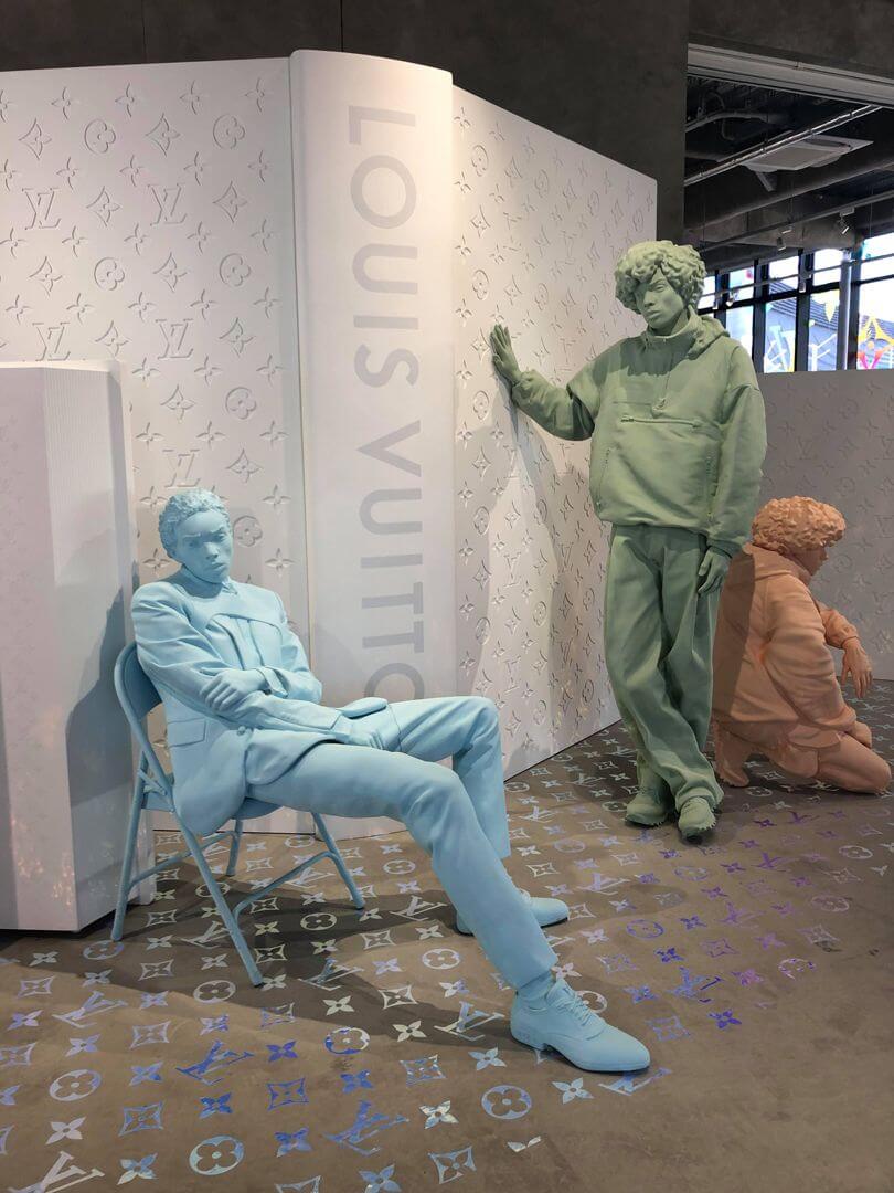Вместе с декоратором Фэй Маклеод креативный директор мужской линии Louis Vuitton Вирджил Абло создал инсталляции для магазинов бренда в Нью-Йорке и Токио. В честь поступления дебютной коллекции Абло для бренда магазин на Пятой авеню украсили оптической иллюзией с изображением модели во всю высоту 12-этажного здания. Разноцветный рисунок можно увидеть только с определенной точки, которую дизайнер сам обозначил крестом с помощью маркера. В магазине токийского квартала Харадзюку появилась 3D-версия той же модели: огромная разноцветная скульптура сидящего на корточках парня проходит через потолок первого этажа и заканчивается на втором.