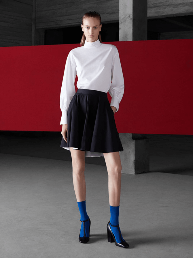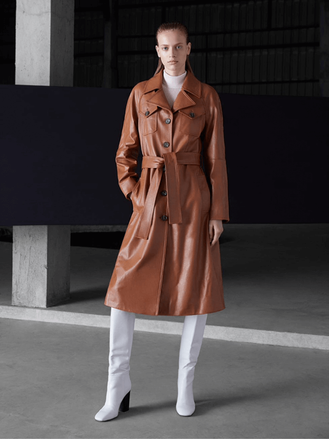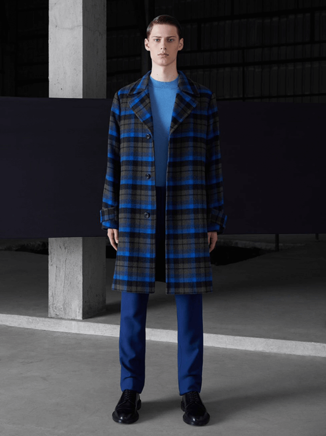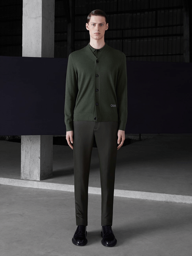 В коллекции есть мужские и женские вещи синих, рыжих и пастельных оттенков. Женская коллекция представляет несколько видов верхней одежды: от кожаного тренча до черной кофты-бомбера, сдержанные туфли на каблуке и высокие грубые сапоги. Calvin Klein также показывают, как этой осенью носить плиссированные юбки и трикотажные платья.