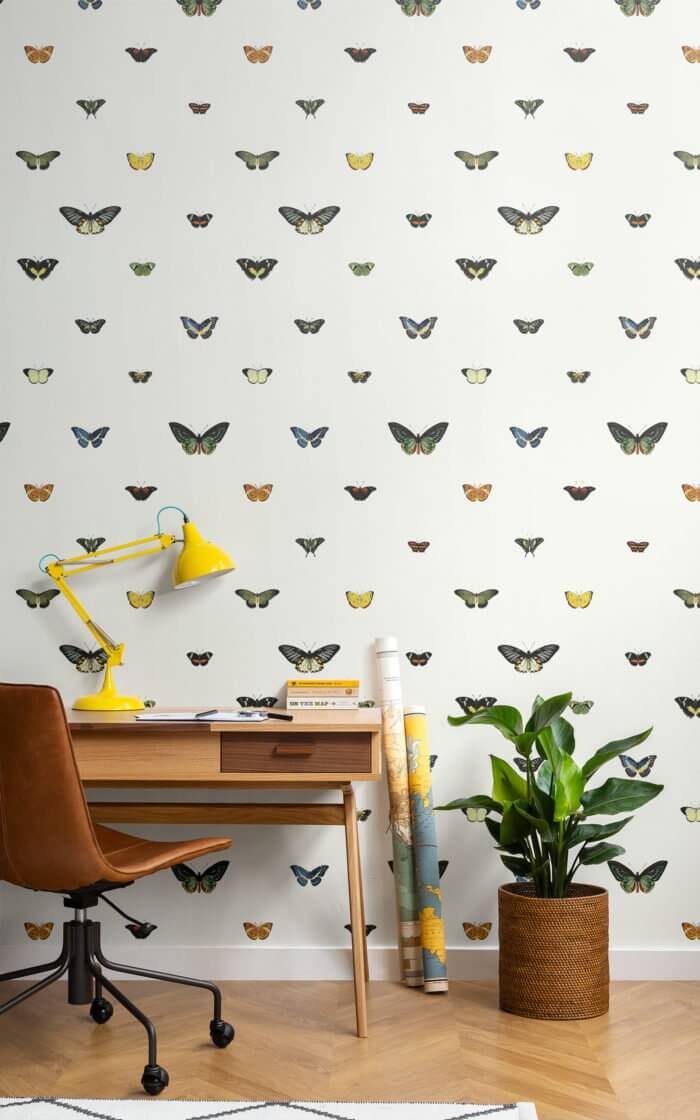 Декоративные обои созданы в смешении стилей ар-деко и максимализма — узнаваемой эстетике режиссера. Симметричные бабочки отсылают к винтажной эстетике, любопытству и открытиям в фильме “Королевство полной Луны”. Розовые панели под дерево вдохновлены интерьерами отеля "Гранд-Будапешт" и стилистикой ар-деко, а любимый миллениалами цвет дает им новое прочтение. Оранжевые тигры с зелеными пальмовыми листьями отсылают к красному поддону “Семейки Тененбаум”. Тропический дизайн и тигров, сливающихся с фоном обоев, кажется, наклеил бы и сам режиссер в своей гостиной.