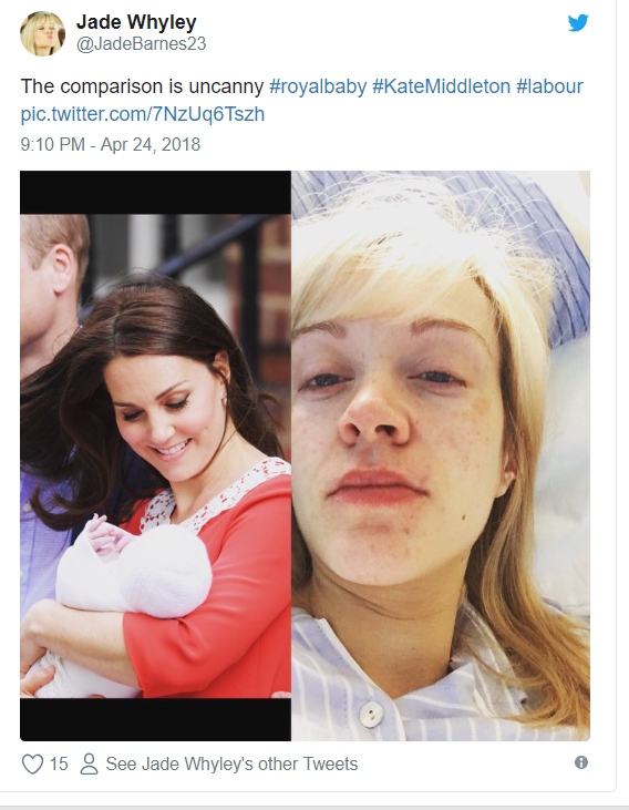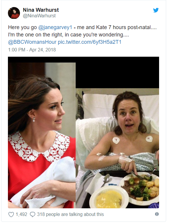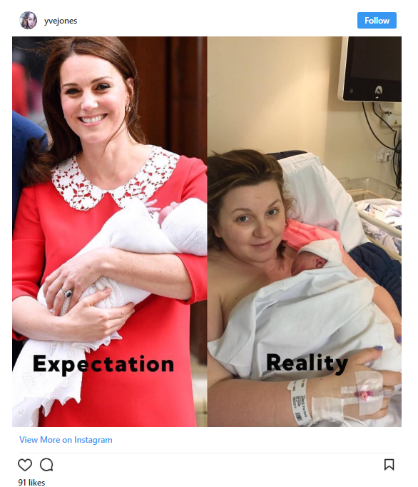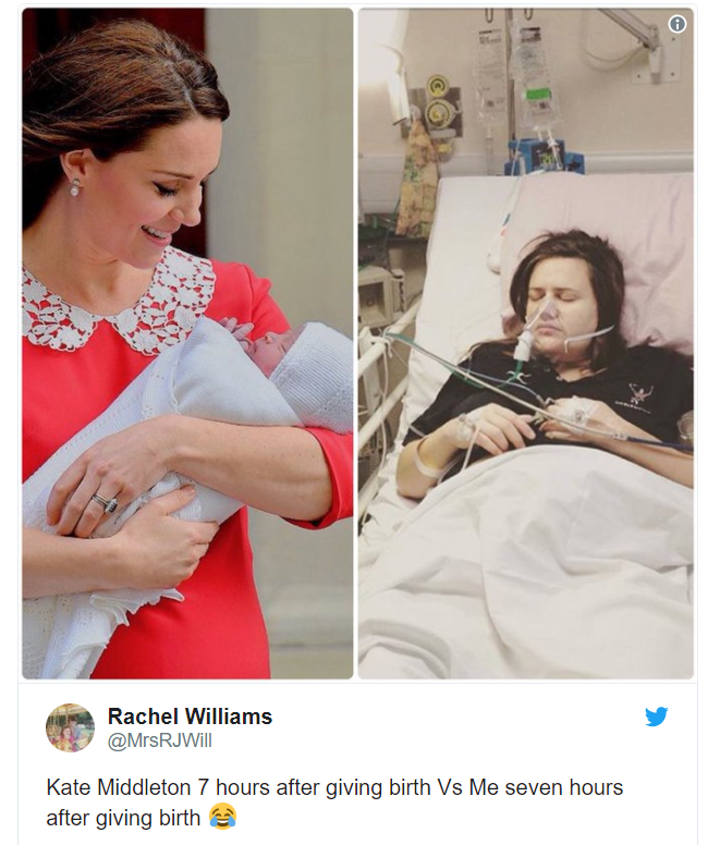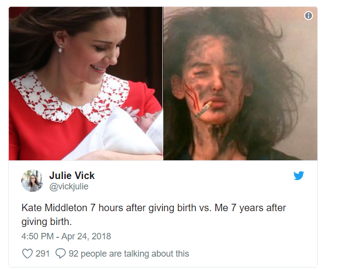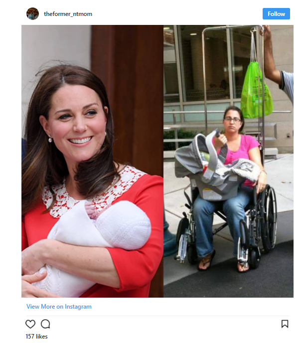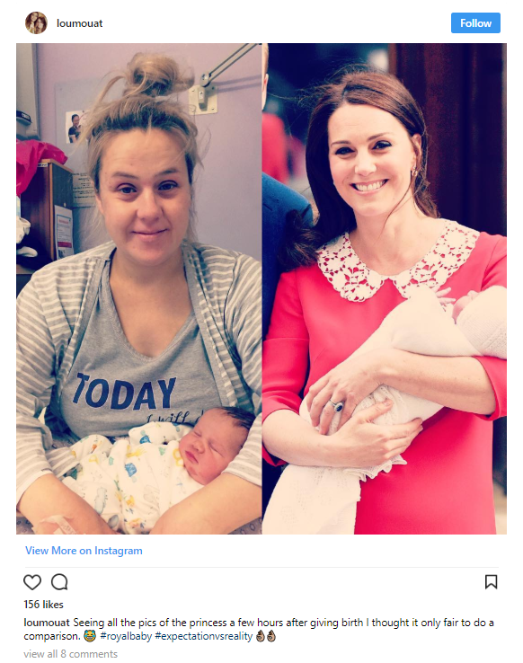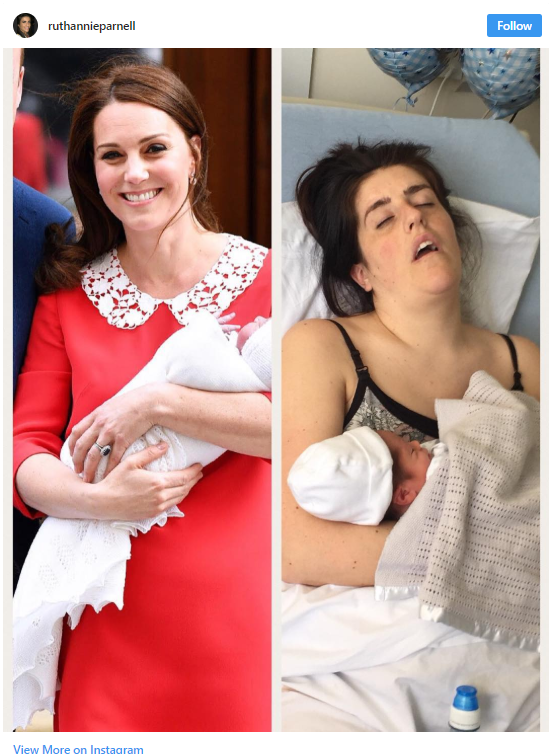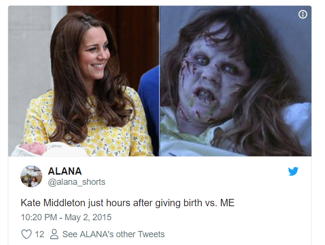 Через пару дней мамочки в инстаграме и твиттере задались вопросом: "Почему Кейт Миддлтон выглядит так хорошо, хотя она родила всего 7 часов назад?" – и стали сравнивать свои фотографии с фотографиями герцогини Кембриджской. Вышло очень смешно.