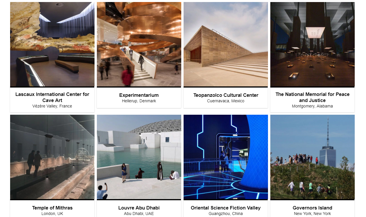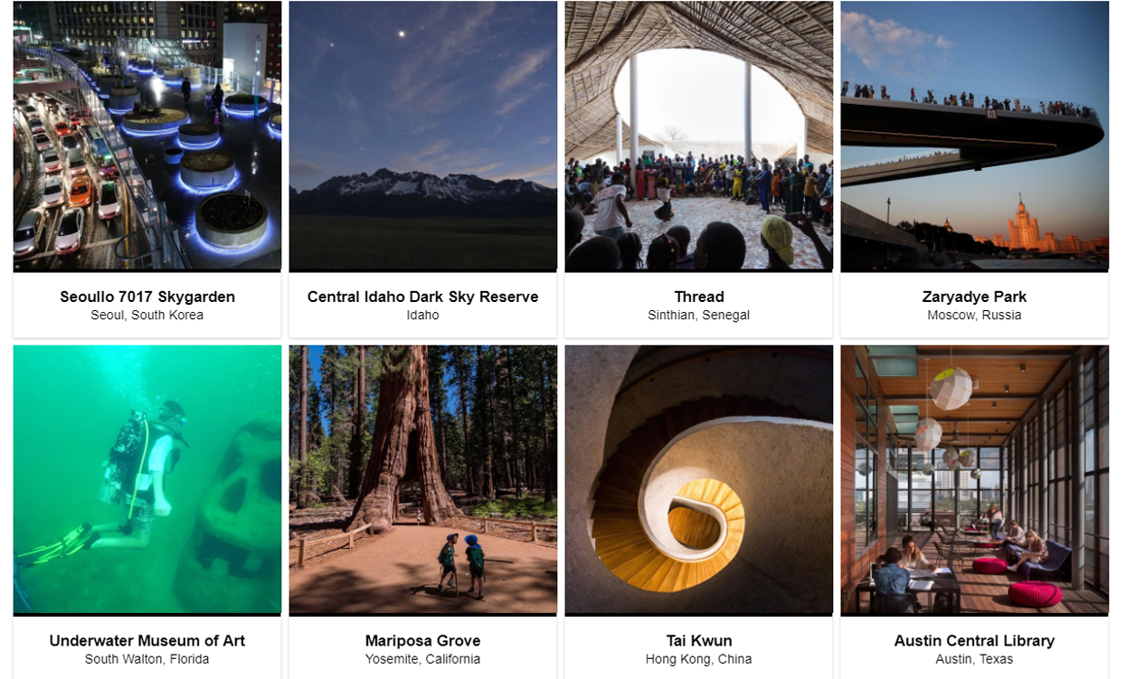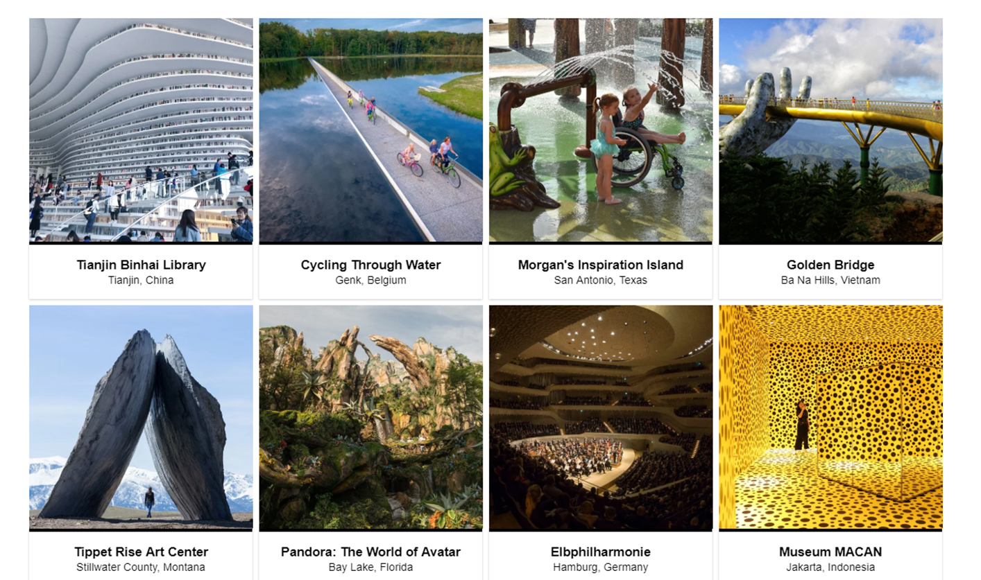 В первую категорию вошла библиотека Тяньцзинь Бинхай в Китае, Золотой мост во Вьетнаме и Эльбская филармония в Германии, во вторую — усадьба с жирафами в Кении, отели Viceroy Los Cabos в Мексике и Alila Fort Bishangarh в Индии, а в третью — Atlas Bar в Сингапуре, рестораны Tsuta в Японии и Dandelyan в Великобритании. Полный список мест можно посмотреть на сайте.