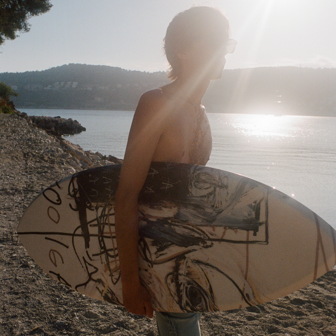 Вместе с фондом художника и галереей Энрико Наварры бренд также создал совместную капсульную коллекцию. В коллаборацию вошли аксессуары, летние сумки, футболки и даже доска для серфинга с принтами работ Баскии.