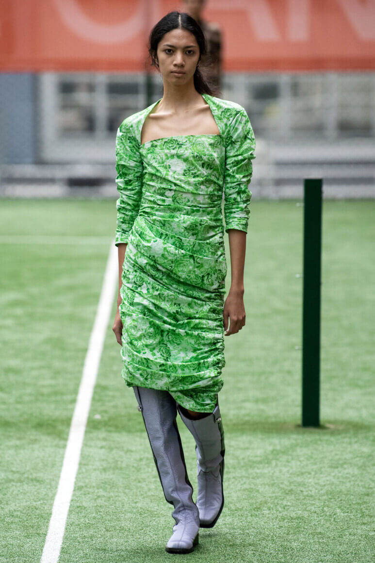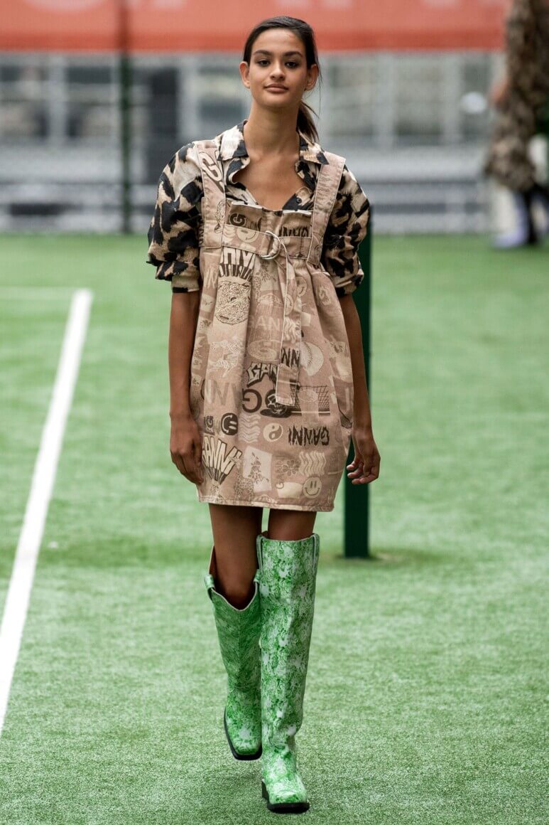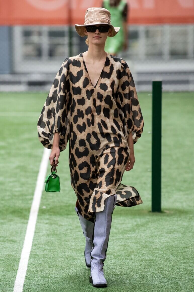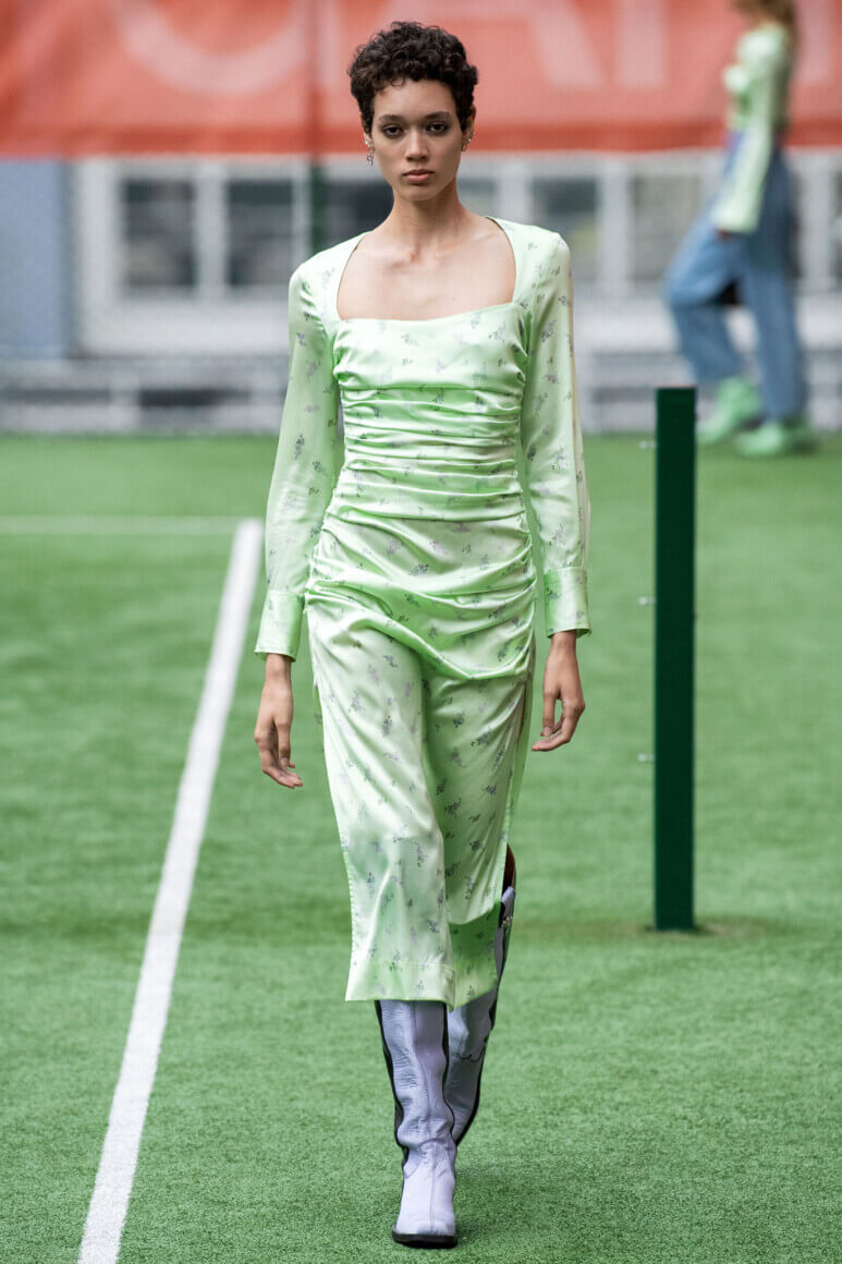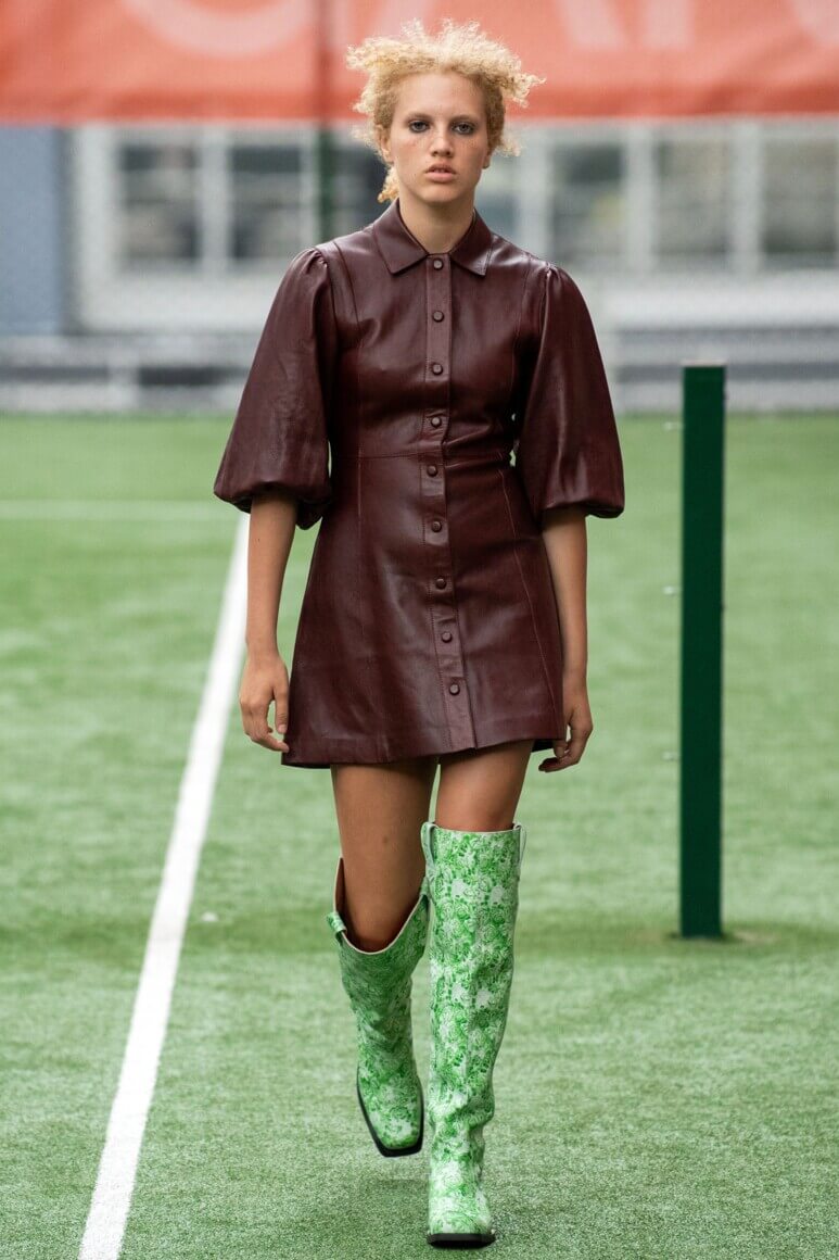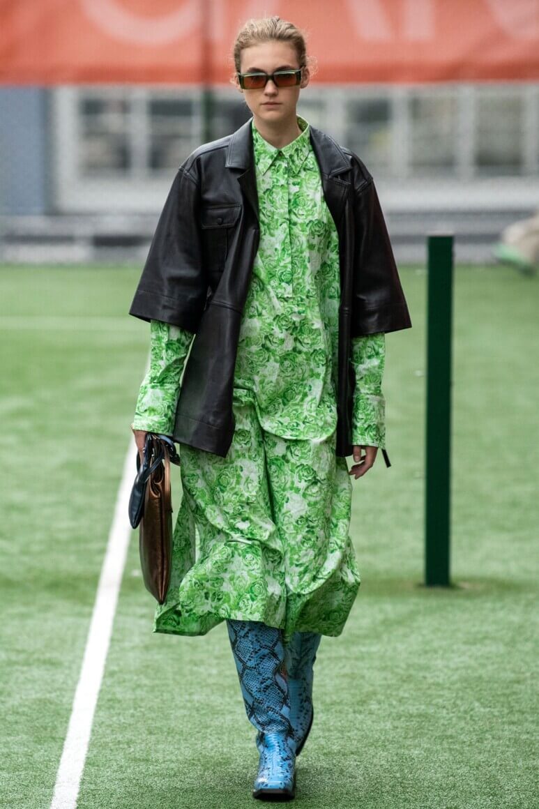 Показ прошел на спортивной площадке — в том же месте, что и 10 лет назад. В нее вошли силуэты, за которые мы так полюбили обновленный Ganni: “папины” джинсы, шелковые платья с цветочным принтом, вязаные кардиганы и леопардовый принт. Узкие прямоугольные очки, неон и латексная кожа добавили происходящему немного вечеринки, которую продолжила датская певица MØ под звуки северного ливня. Инсайдеры поговаривают, что именно Ganni вернул Копенгаген на модную карту мира, так что два дня рождения бренд по праву заслужил.