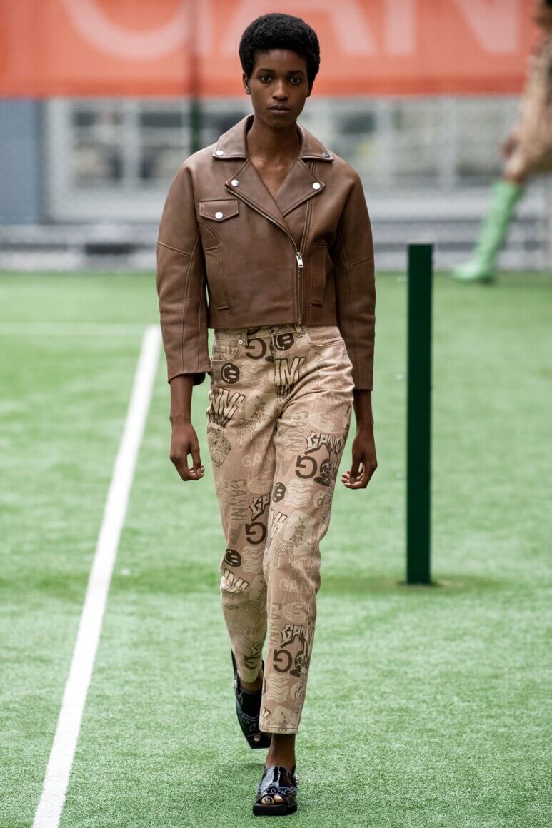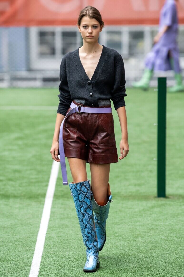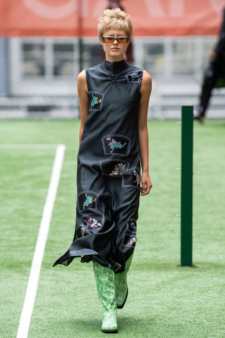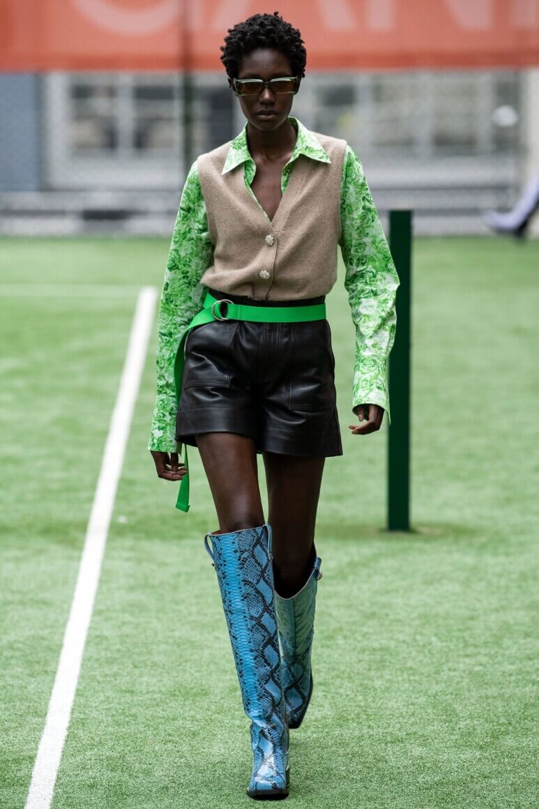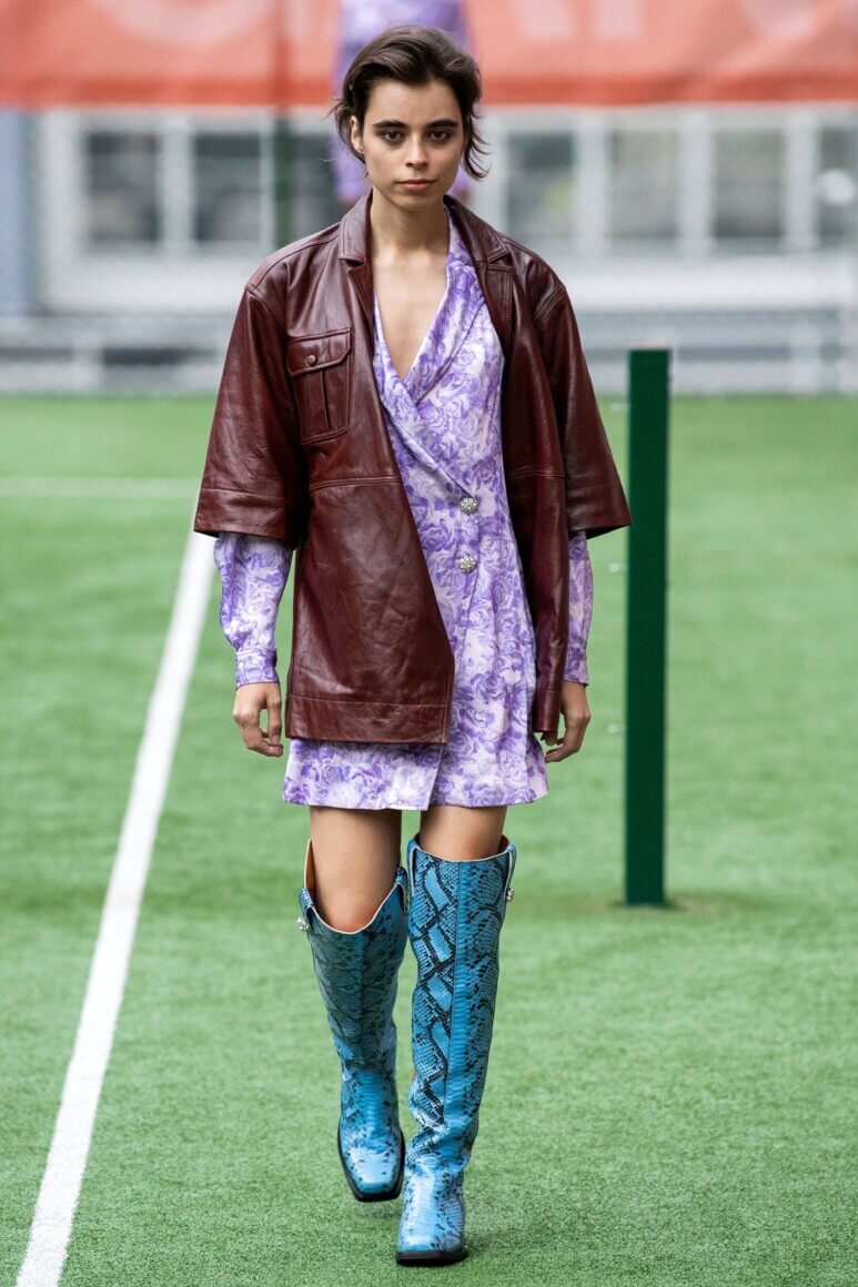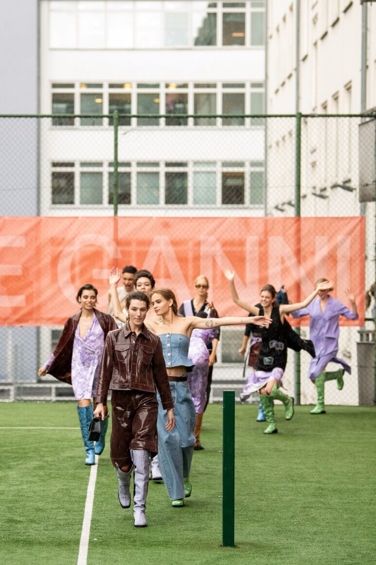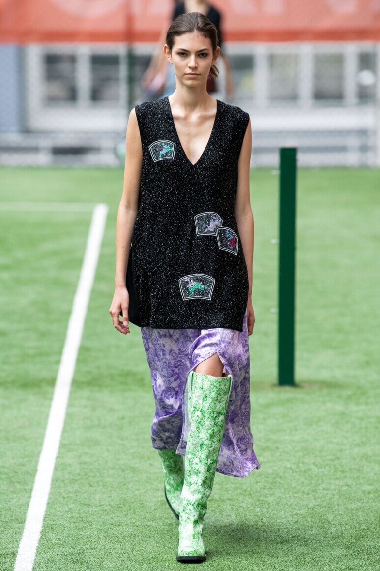 Показ прошел на спортивной площадке — в том же месте, что и 10 лет назад. В нее вошли силуэты, за которые мы так полюбили обновленный Ganni: “папины” джинсы, шелковые платья с цветочным принтом, вязаные кардиганы и леопардовый принт. Узкие прямоугольные очки, неон и латексная кожа добавили происходящему немного вечеринки, которую продолжила датская певица MØ под звуки северного ливня. Инсайдеры поговаривают, что именно Ganni вернул Копенгаген на модную карту мира, так что два дня рождения бренд по праву заслужил.