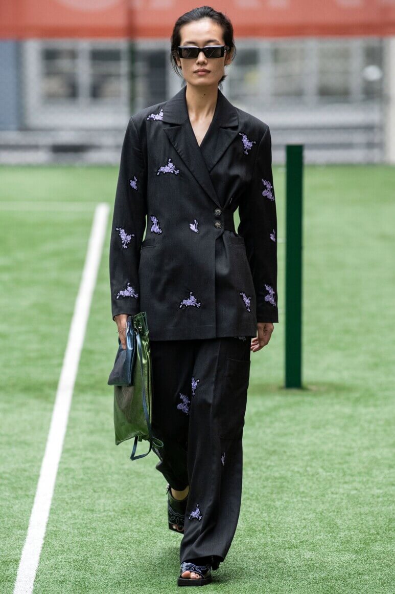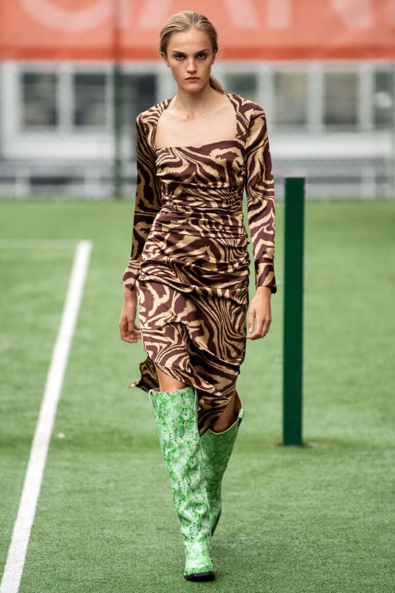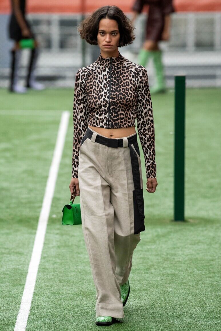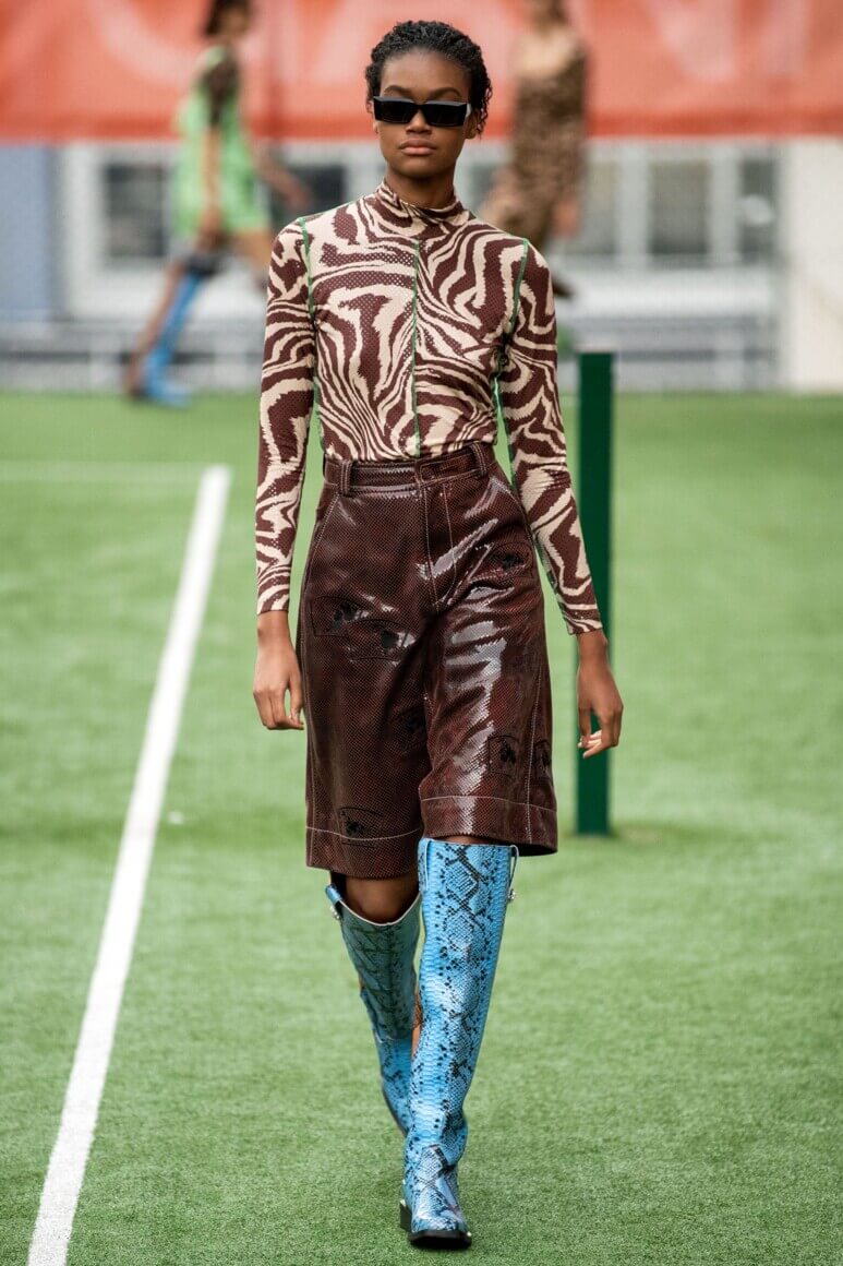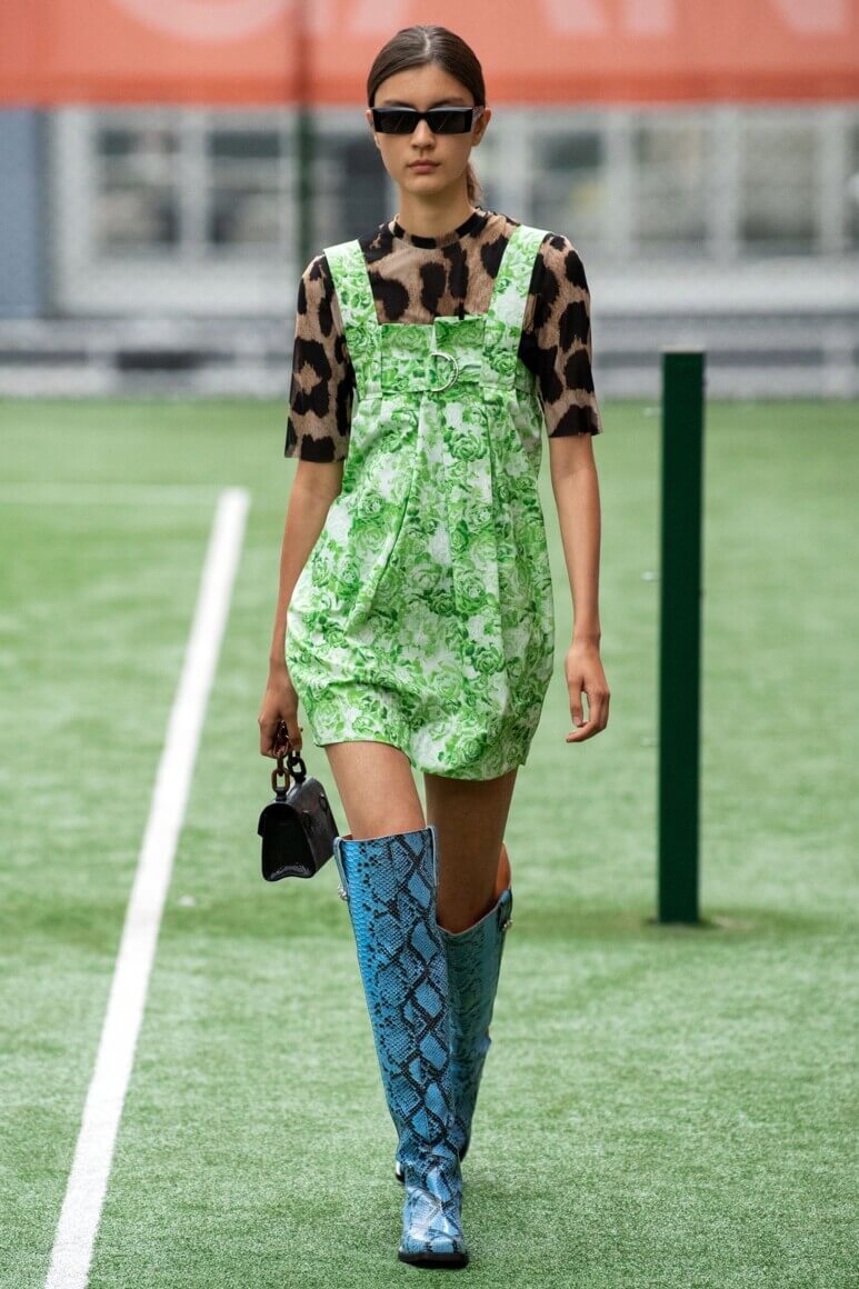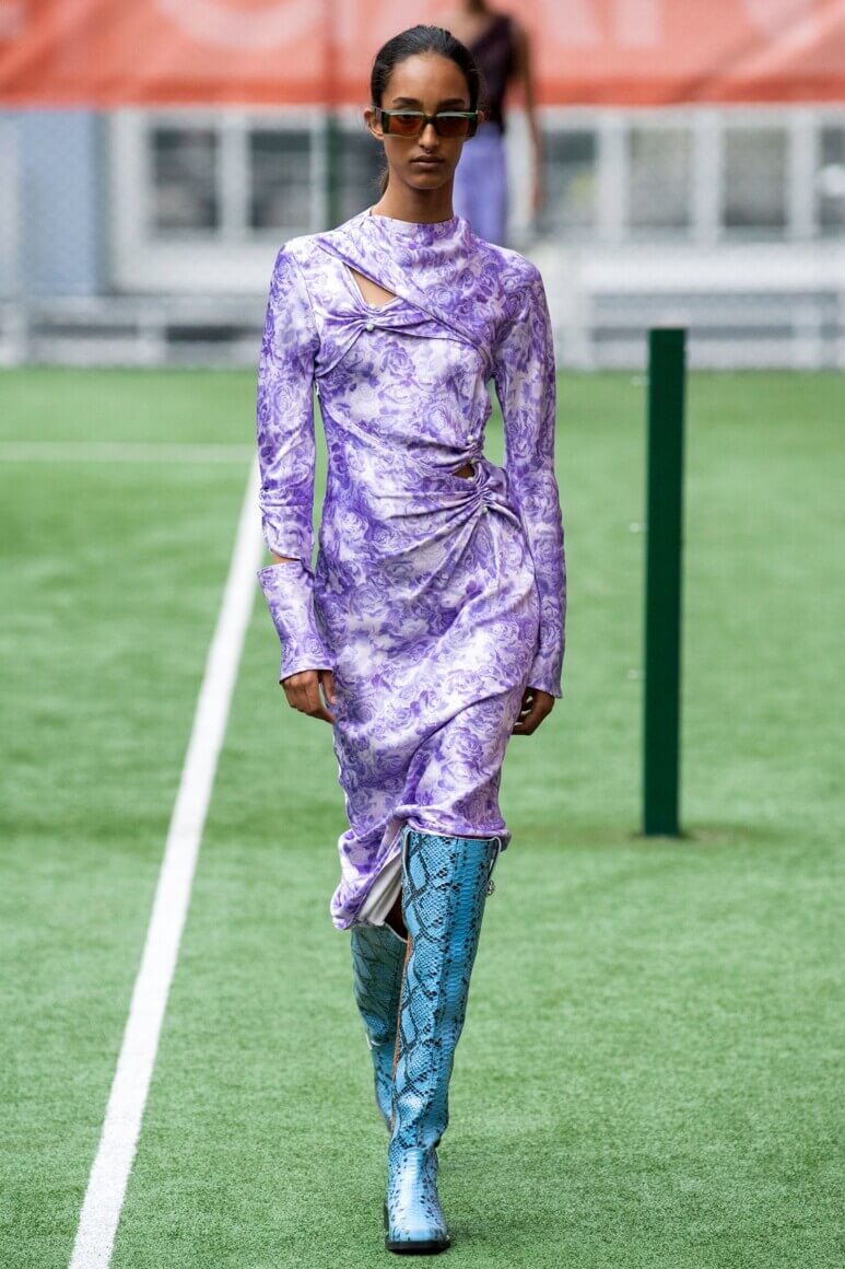 Показ прошел на спортивной площадке — в том же месте, что и 10 лет назад. В нее вошли силуэты, за которые мы так полюбили обновленный Ganni: “папины” джинсы, шелковые платья с цветочным принтом, вязаные кардиганы и леопардовый принт. Узкие прямоугольные очки, неон и латексная кожа добавили происходящему немного вечеринки, которую продолжила датская певица MØ под звуки северного ливня. Инсайдеры поговаривают, что именно Ganni вернул Копенгаген на модную карту мира, так что два дня рождения бренд по праву заслужил.