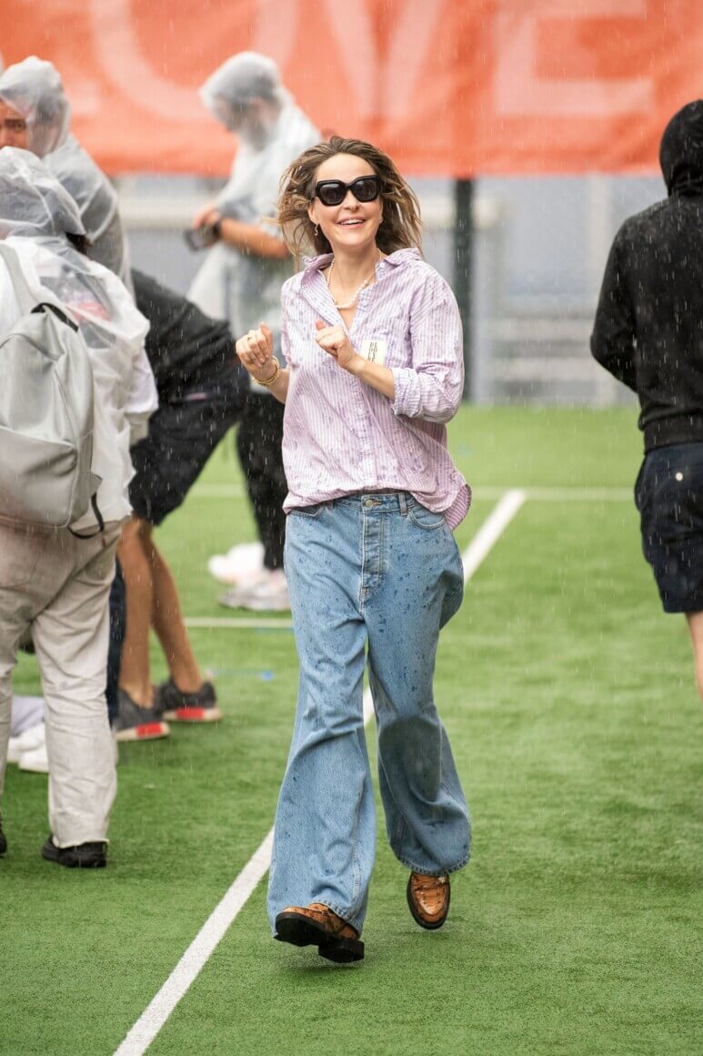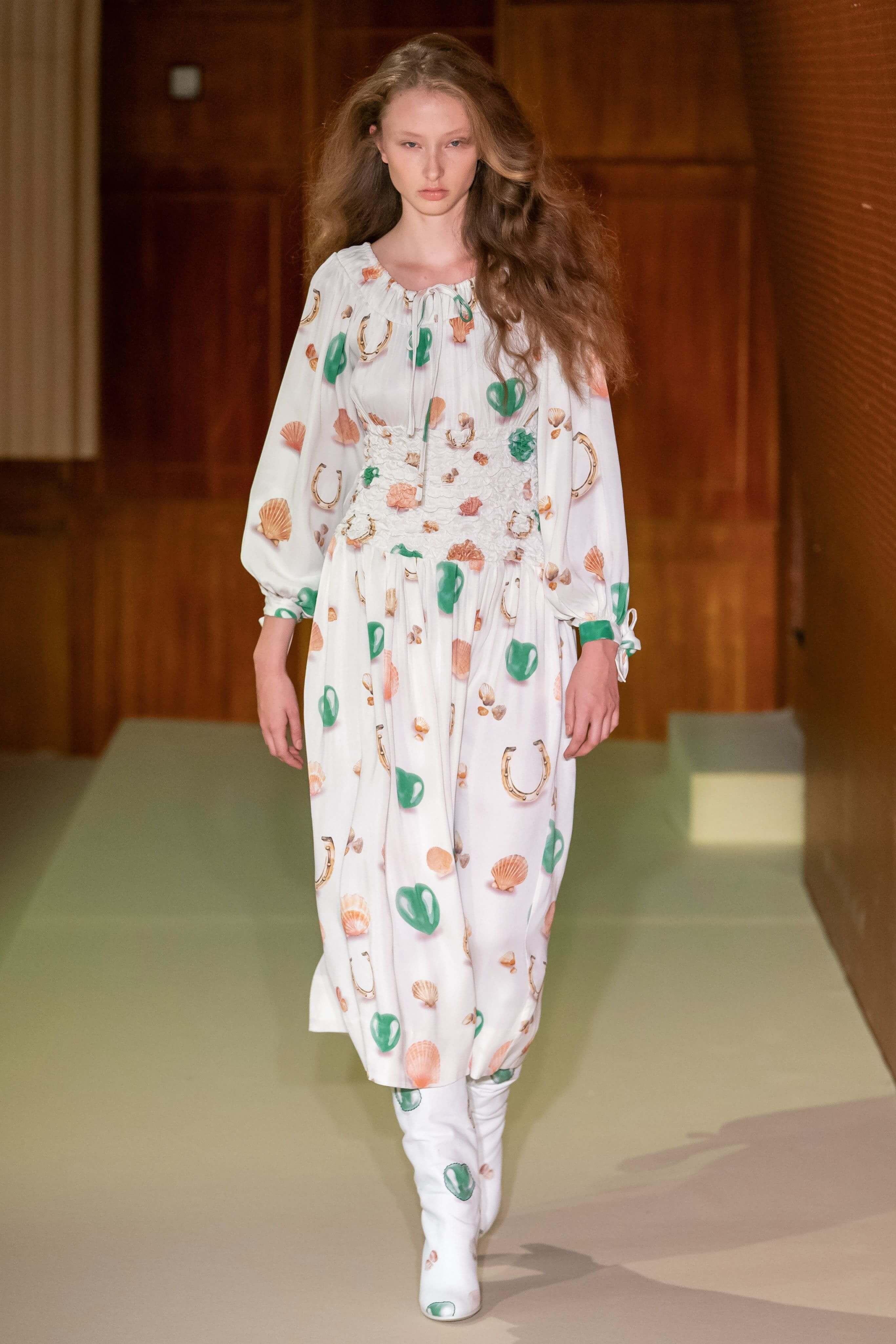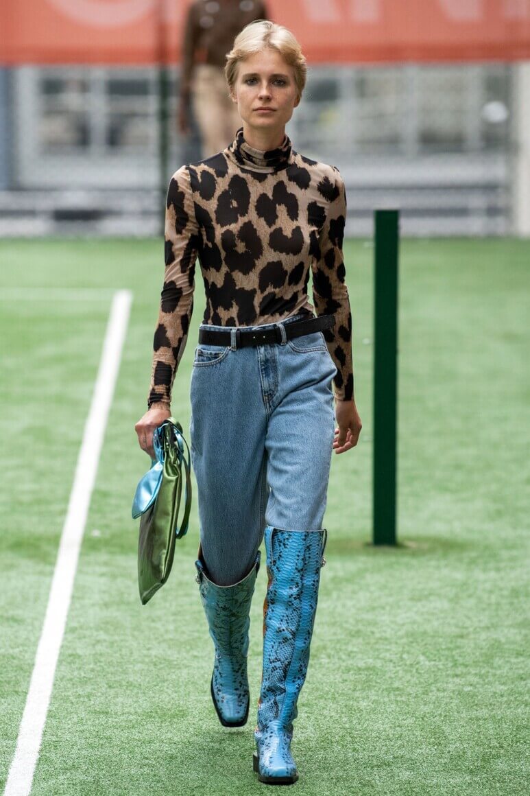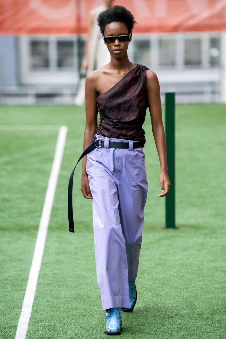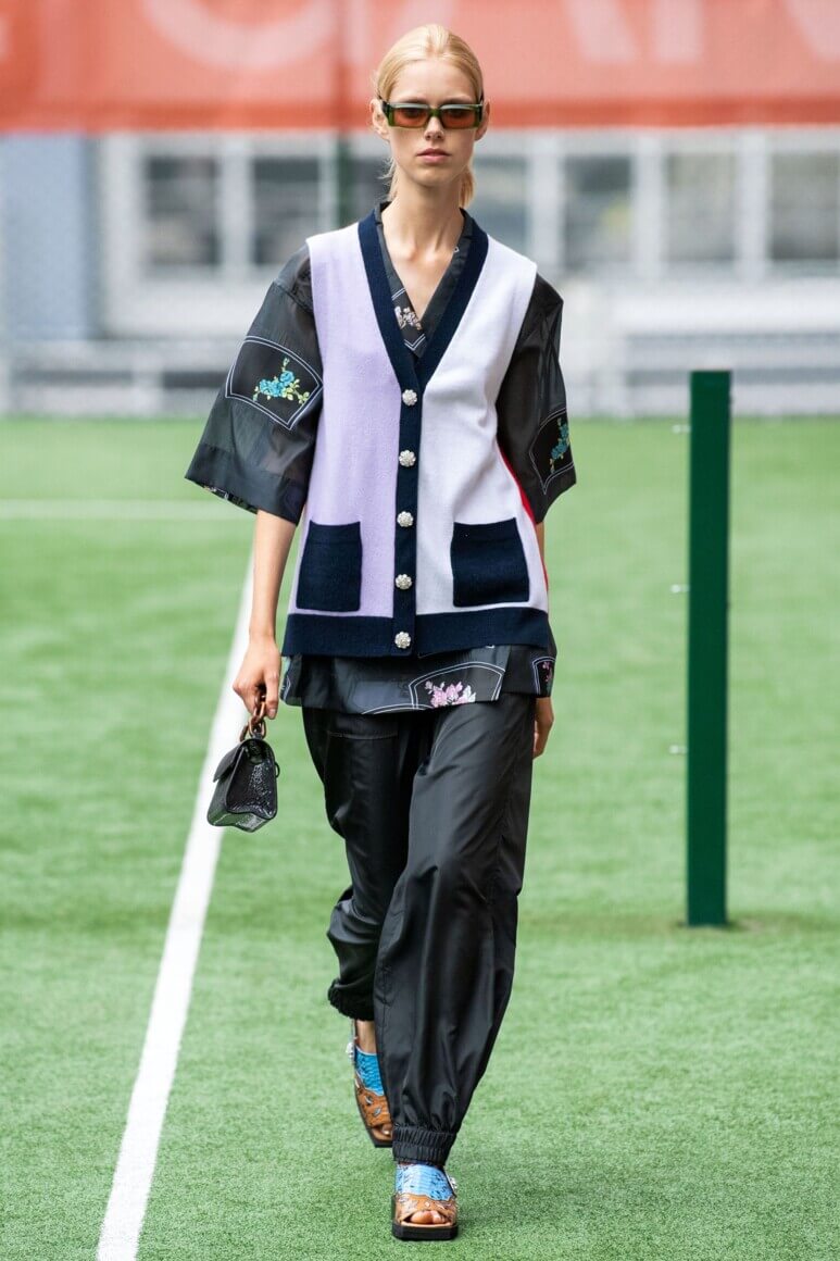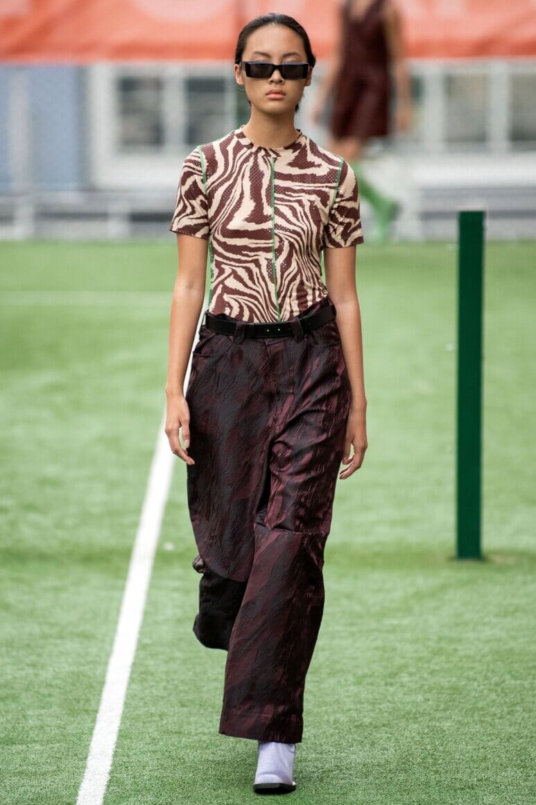 Показ прошел на спортивной площадке — в том же месте, что и 10 лет назад. В нее вошли силуэты, за которые мы так полюбили обновленный Ganni: “папины” джинсы, шелковые платья с цветочным принтом, вязаные кардиганы и леопардовый принт. Узкие прямоугольные очки, неон и латексная кожа добавили происходящему немного вечеринки, которую продолжила датская певица MØ под звуки северного ливня. Инсайдеры поговаривают, что именно Ganni вернул Копенгаген на модную карту мира, так что два дня рождения бренд по праву заслужил.