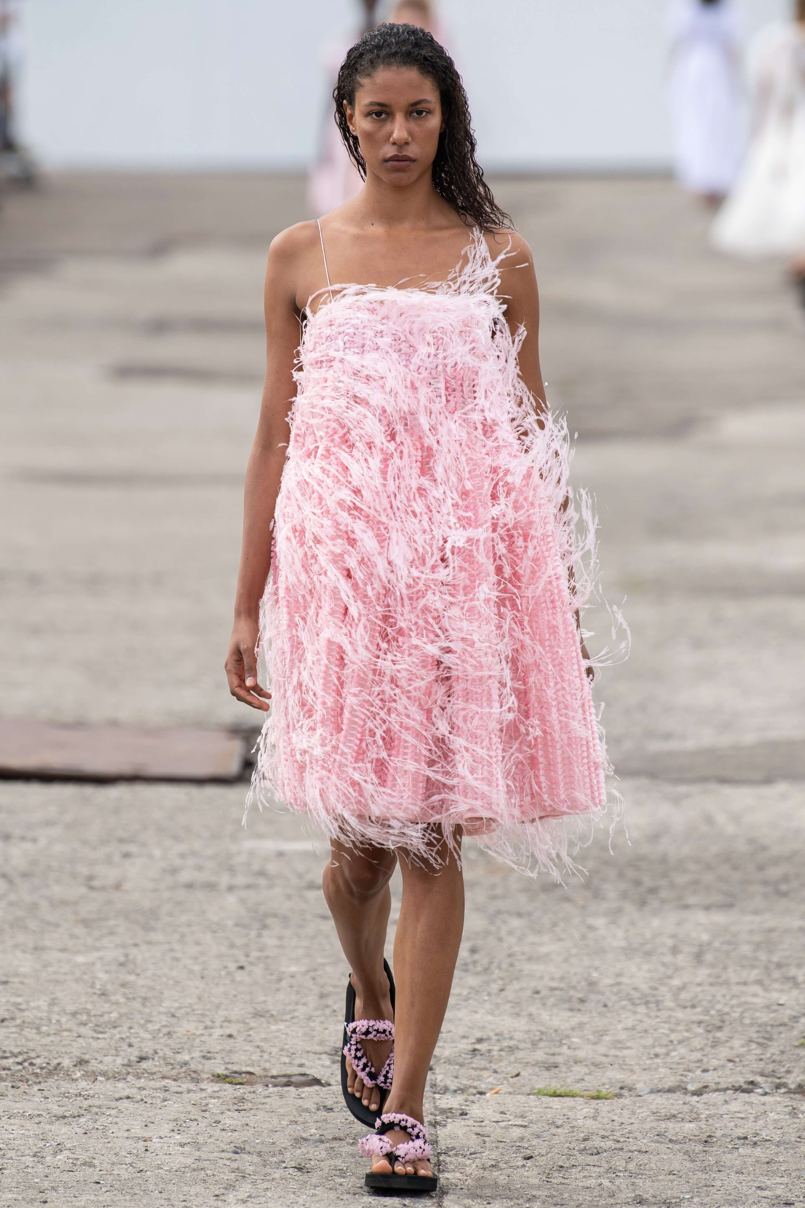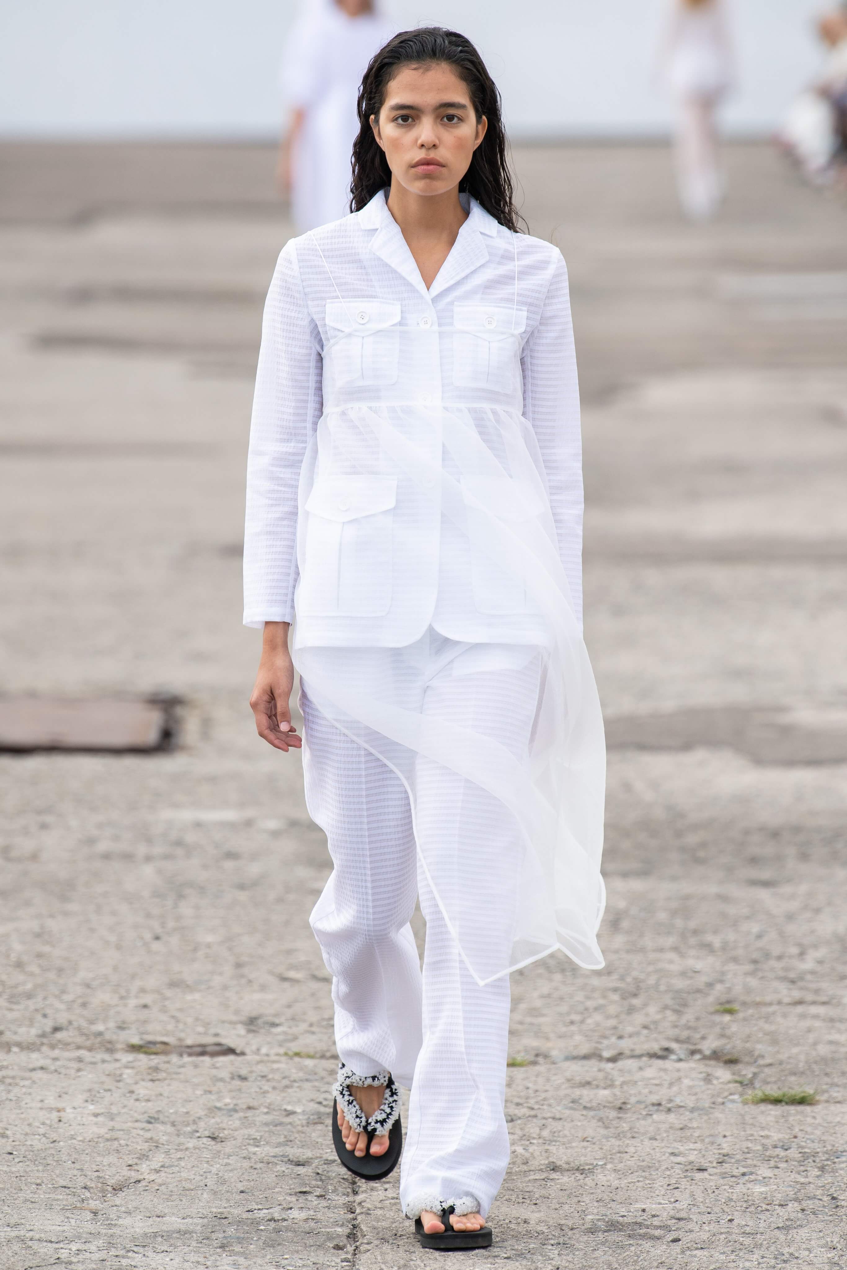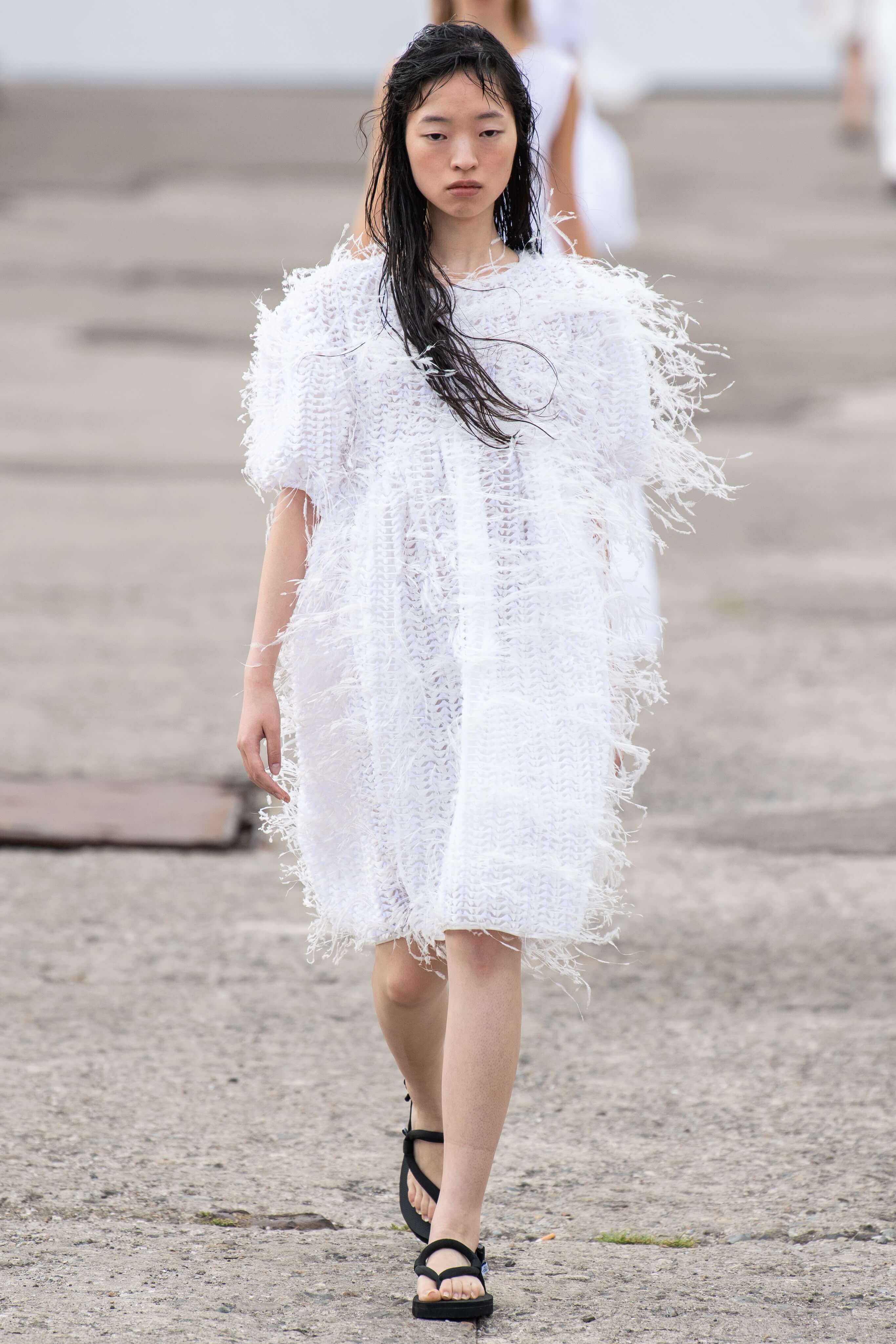 К привычным летящим тканям — шелку и органзе — она добавила текстурной помятости. Текстуру мы увидели и в платьях мини, украшенных страусиными перьями. Платья в этот раз были разбавлены брючными костюмами из полупрозрачных тканей, а силуэты стали все более приталенными. Девичьи образы белого, пастельно-желтого и нежно-розового оттенков разбавили вьетнамки с цветочной аппликацией.
