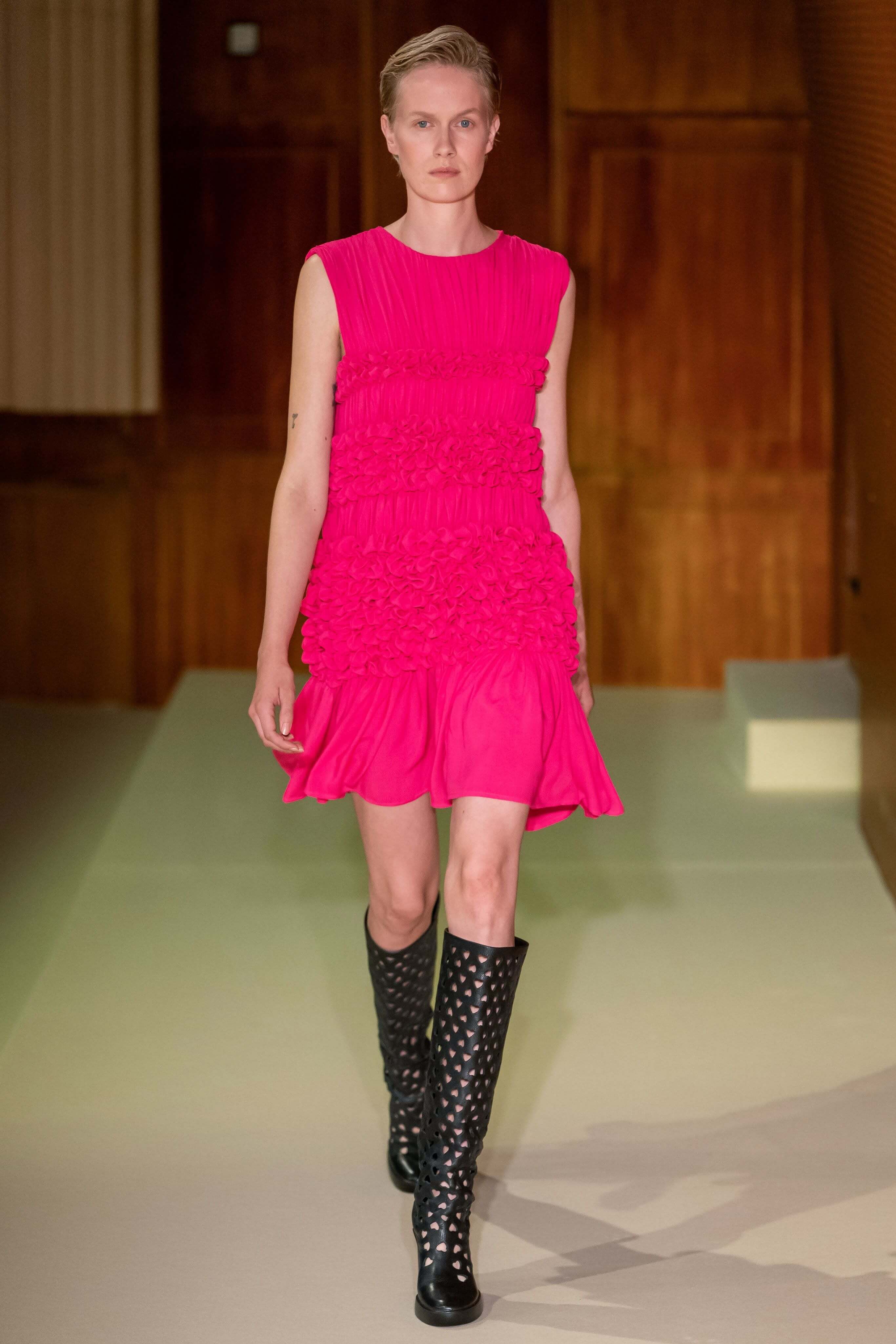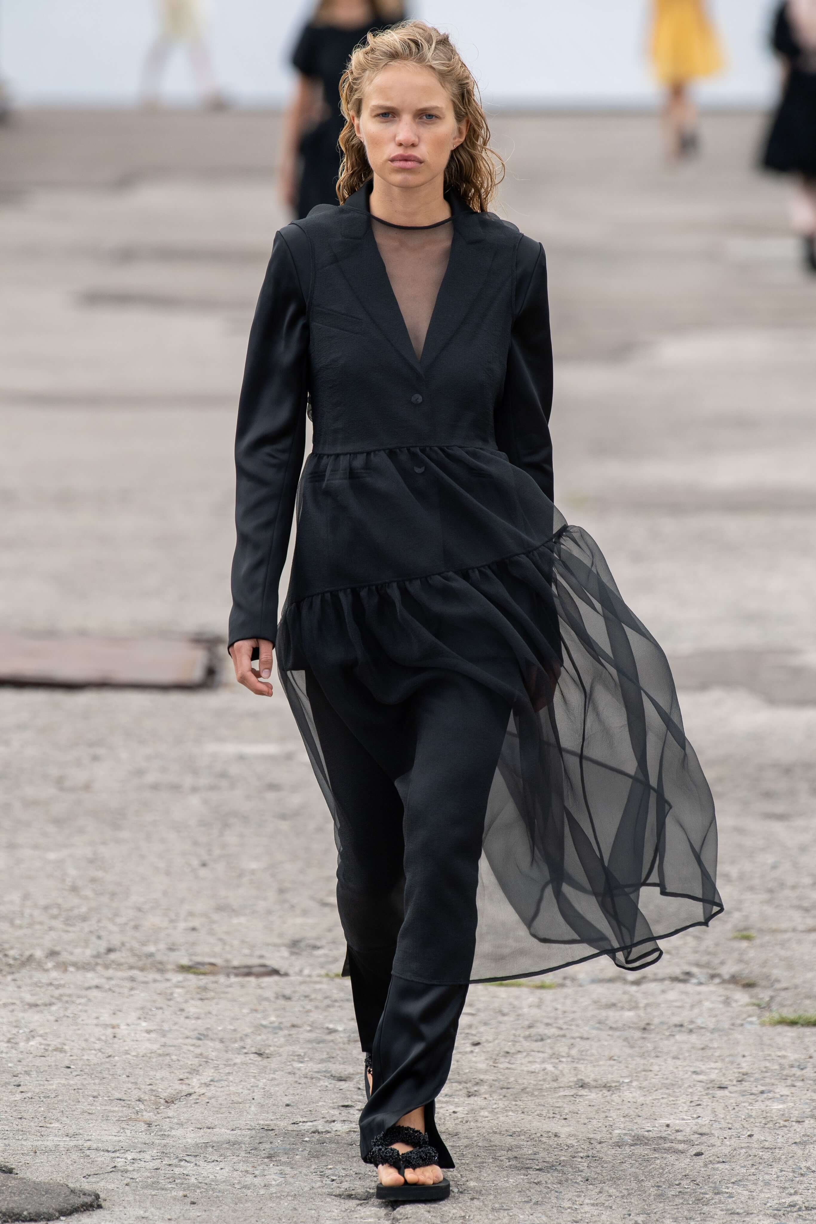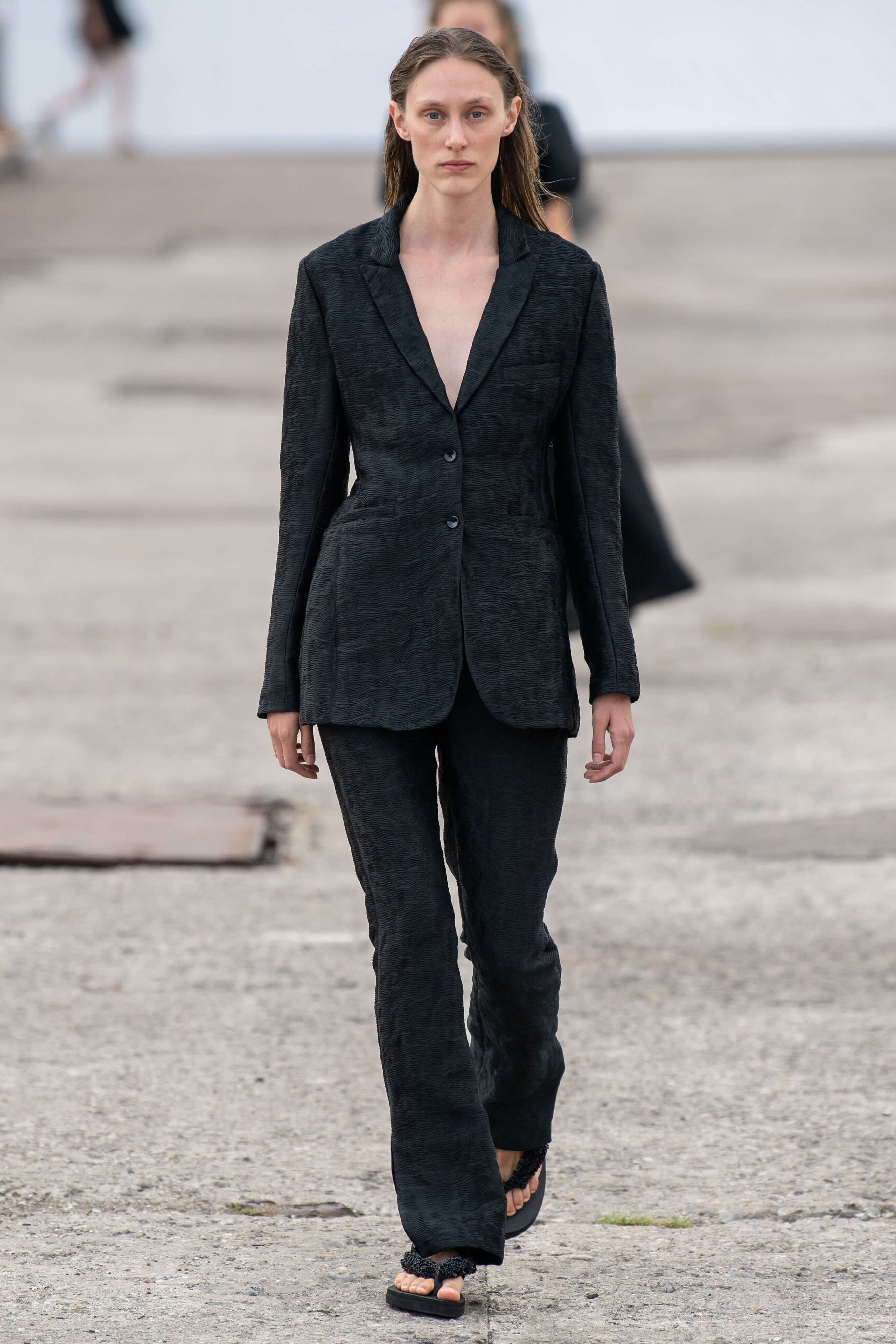 К привычным летящим тканям — шелку и органзе — она добавила текстурной помятости. Текстуру мы увидели и в платьях мини, украшенных страусиными перьями. Платья в этот раз были разбавлены брючными костюмами из полупрозрачных тканей, а силуэты стали все более приталенными. Девичьи образы белого, пастельно-желтого и нежно-розового оттенков разбавили вьетнамки с цветочной аппликацией.