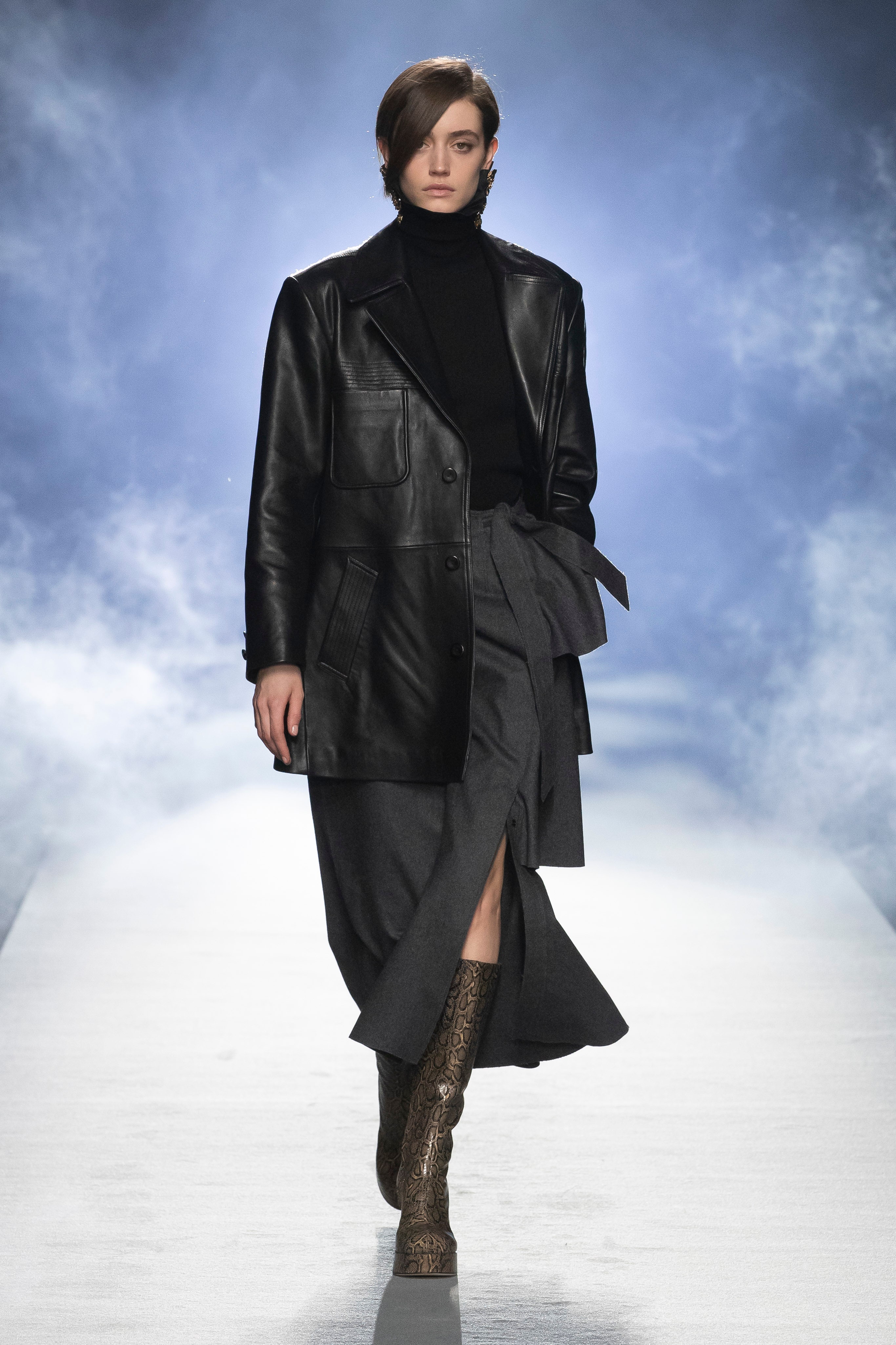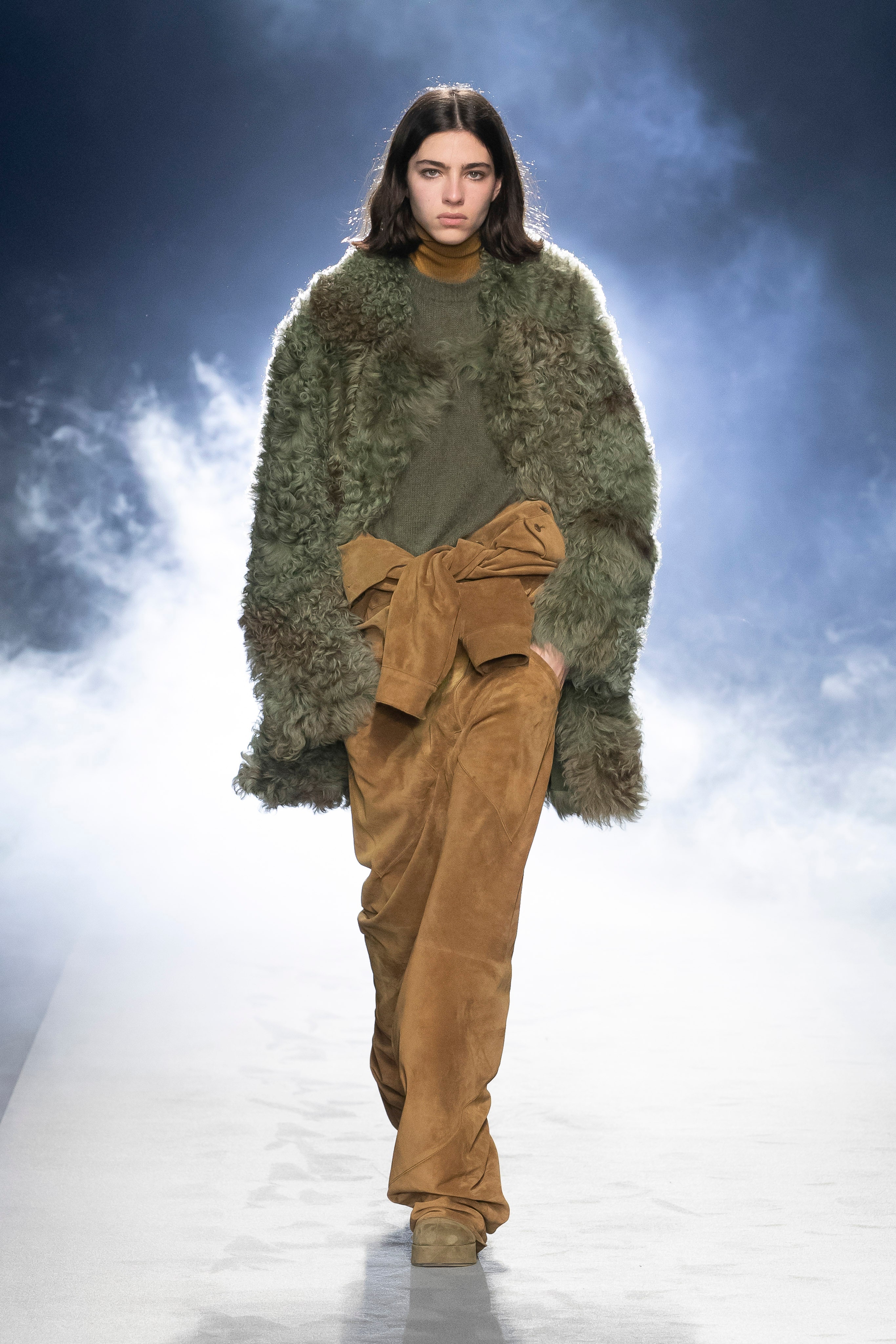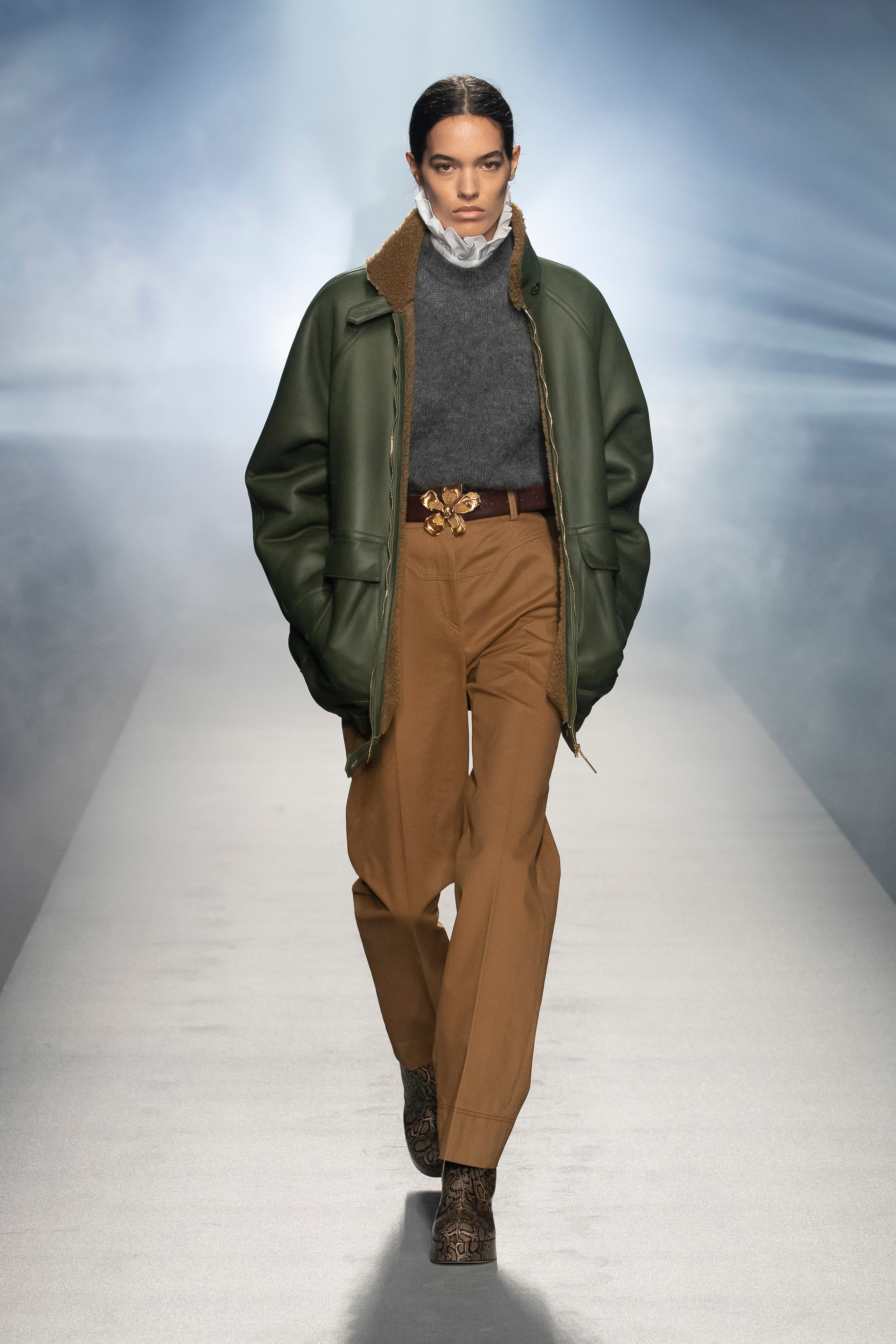 Однако среди привычных силуэтов нашлось место и новым — в коллекции наслоились друг на друга плиссированные юбки и платья, брюки, сложносочиненные блузы и бушлаты. Отдельные образы напомнили о моде времен Авраама Линкольна — например, силуэтный пиджак-редингот с выглядывающим белоснежным воротом блузы или пальто с отложными лацканами и крупной цветочной брошью. Брюки верблюжьего оттенка в сочетании с объемной оливковой паркой и серым шерстяным свитером вызывали в памяти загородные образы королевской семьи, а роскошные брюки с золотой бахромой, яркие пончо и стянутые ремнями платья неизменно отсылают к фольклорному южноамериканскому стилю гаучо.