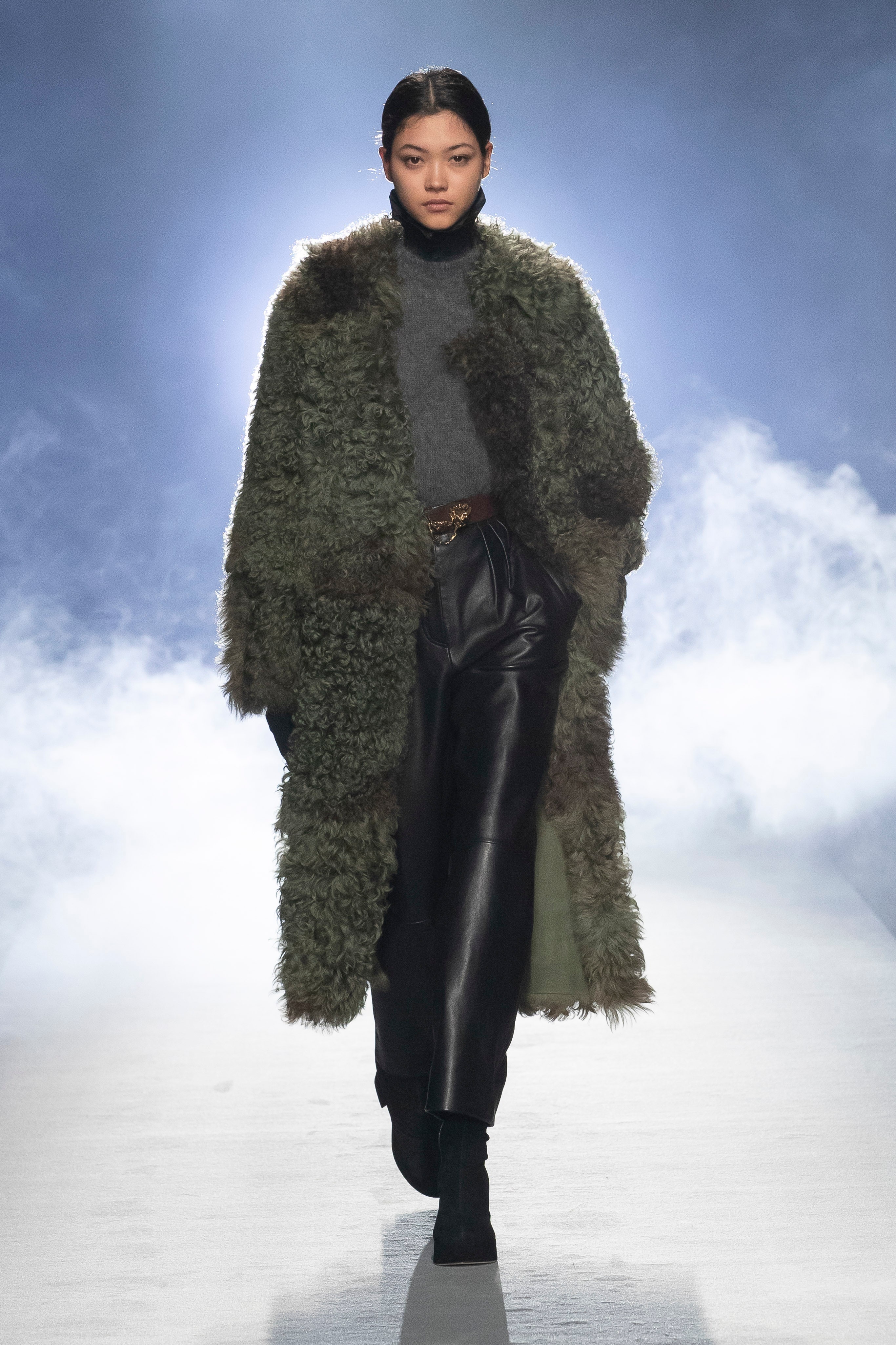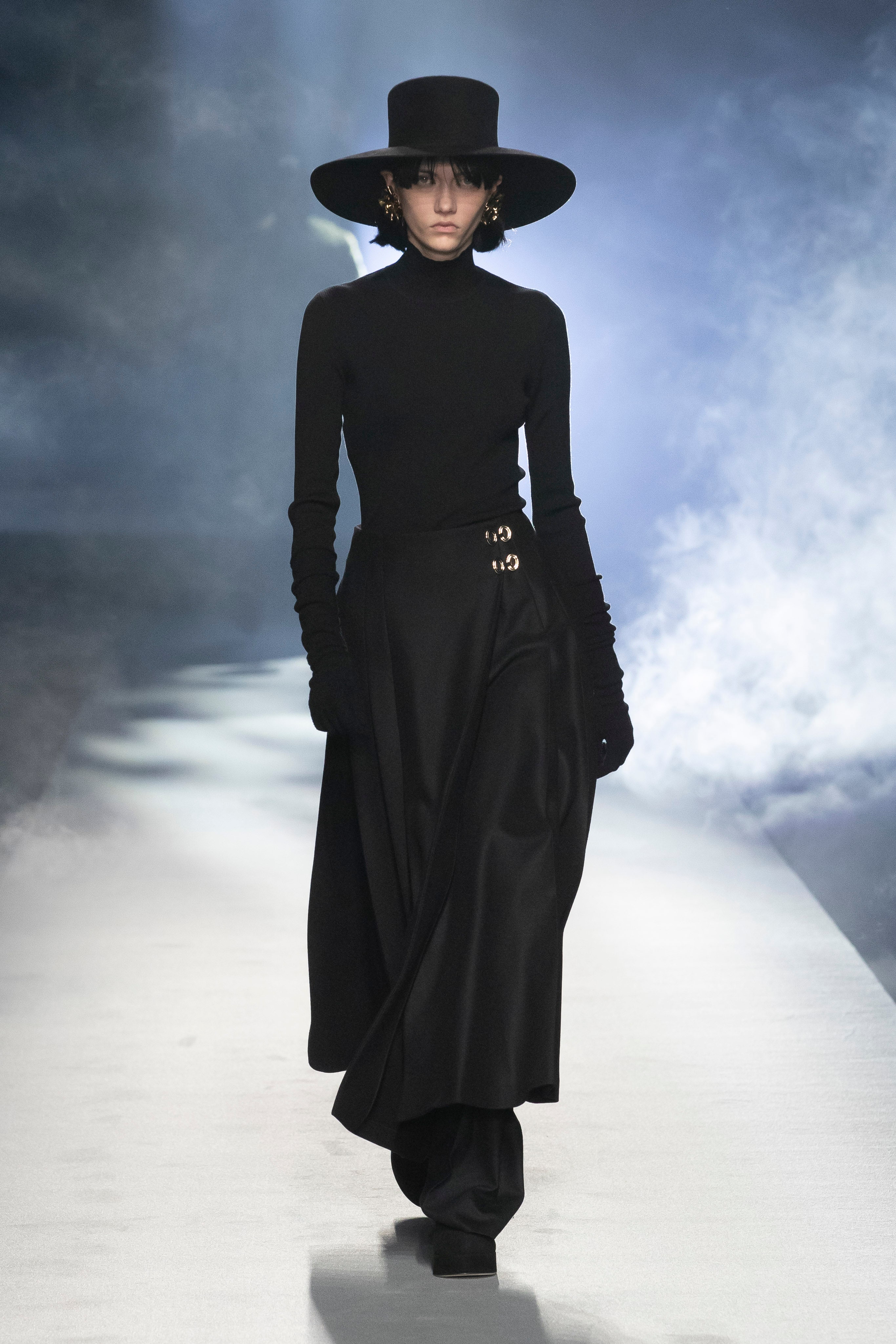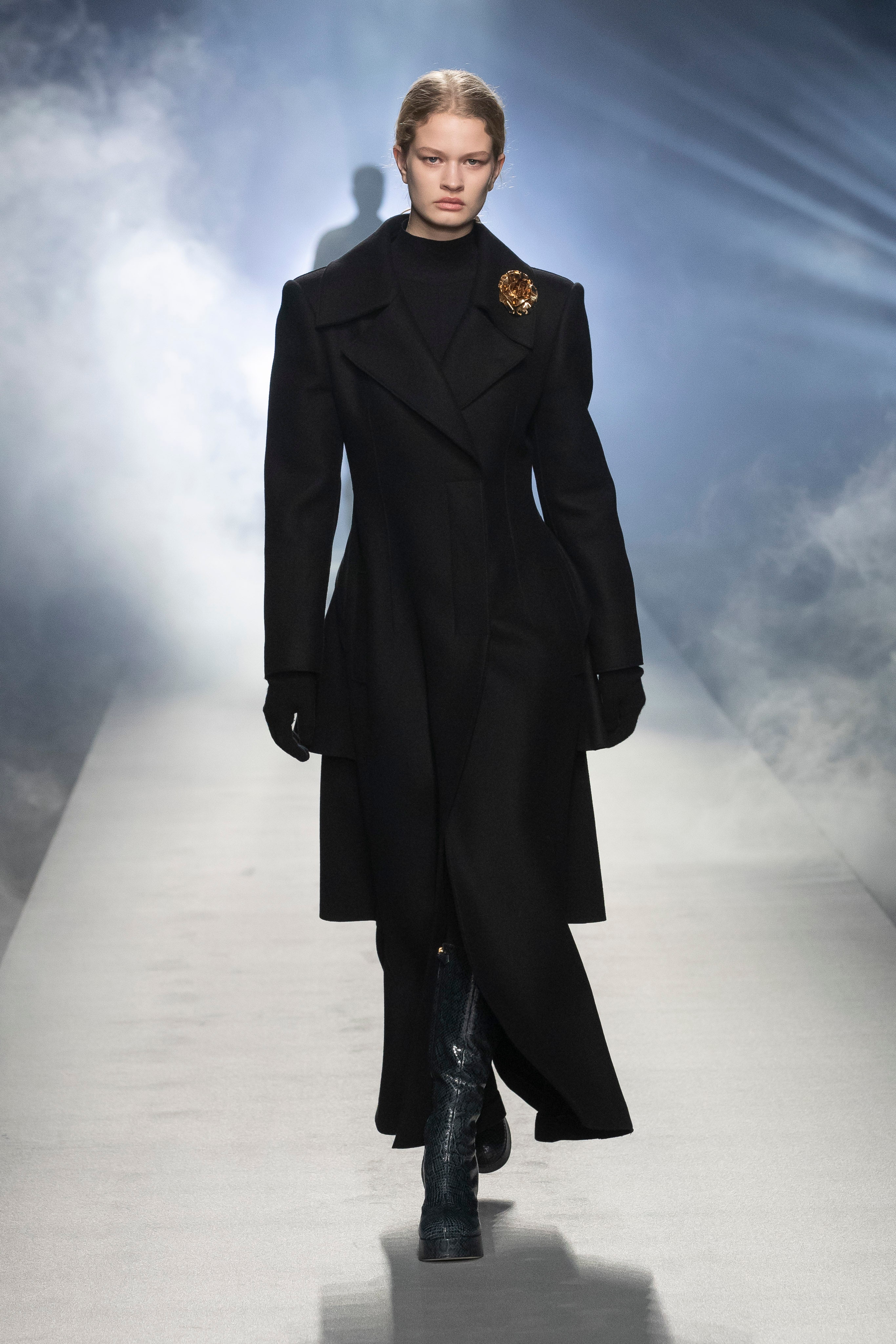 Однако среди привычных силуэтов нашлось место и новым — в коллекции наслоились друг на друга плиссированные юбки и платья, брюки, сложносочиненные блузы и бушлаты. Отдельные образы напомнили о моде времен Авраама Линкольна — например, силуэтный пиджак-редингот с выглядывающим белоснежным воротом блузы или пальто с отложными лацканами и крупной цветочной брошью. Брюки верблюжьего оттенка в сочетании с объемной оливковой паркой и серым шерстяным свитером вызывали в памяти загородные образы королевской семьи, а роскошные брюки с золотой бахромой, яркие пончо и стянутые ремнями платья неизменно отсылают к фольклорному южноамериканскому стилю гаучо.