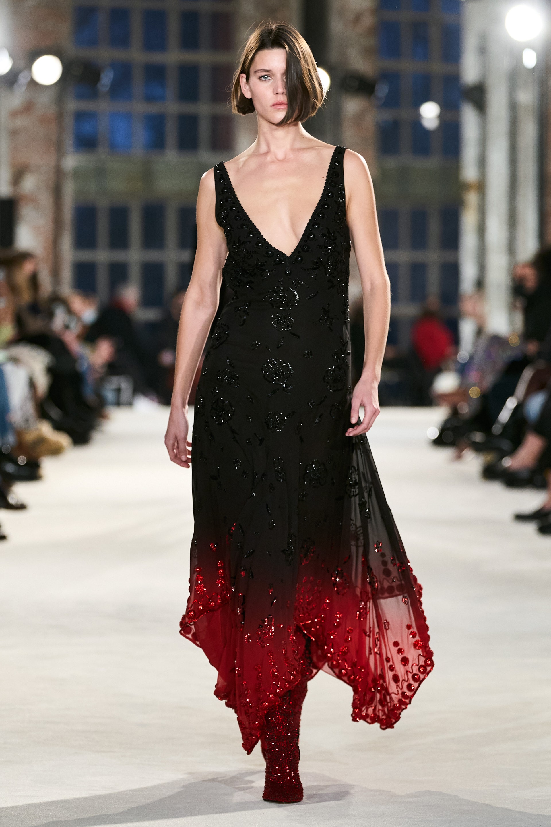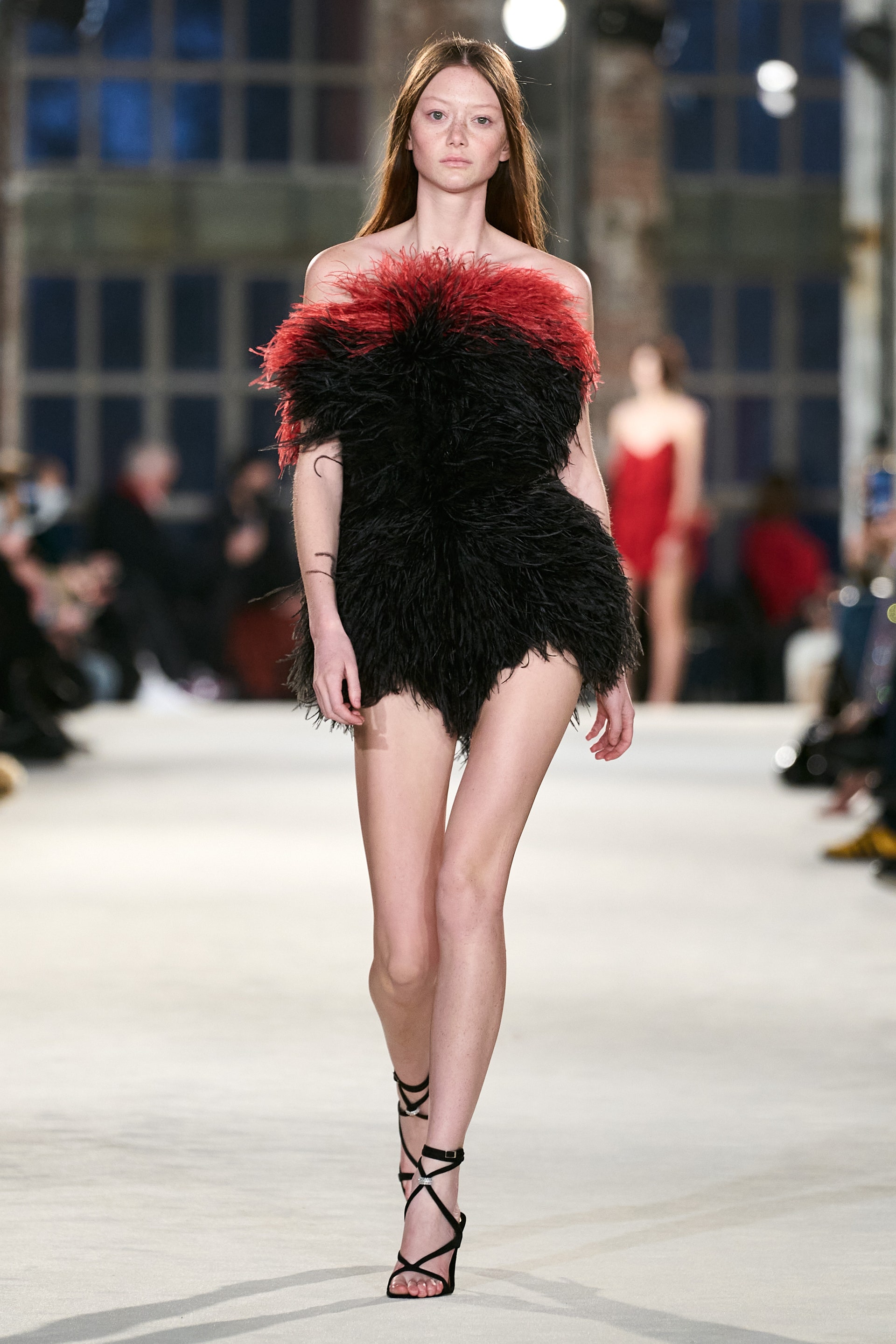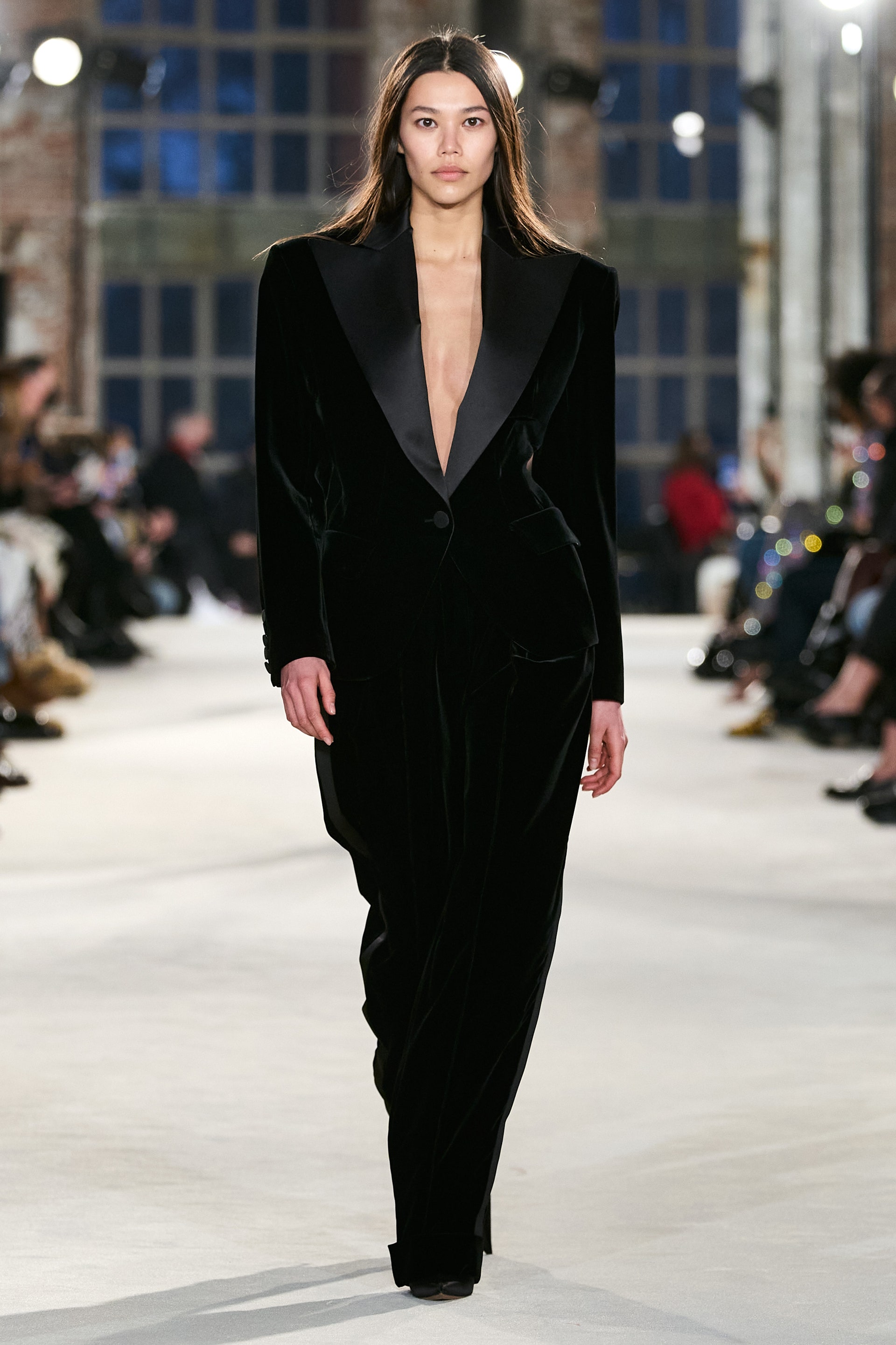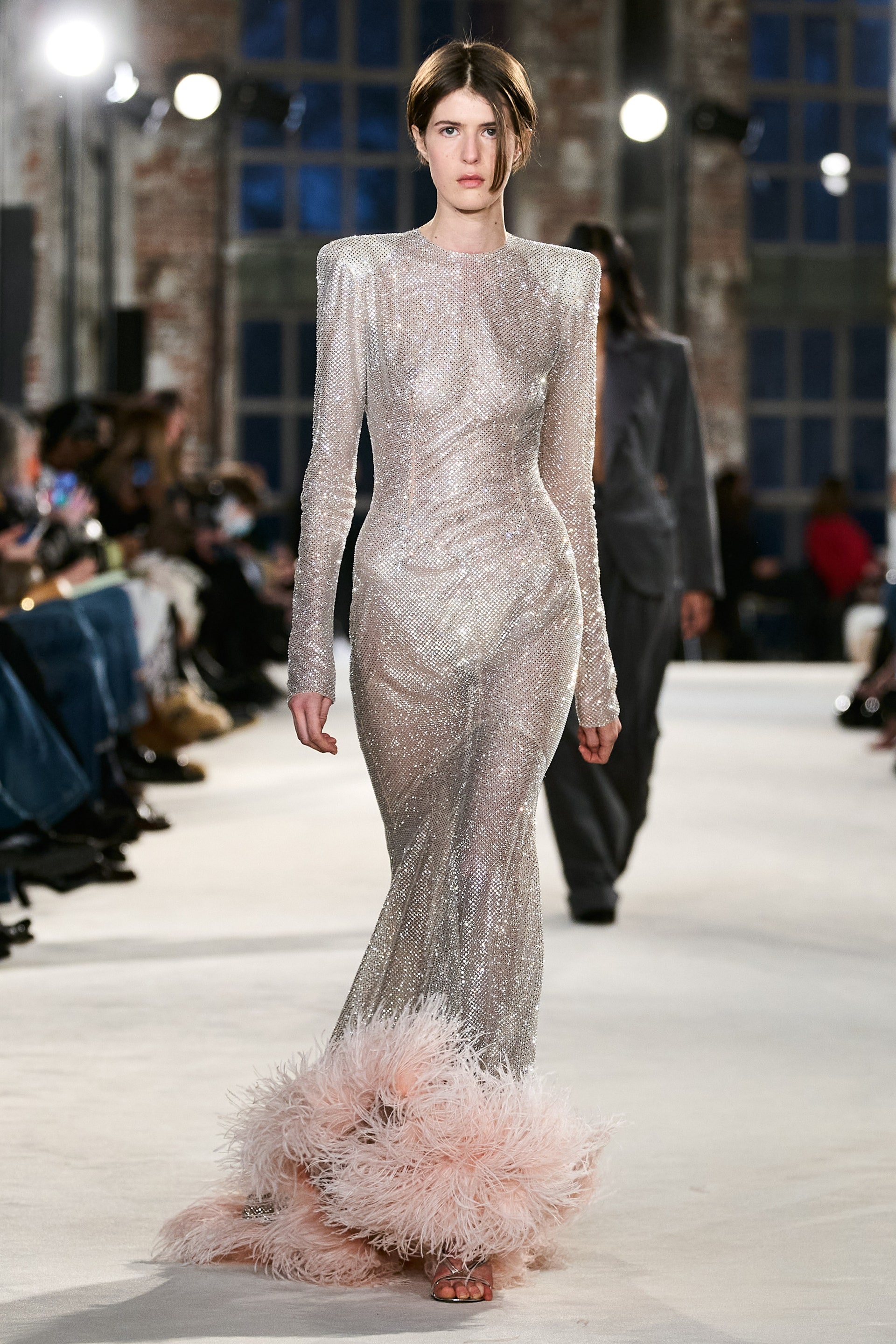Соблазнительные платья из дымчато-зеленого шелка, боди из перьев и бархатные мини с рукавами-буфами в духе Belle Epoque чередовались с алыми, белоснежными, серыми и черными смокингами, роскошными кейпами в пол и платьями, усыпанными сотнями пайеток. В подиумных образах угадываются силуэты золотой эпохи Голливуда, карнавальная эстетика 1930-х и тонкий лейтмотив нуарного кино, в котором героини носили особенно экстравагантные наряды: это и роскошные дезабилье Вероники Лейк, и облегающие платья Риты Хейворт, а также осанистые костюмы Лорен Бэколл и сияющие платья Глории Свенсон.