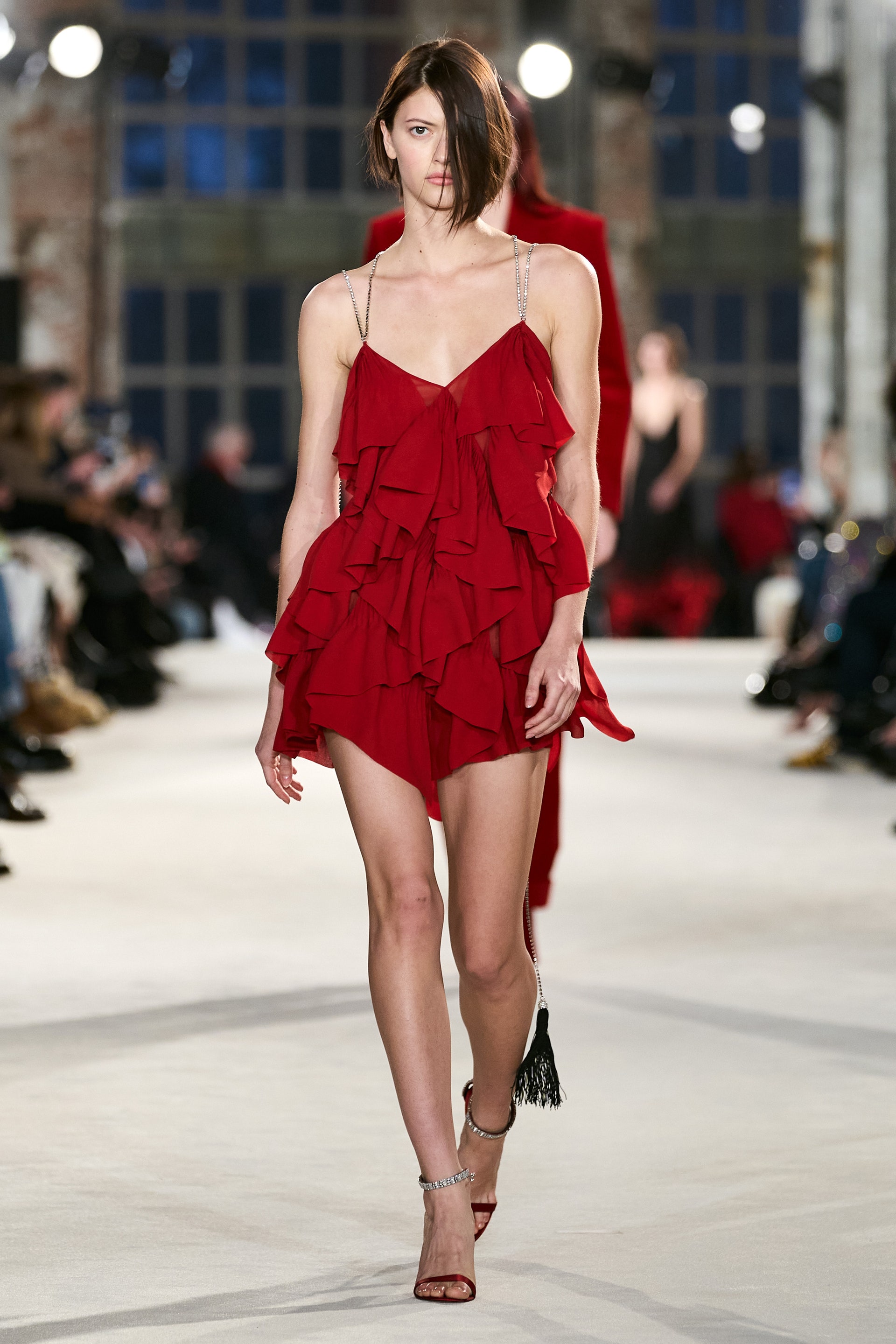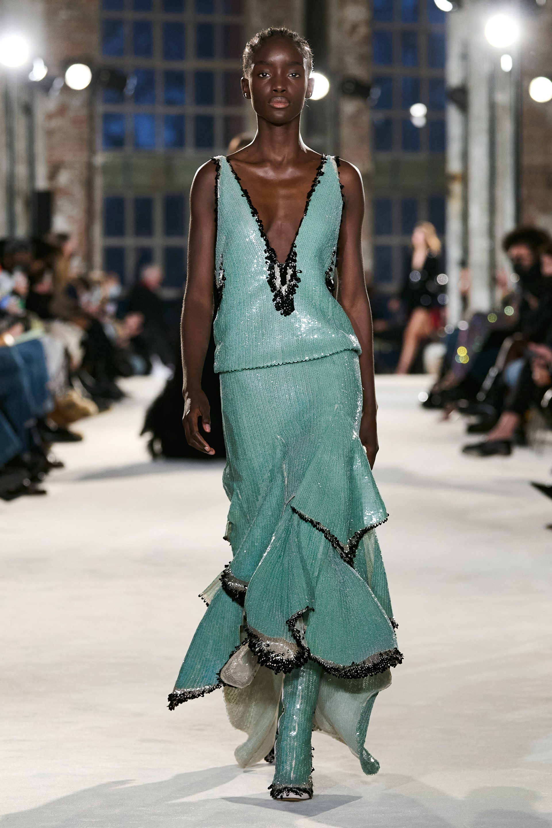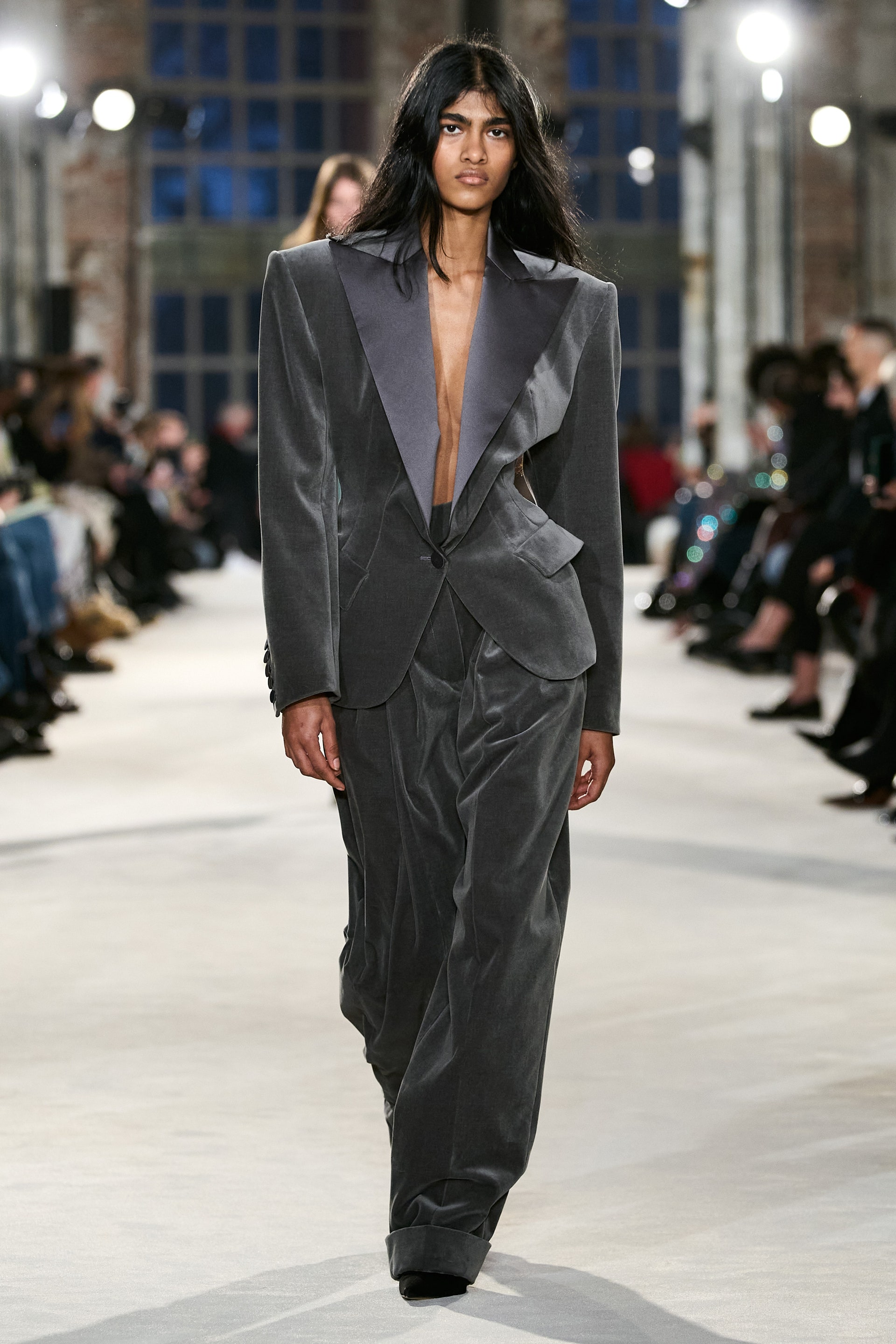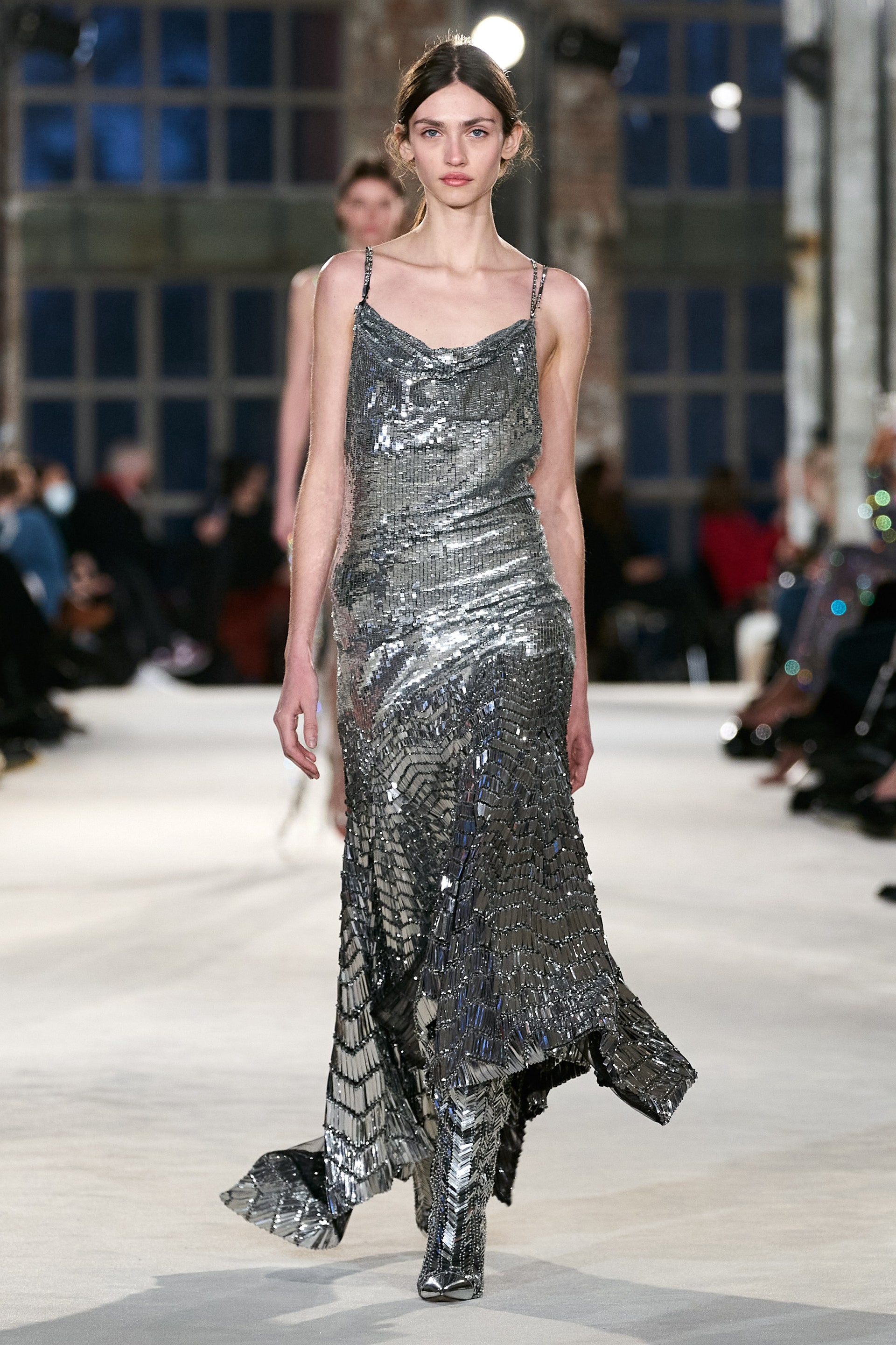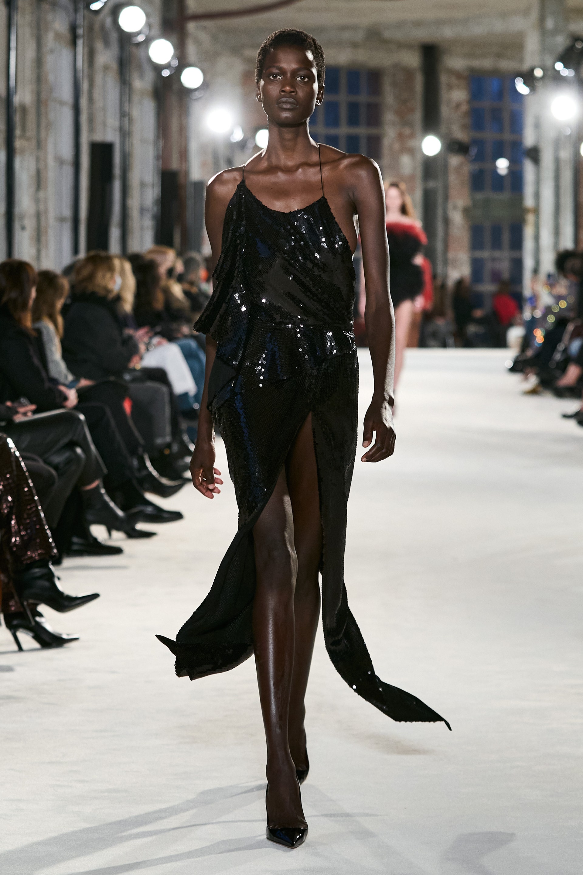 Соблазнительные платья из дымчато-зеленого шелка, боди из перьев и бархатные мини с рукавами-буфами в духе Belle Epoque чередовались с алыми, белоснежными, серыми и черными смокингами, роскошными кейпами в пол и платьями, усыпанными сотнями пайеток. В подиумных образах угадываются силуэты золотой эпохи Голливуда, карнавальная эстетика 1930-х и тонкий лейтмотив нуарного кино, в котором героини носили особенно экстравагантные наряды: это и роскошные дезабилье Вероники Лейк, и облегающие платья Риты Хейворт, а также осанистые костюмы Лорен Бэколл и сияющие платья Глории Свенсон.