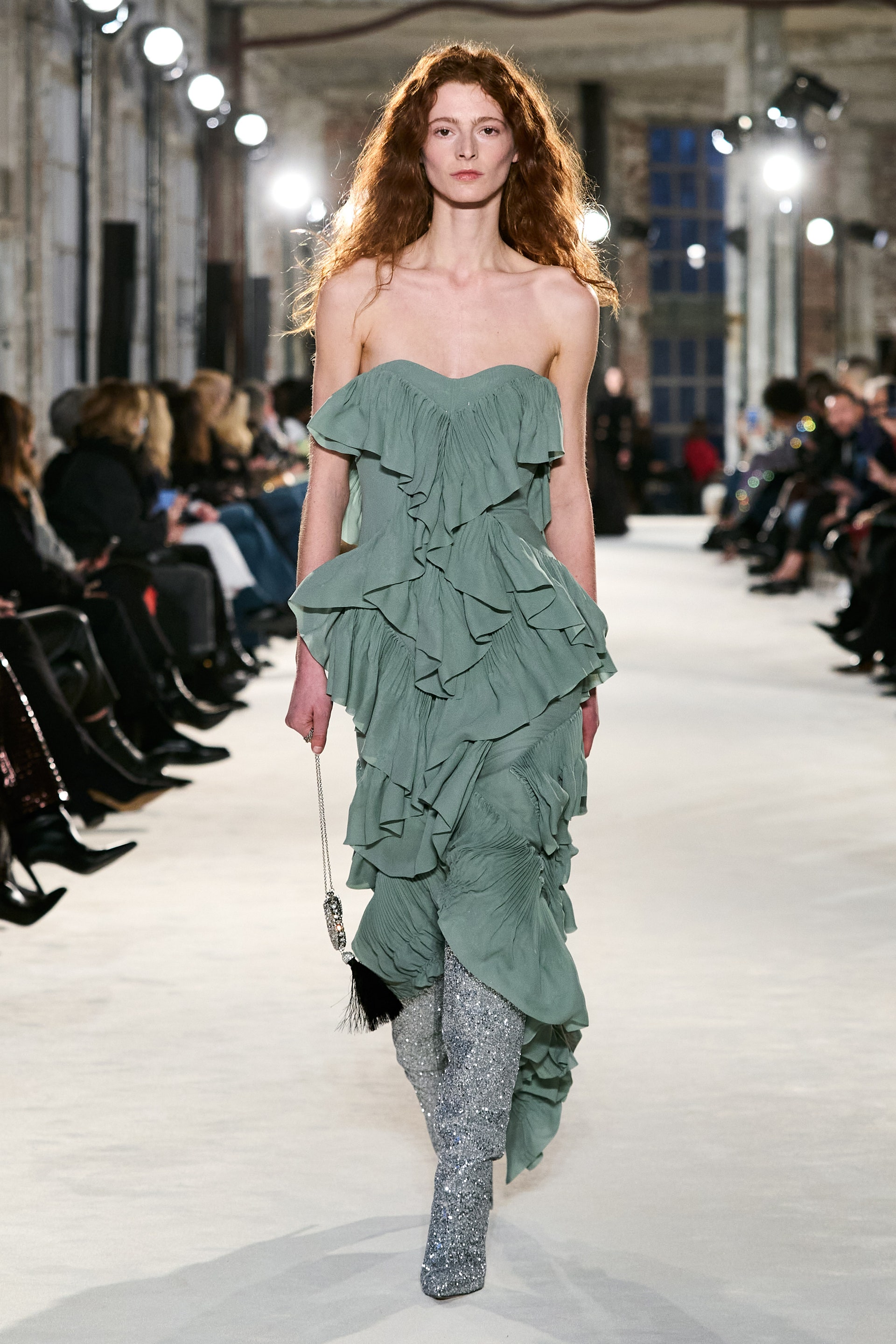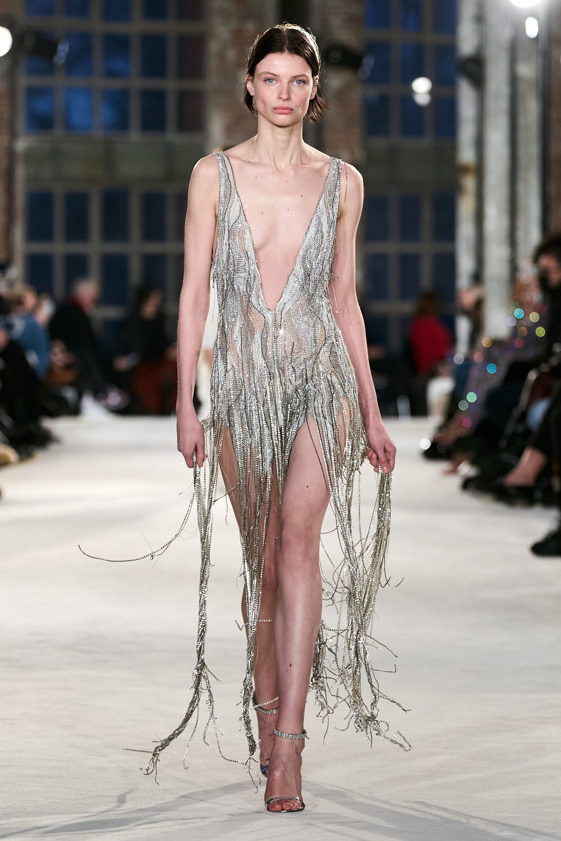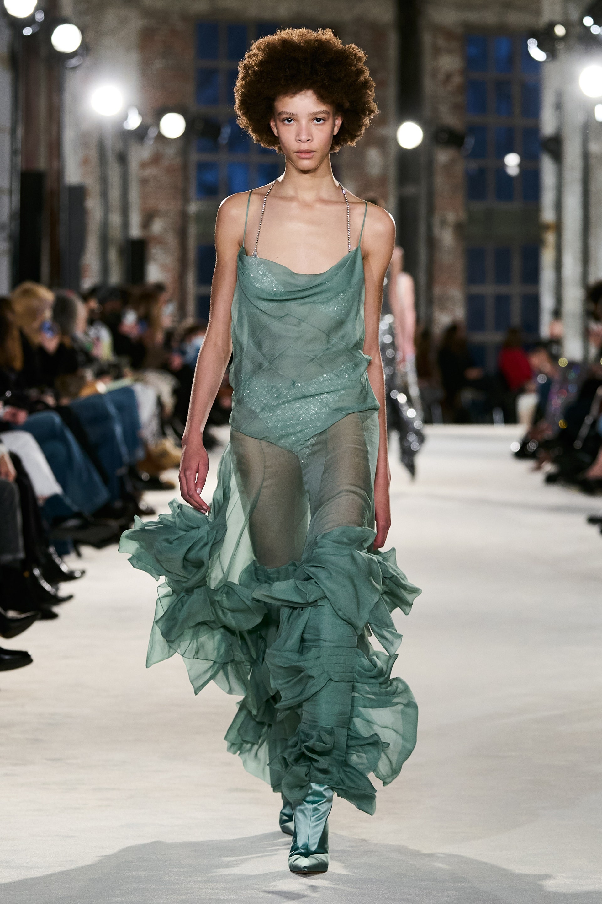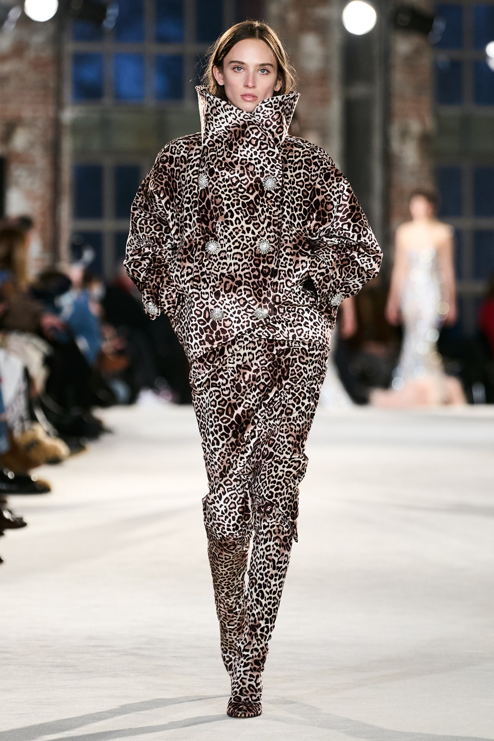 Соблазнительные платья из дымчато-зеленого шелка, боди из перьев и бархатные мини с рукавами-буфами в духе Belle Epoque чередовались с алыми, белоснежными, серыми и черными смокингами, роскошными кейпами в пол и платьями, усыпанными сотнями пайеток. В подиумных образах угадываются силуэты золотой эпохи Голливуда, карнавальная эстетика 1930-х и тонкий лейтмотив нуарного кино, в котором героини носили особенно экстравагантные наряды: это и роскошные дезабилье Вероники Лейк, и облегающие платья Риты Хейворт, а также осанистые костюмы Лорен Бэколл и сияющие платья Глории Свенсон.