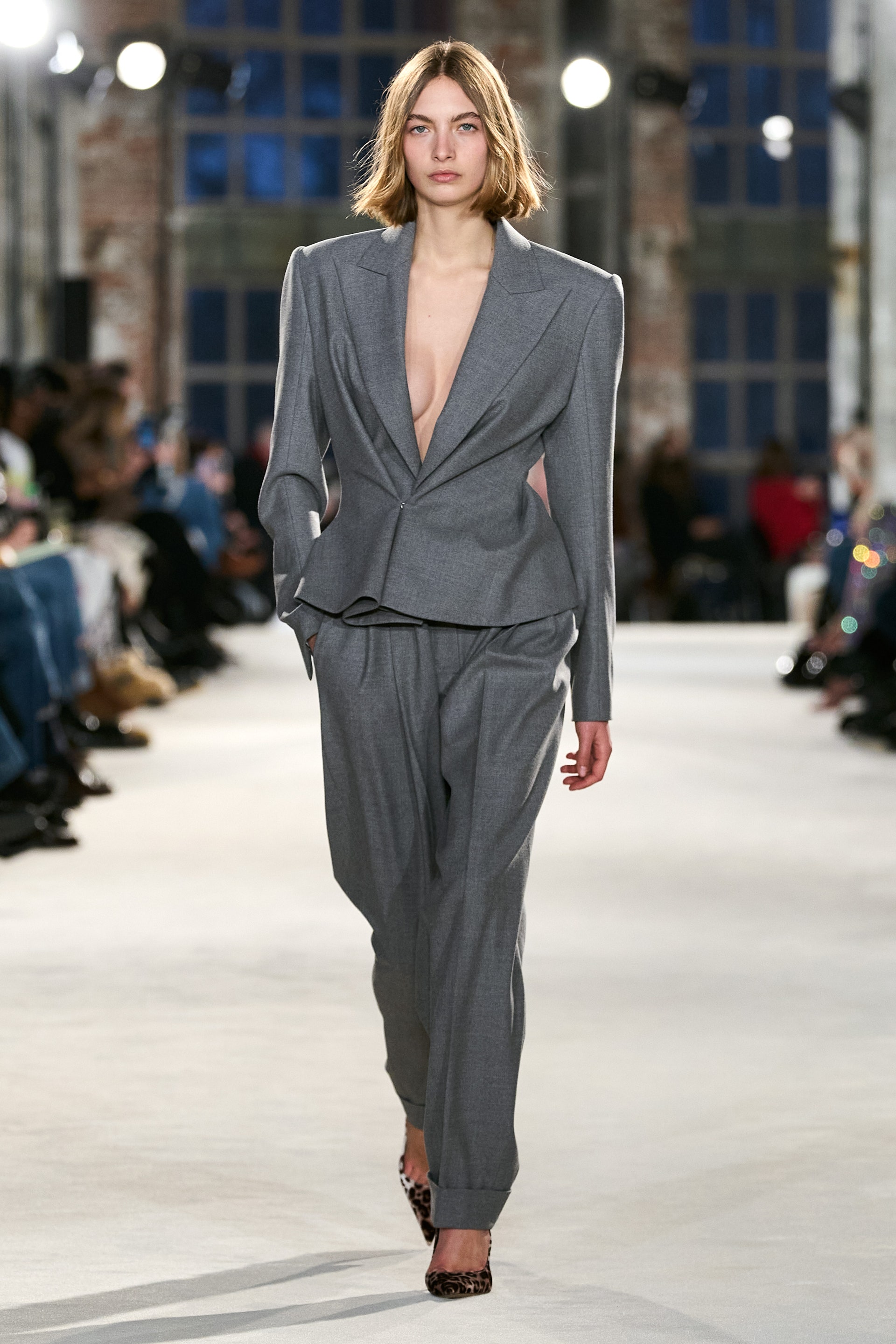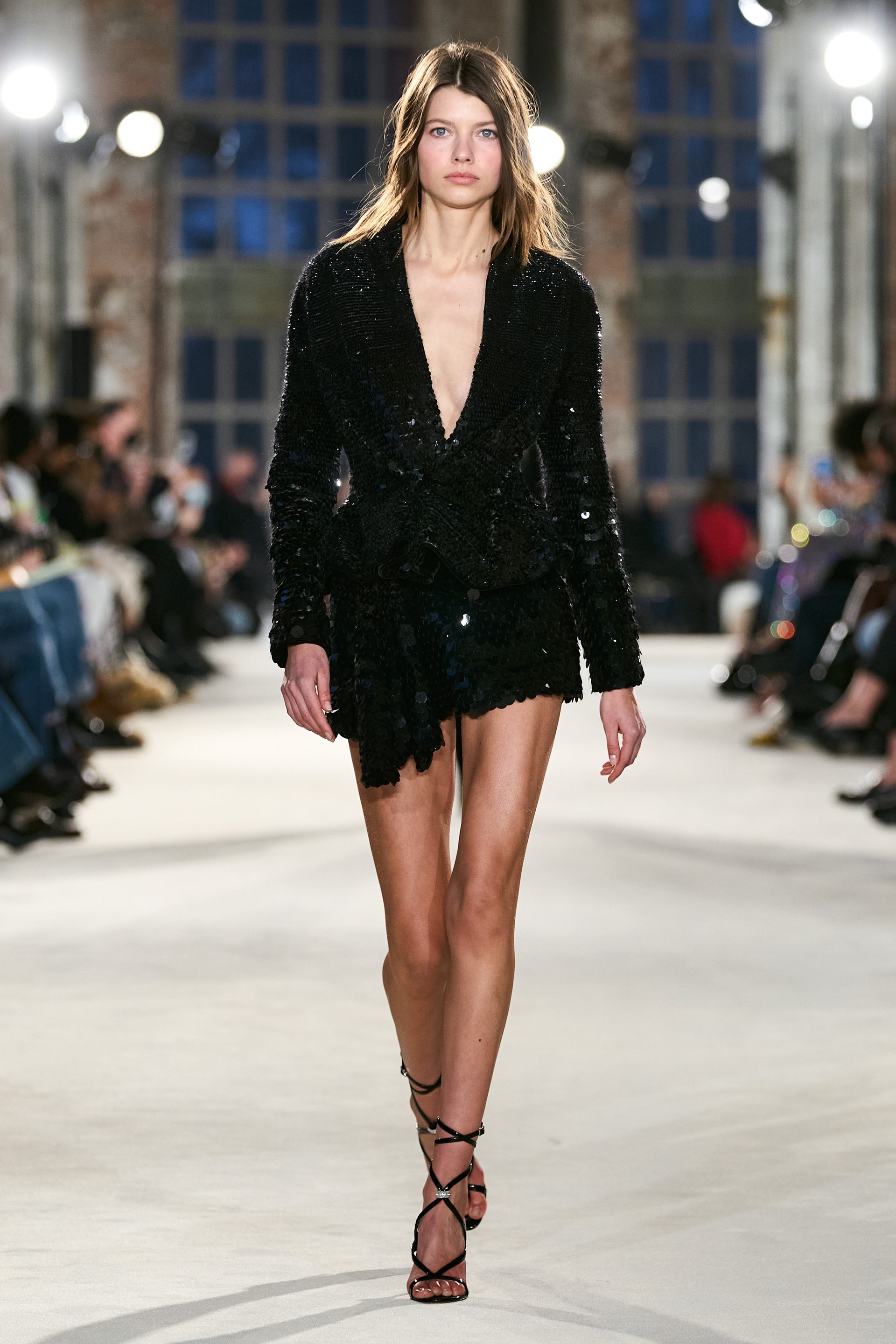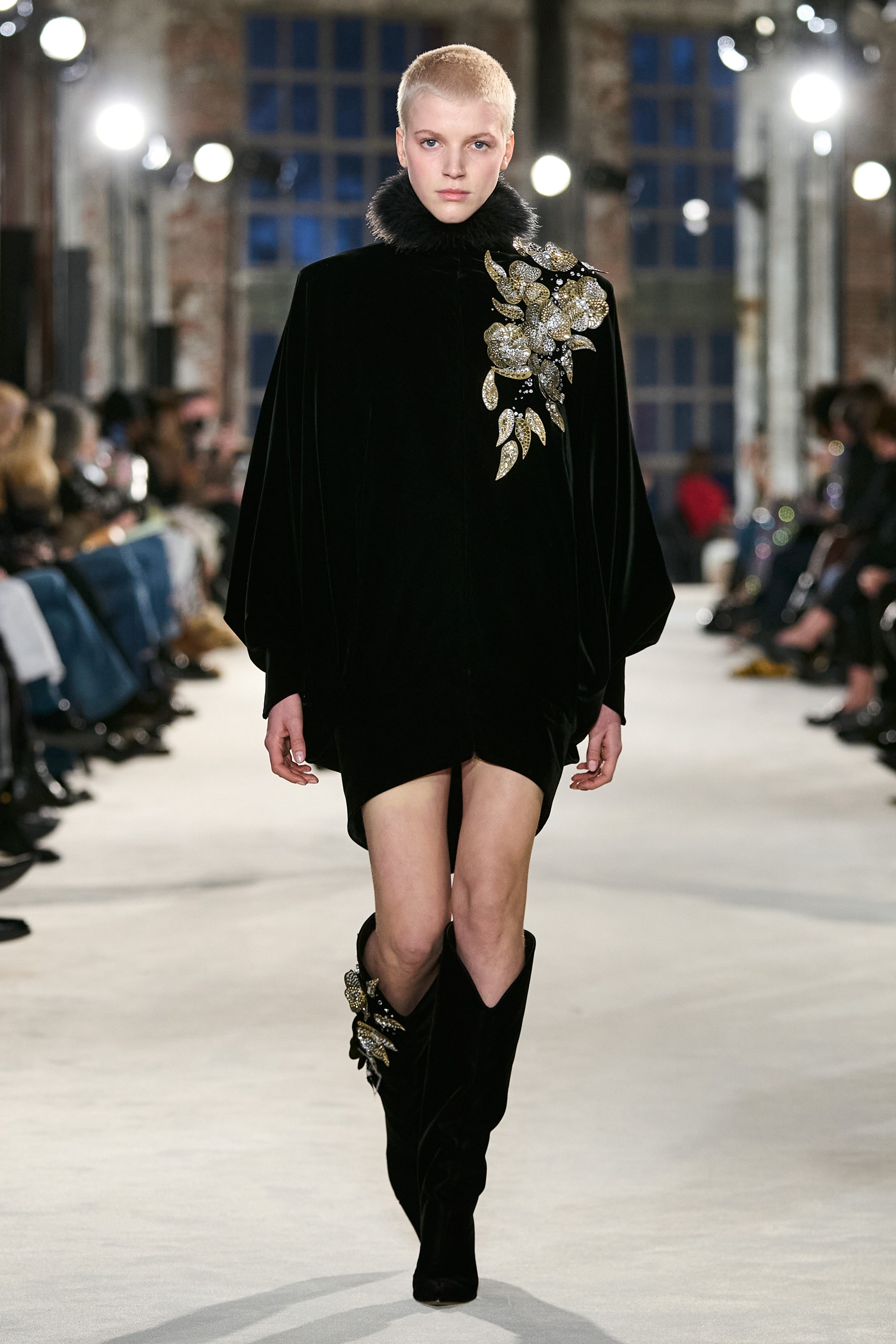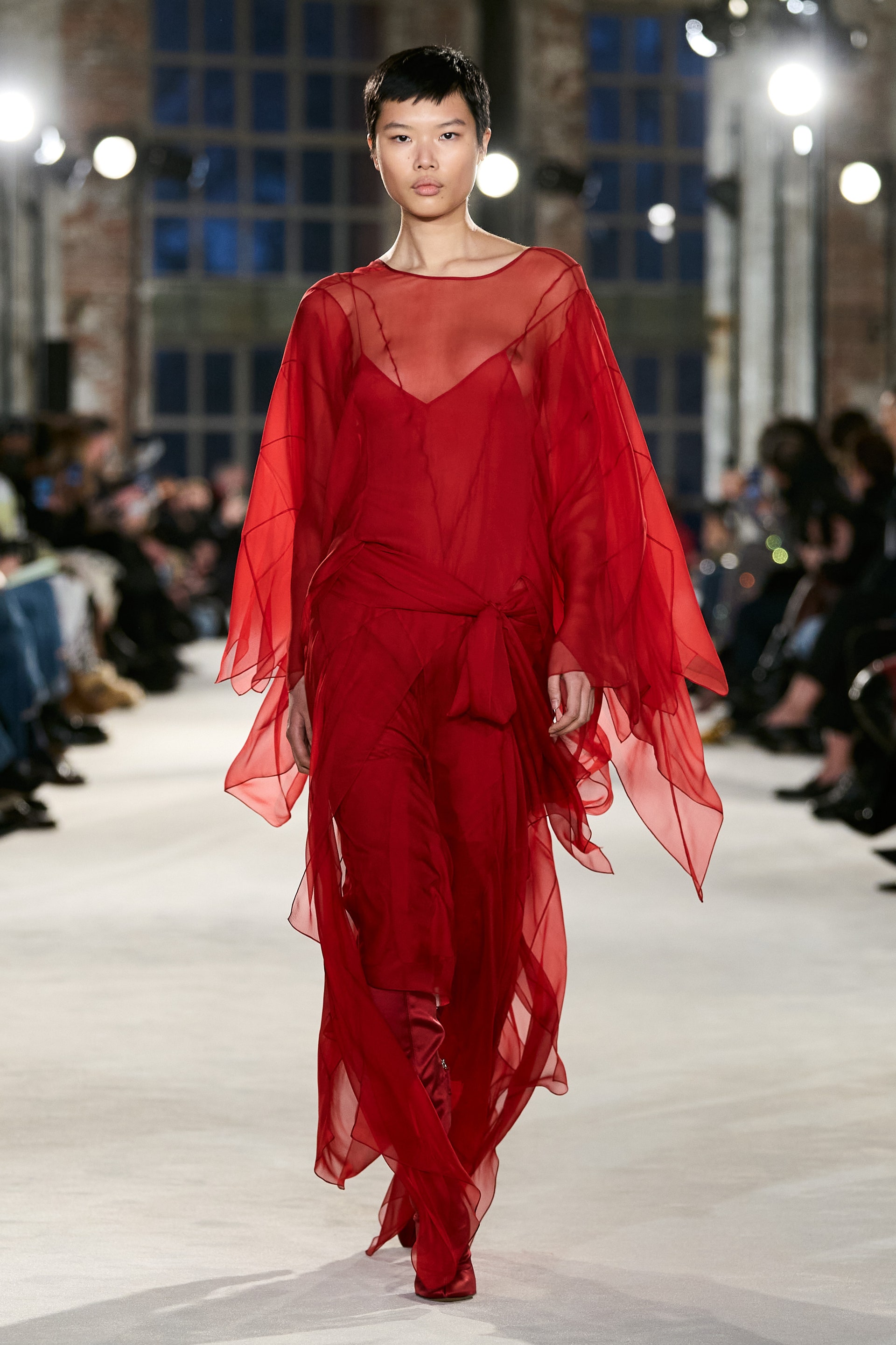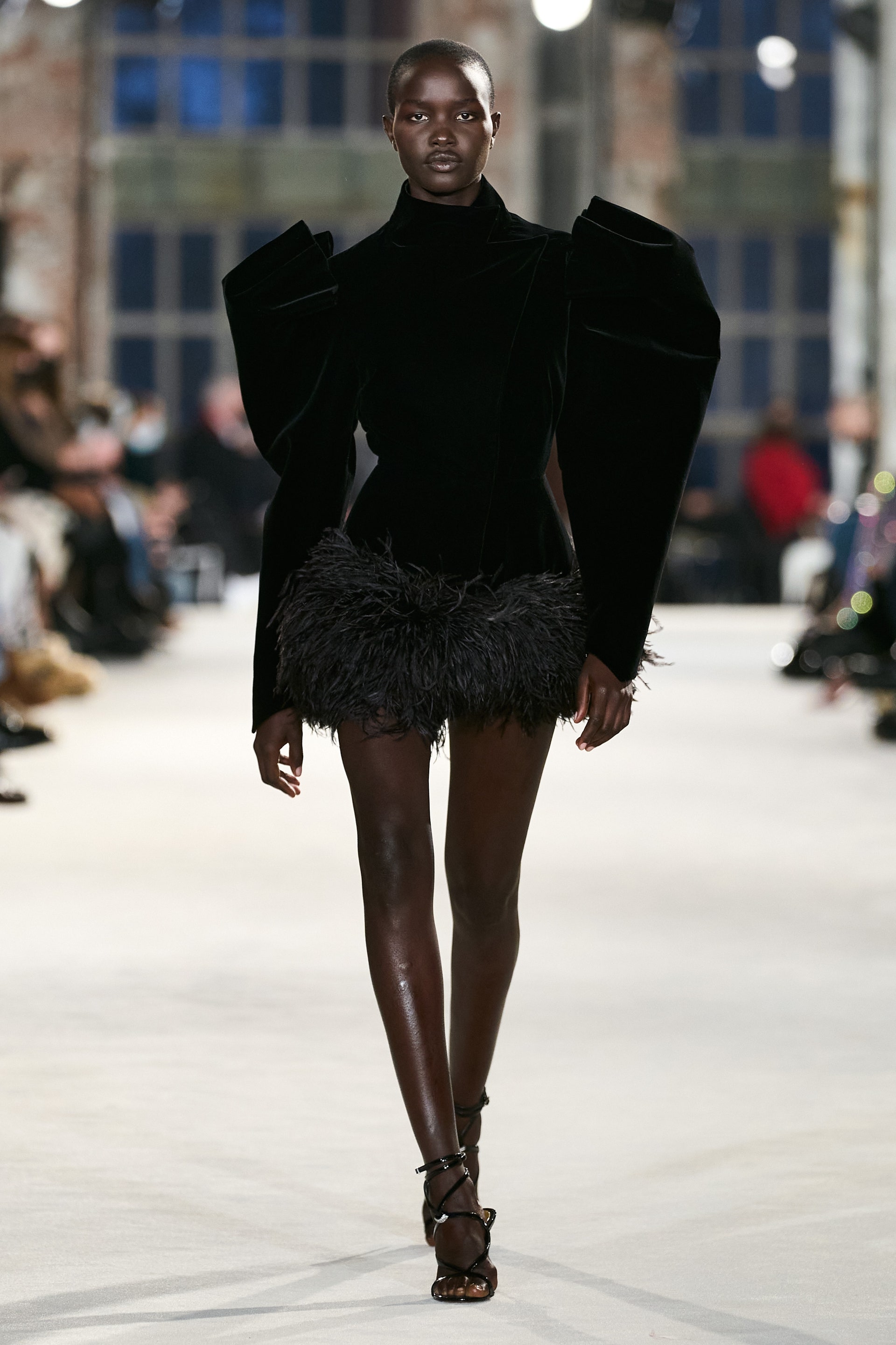 Соблазнительные платья из дымчато-зеленого шелка, боди из перьев и бархатные мини с рукавами-буфами в духе Belle Epoque чередовались с алыми, белоснежными, серыми и черными смокингами, роскошными кейпами в пол и платьями, усыпанными сотнями пайеток. В подиумных образах угадываются силуэты золотой эпохи Голливуда, карнавальная эстетика 1930-х и тонкий лейтмотив нуарного кино, в котором героини носили особенно экстравагантные наряды: это и роскошные дезабилье Вероники Лейк, и облегающие платья Риты Хейворт, а также осанистые костюмы Лорен Бэколл и сияющие платья Глории Свенсон.