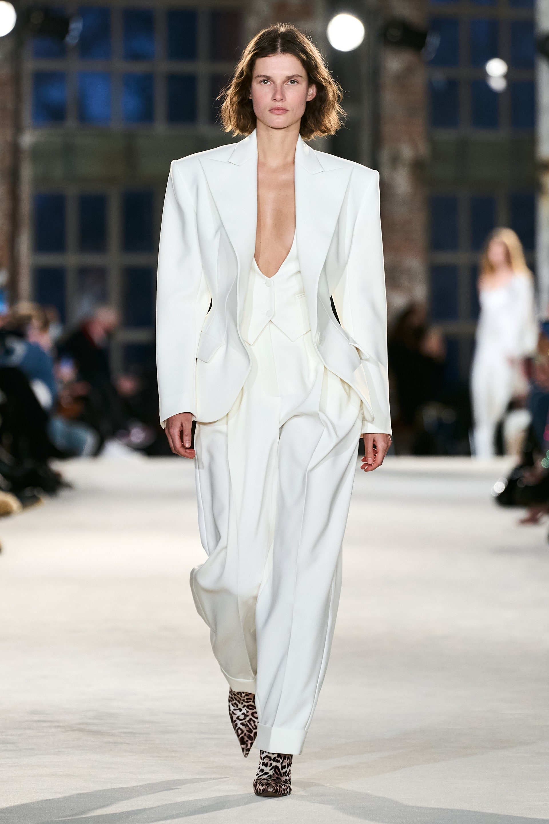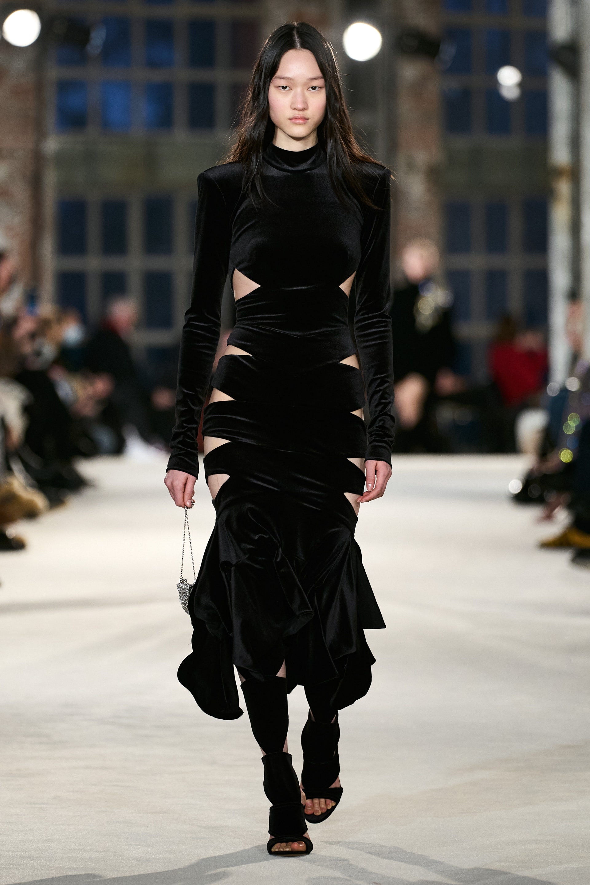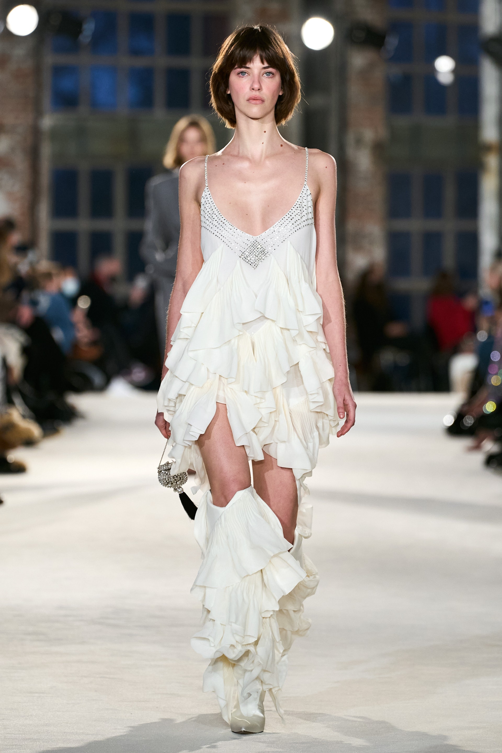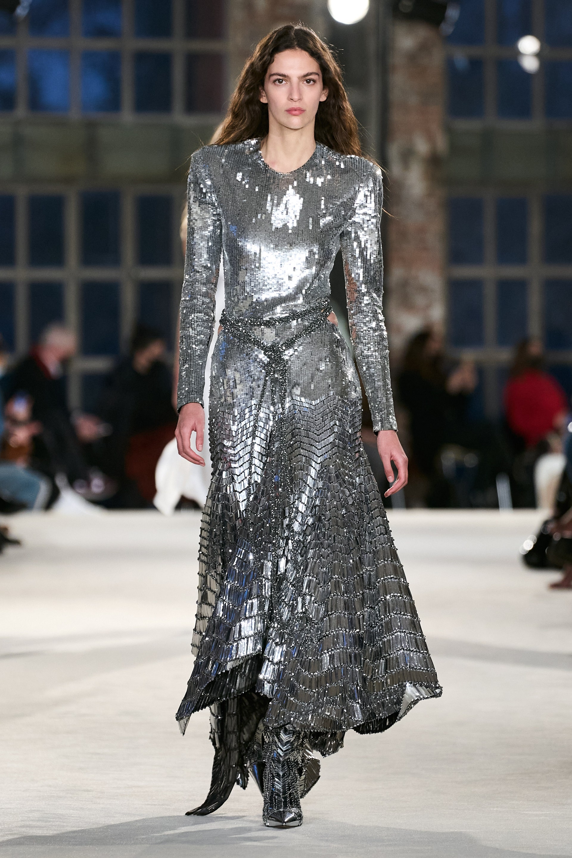 Соблазнительные платья из дымчато-зеленого шелка, боди из перьев и бархатные мини с рукавами-буфами в духе Belle Epoque чередовались с алыми, белоснежными, серыми и черными смокингами, роскошными кейпами в пол и платьями, усыпанными сотнями пайеток. В подиумных образах угадываются силуэты золотой эпохи Голливуда, карнавальная эстетика 1930-х и тонкий лейтмотив нуарного кино, в котором героини носили особенно экстравагантные наряды: это и роскошные дезабилье Вероники Лейк, и облегающие платья Риты Хейворт, а также осанистые костюмы Лорен Бэколл и сияющие платья Глории Свенсон.