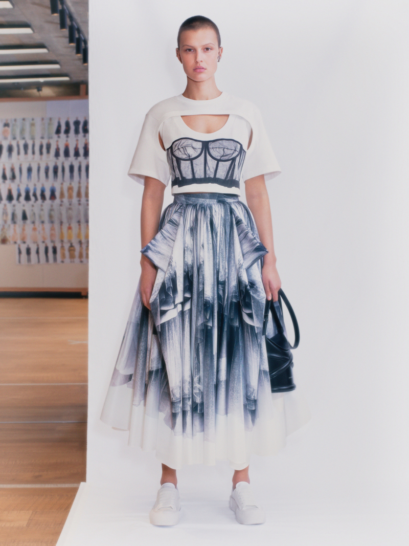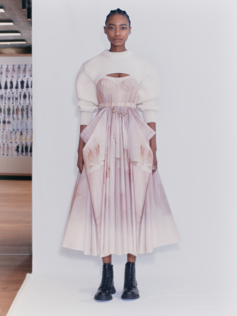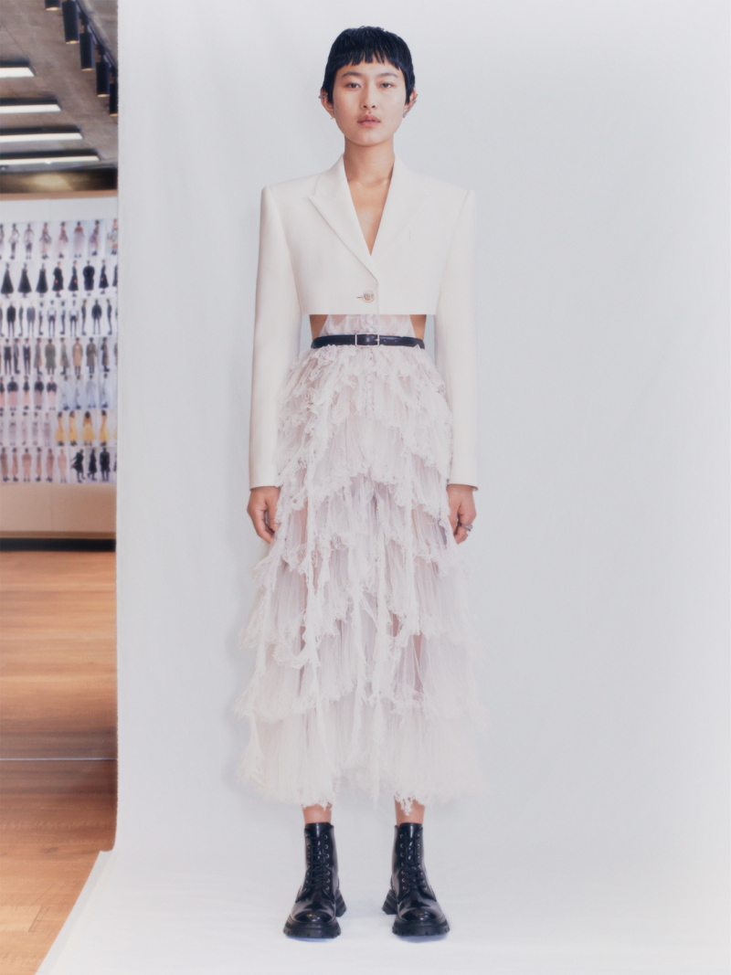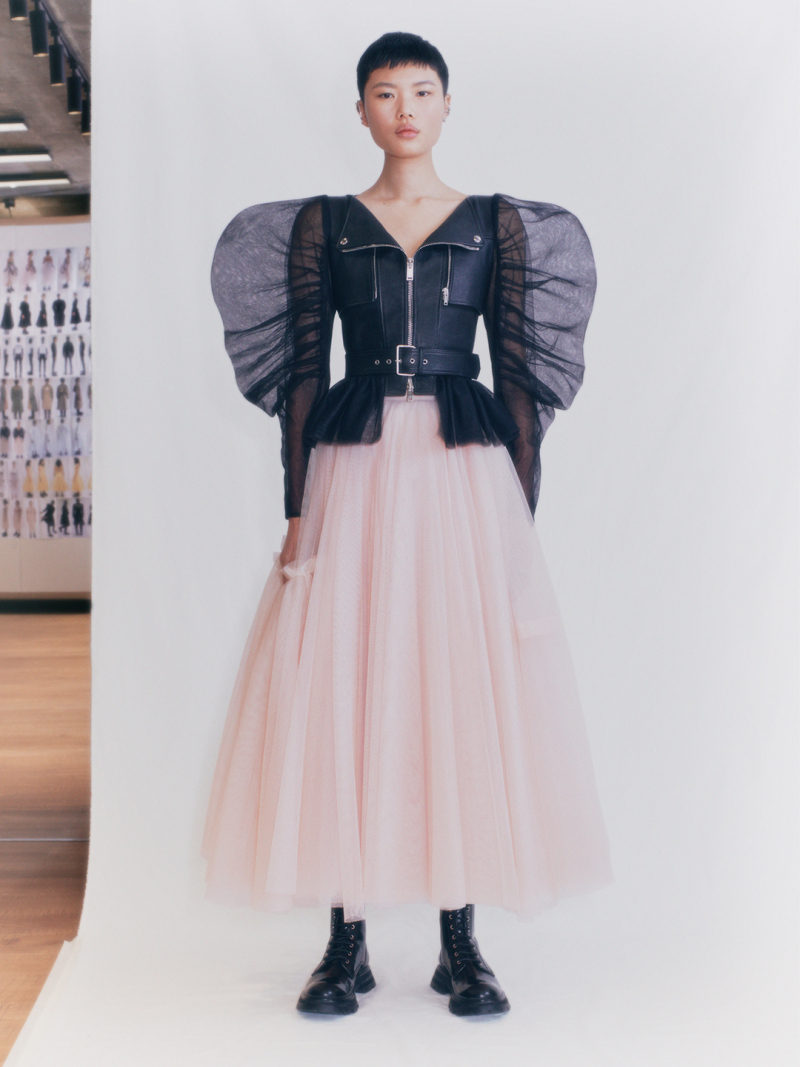 Сара Бертон представила новую коллекцию сезона весна-лето – 2021 для Alexander McQueen. В коллекцию вошли платья и блузы с плечами-коконами, драпированными в форме крыльев бабочки, а также платья из тонкого тюля, с корсетными топами, длинными пышными юбками балерины и платье с воздушными слоями тюля, похожими на облако сахарной ваты; джинсовые и кожаные байкерские куртки, плащи и пальто, бомберы, брюки, спортивные костюмы.