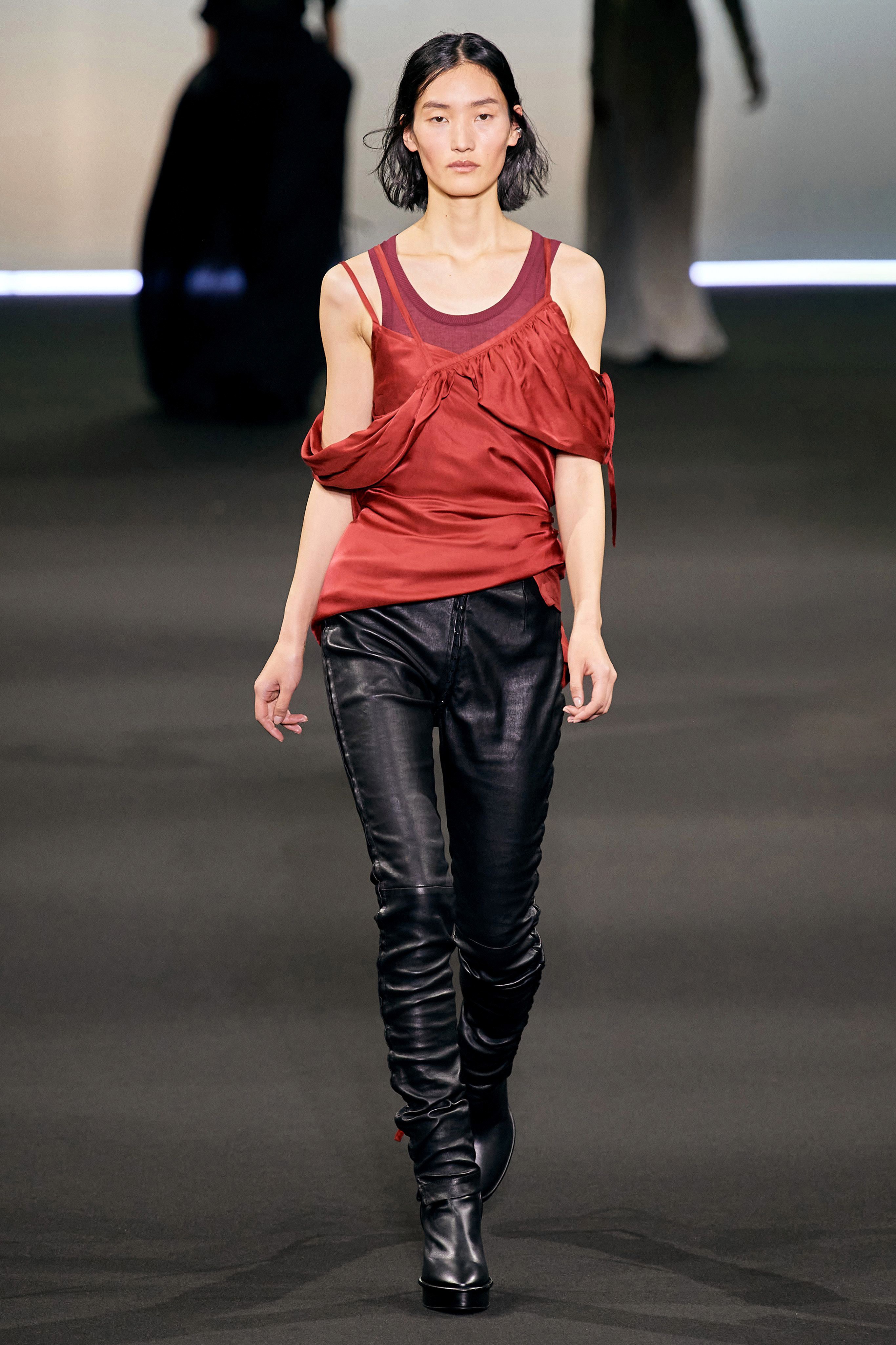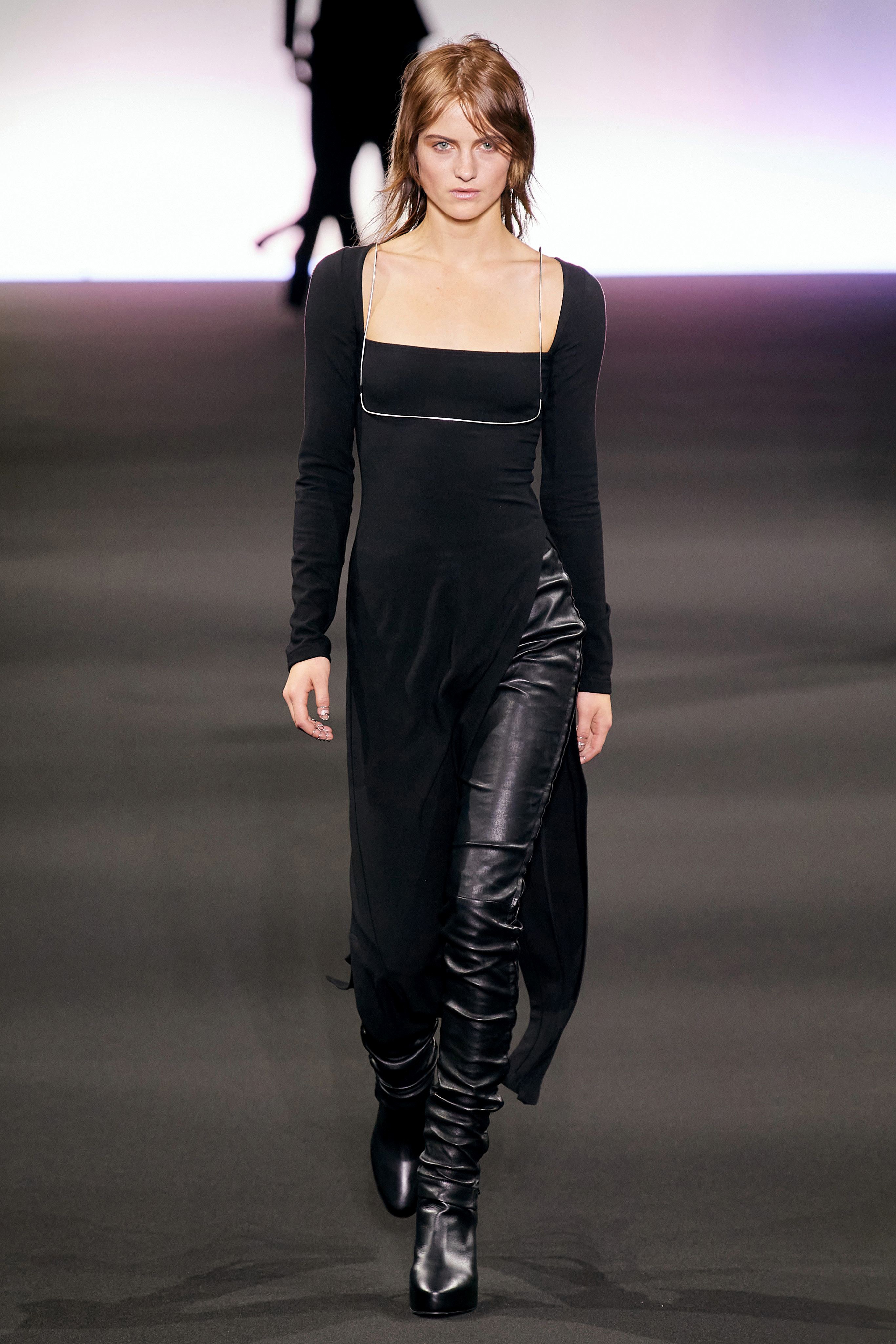 На что обратить внимание: проволочные украшения, бархатный халат, сочетание кожи и золотого жаккарда, майка с принтом в виде гравюры с единорогом, тонкое вечернее платье поверх кожаных брюк.
