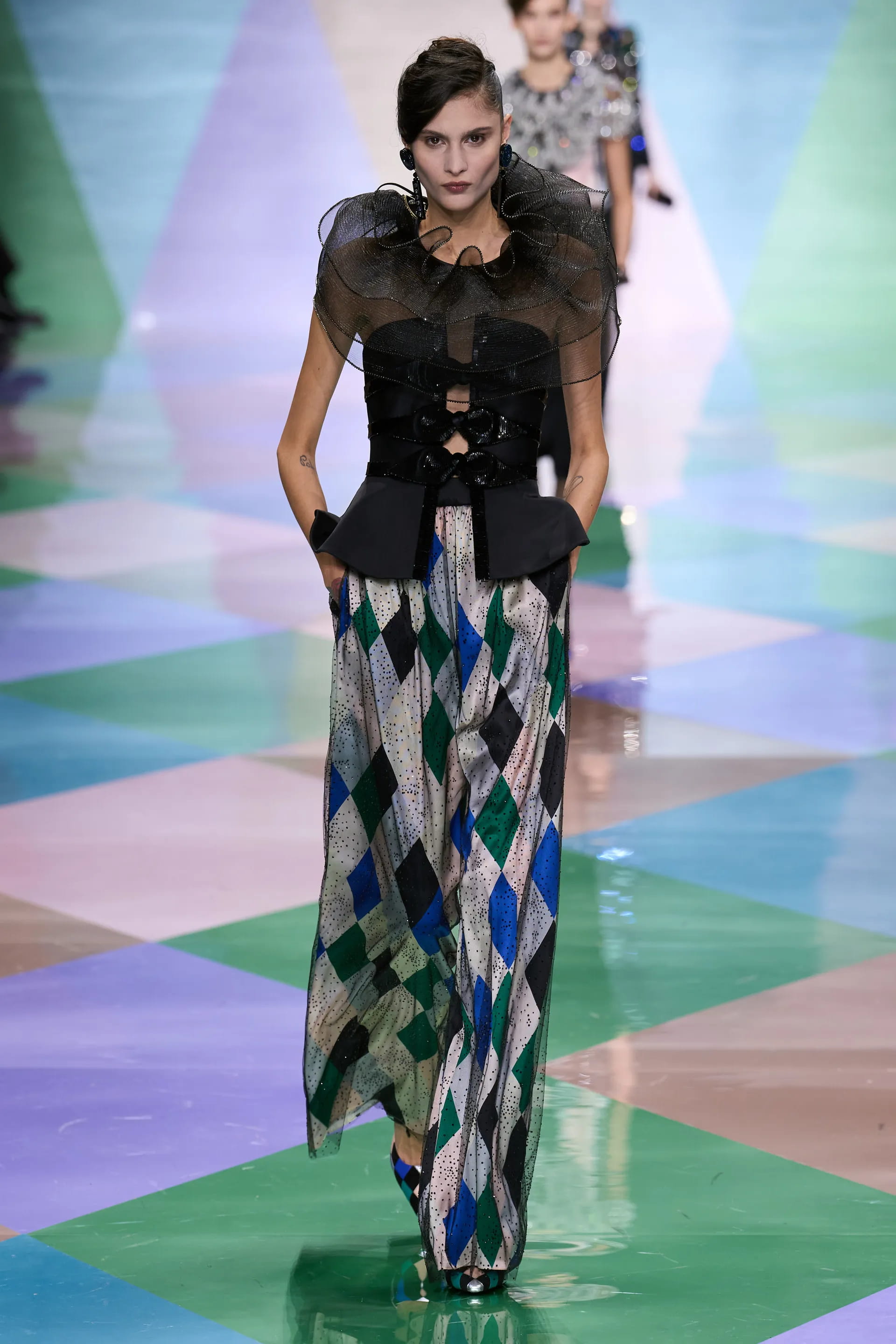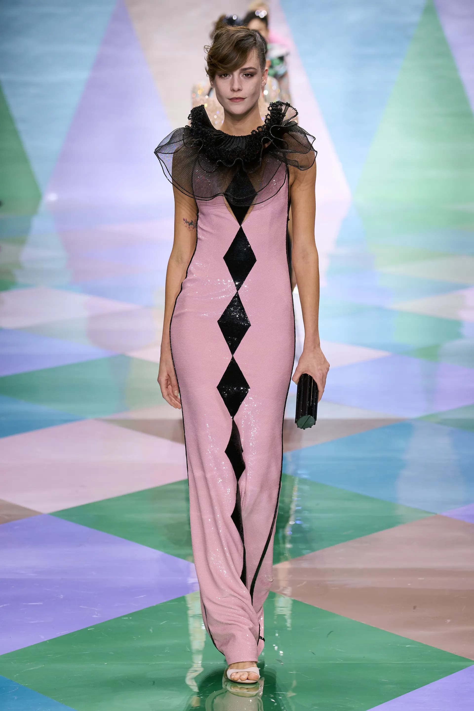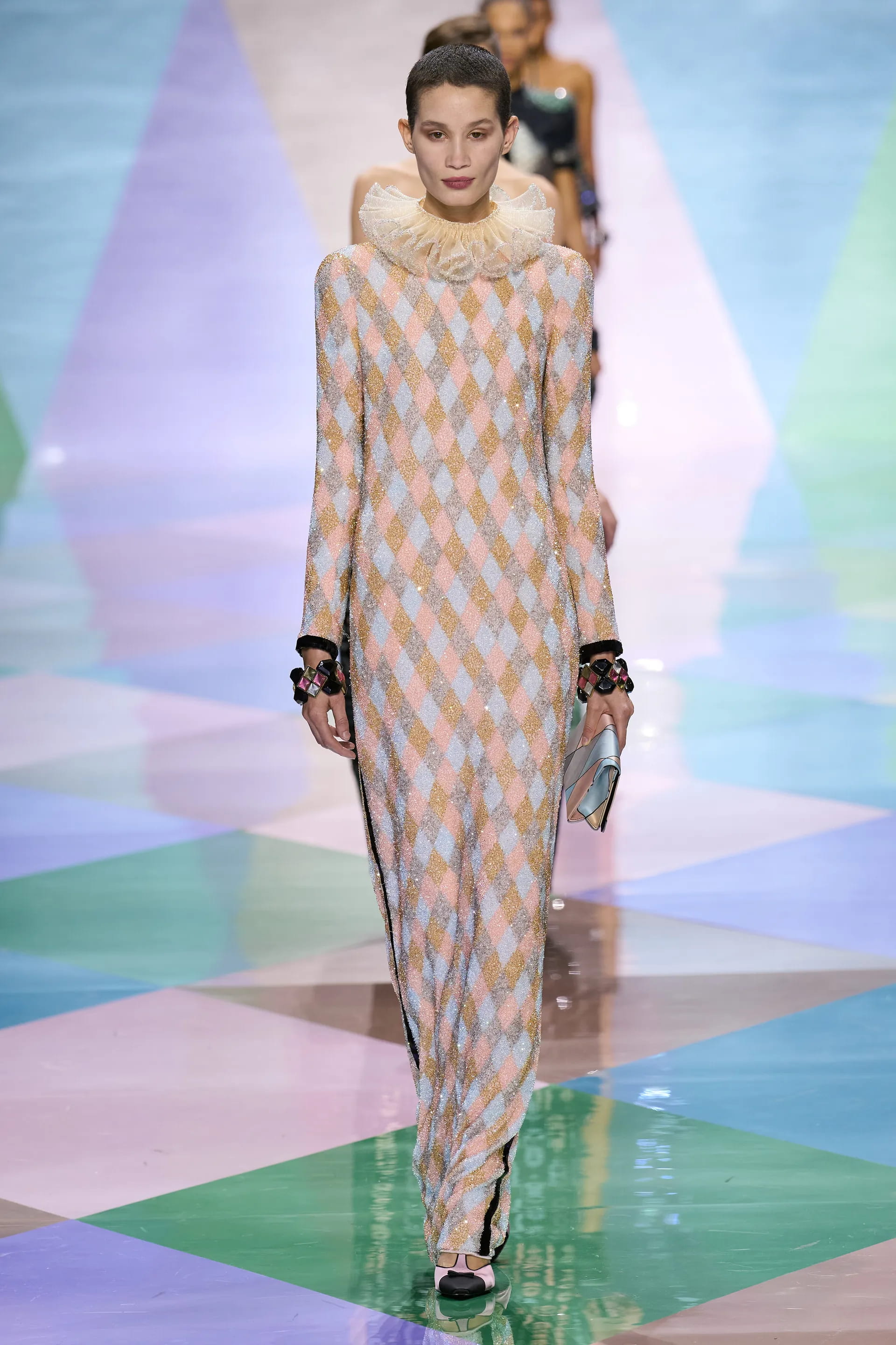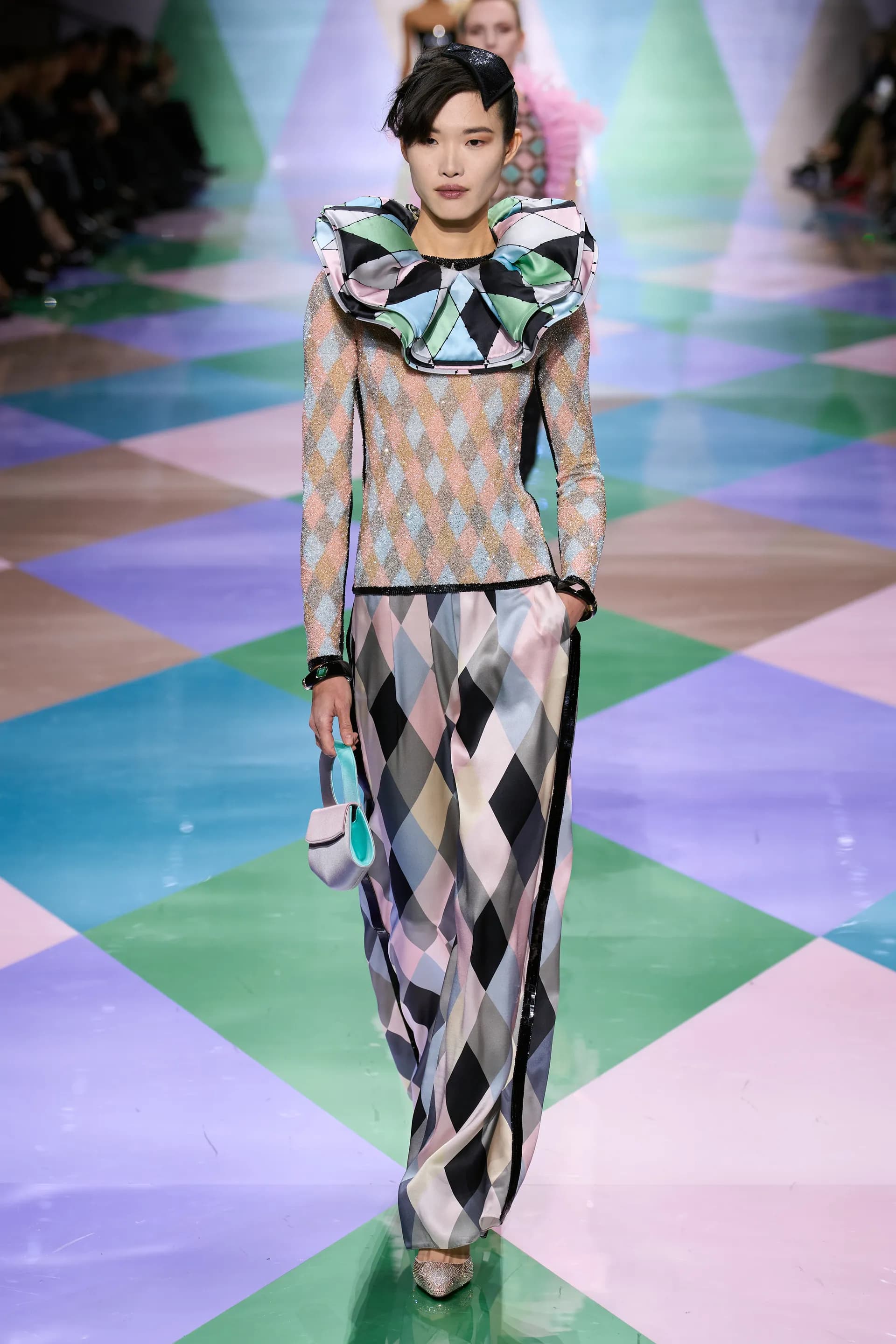 Модний дім створив арлекініану зі своїми яскравими кольорами, комірцями-фрезами, розшитими, напів ювелірними піджаками та простими силуетами довгого крою у тканині, фактура якої буквально сама створює гру з тілом.