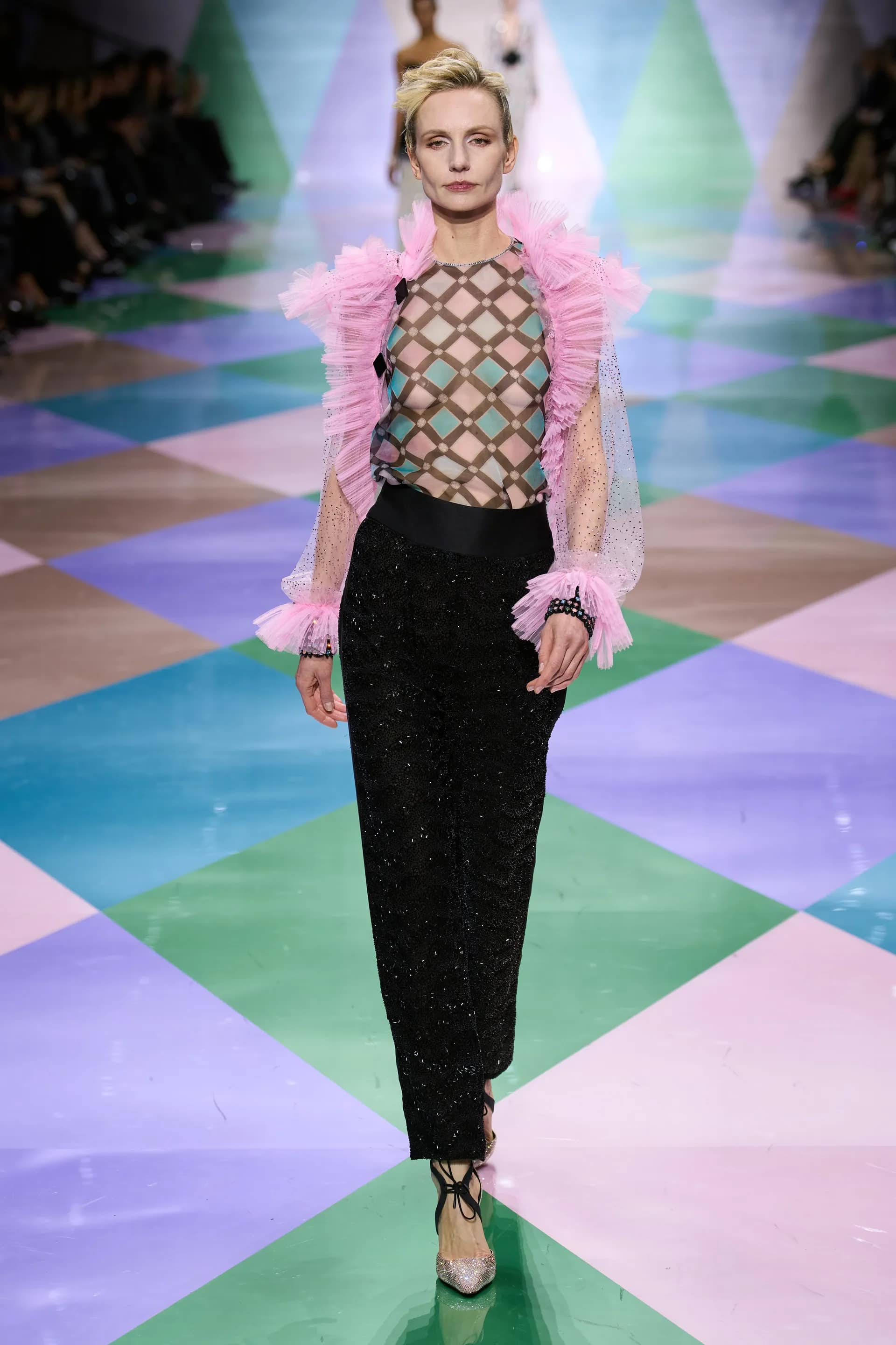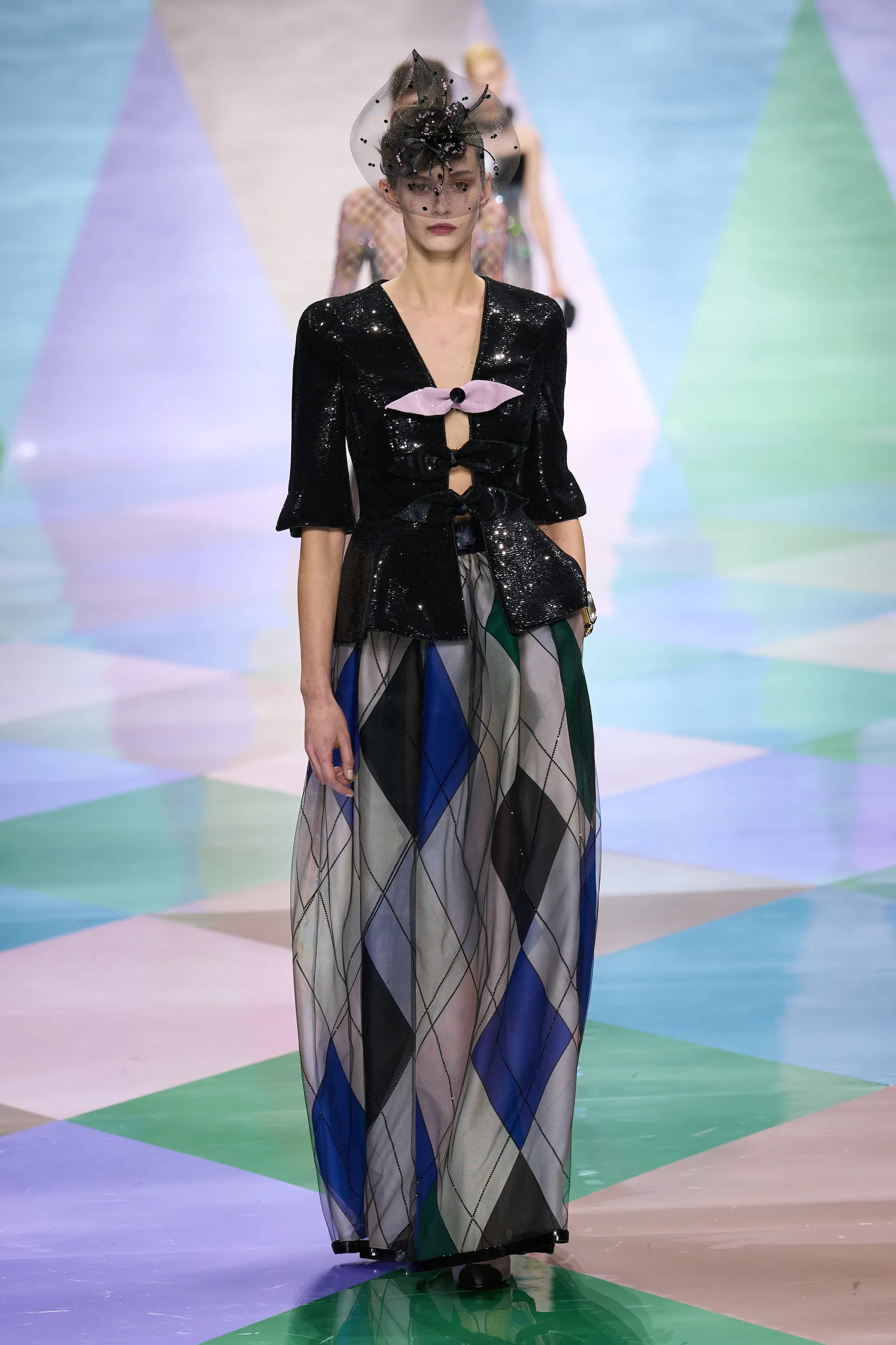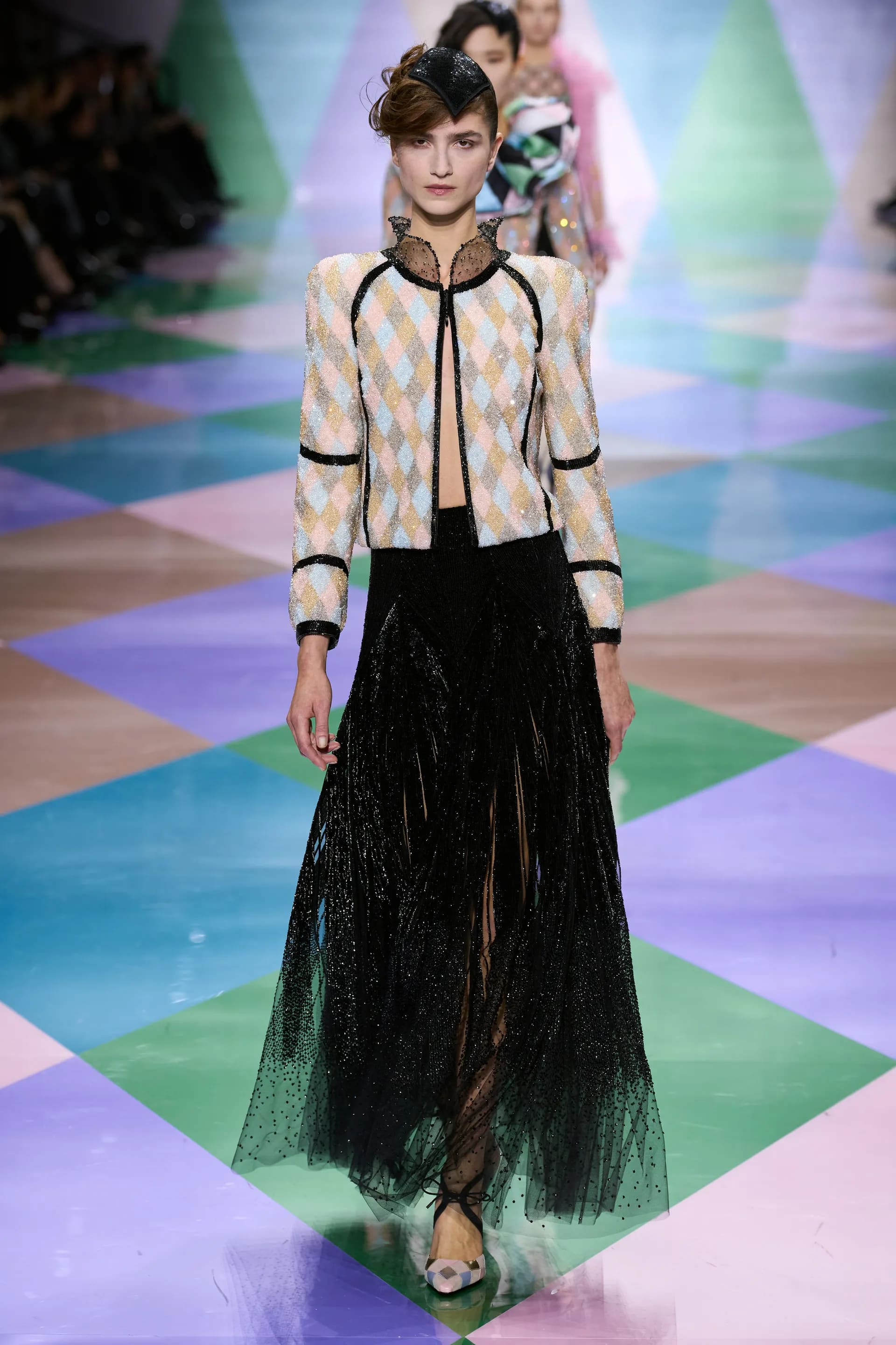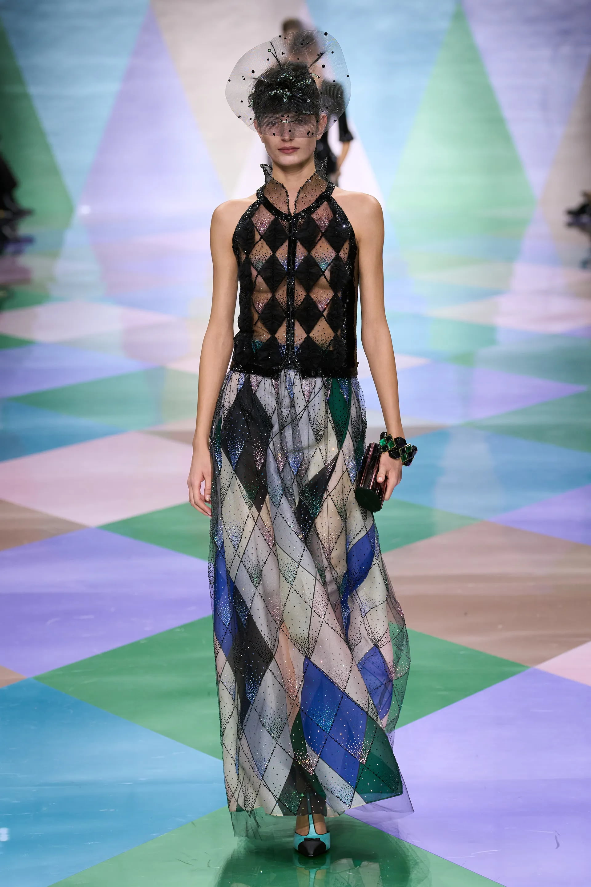 Модний дім створив арлекініану зі своїми яскравими кольорами, комірцями-фрезами, розшитими, напів ювелірними піджаками та простими силуетами довгого крою у тканині, фактура якої буквально сама створює гру з тілом.