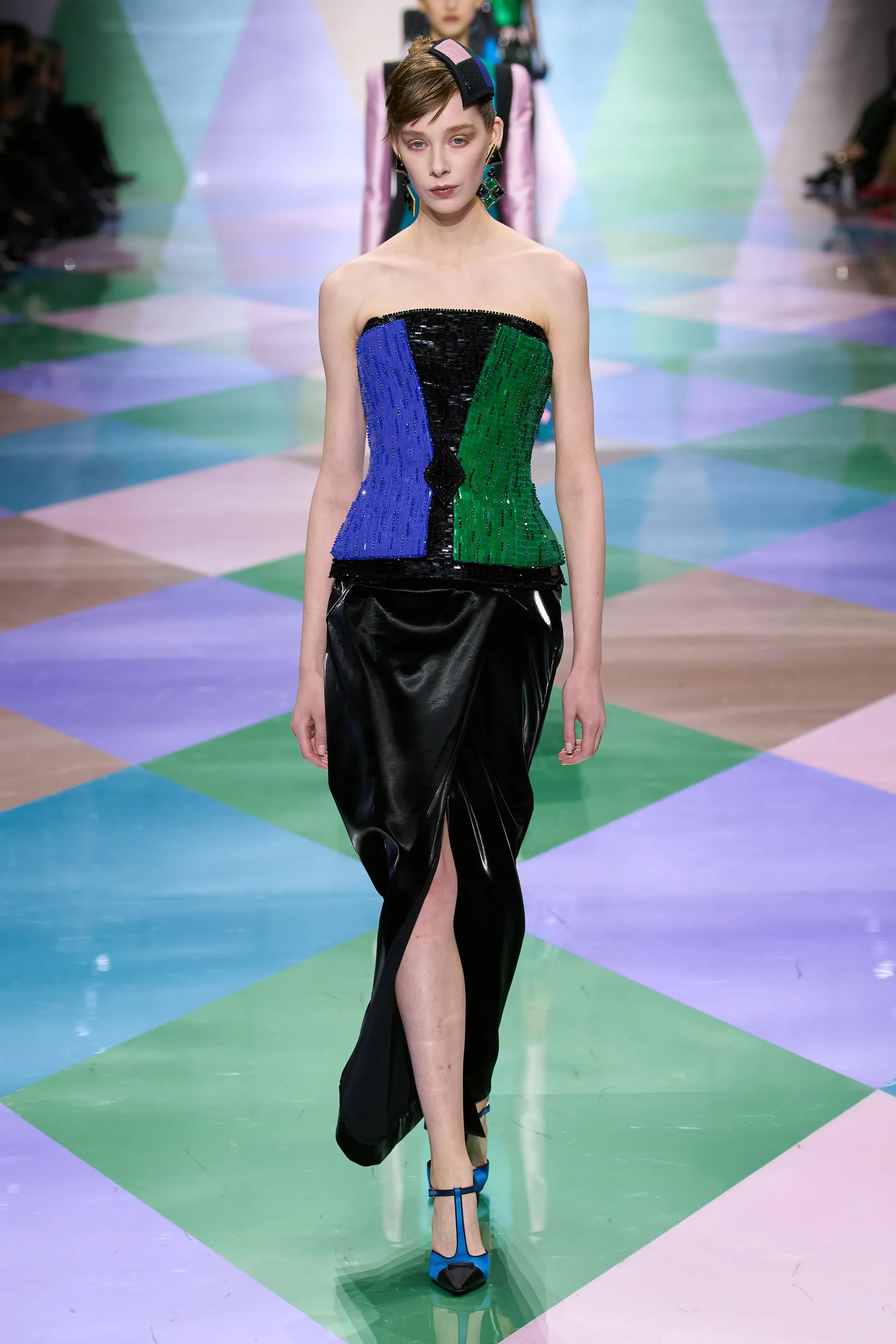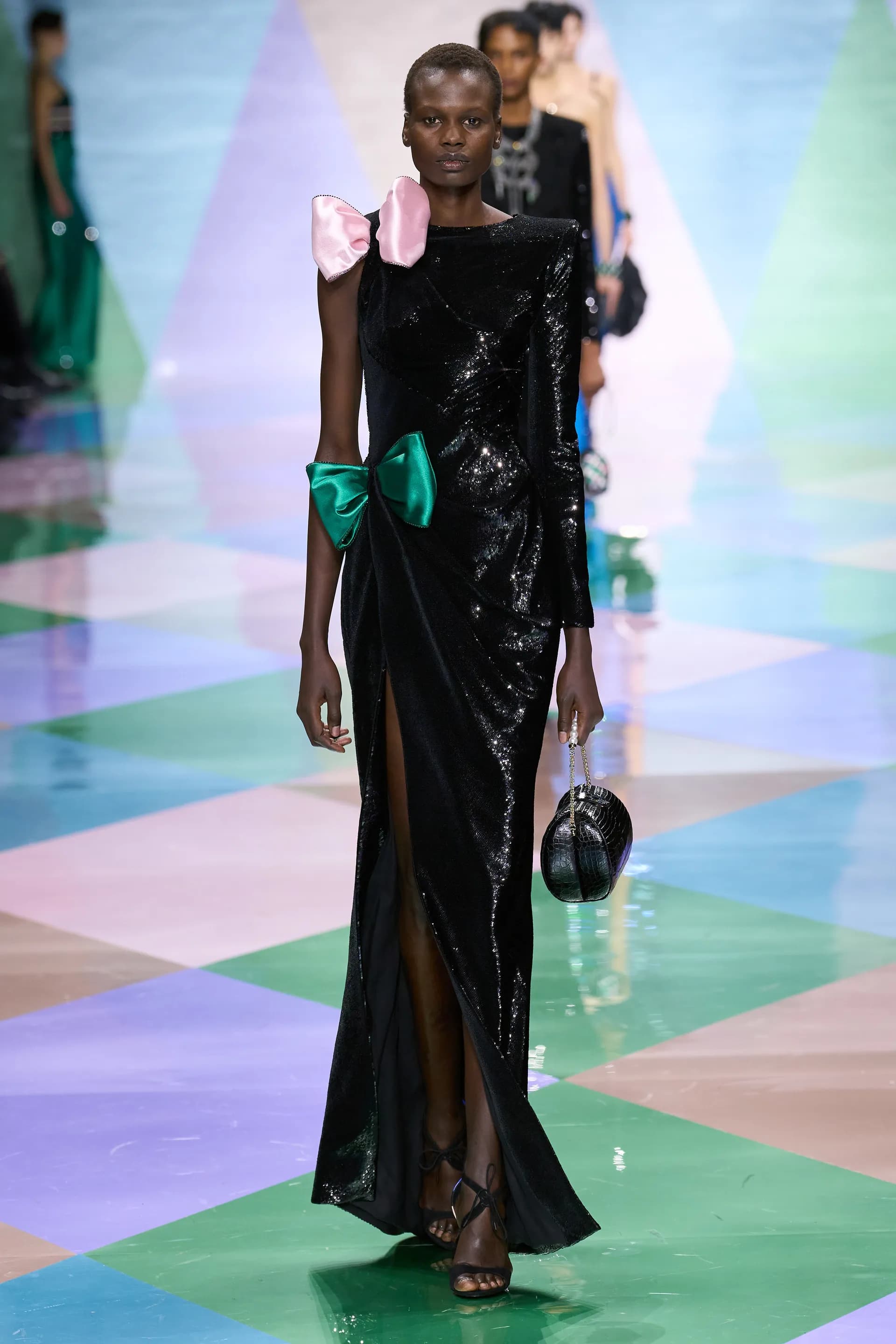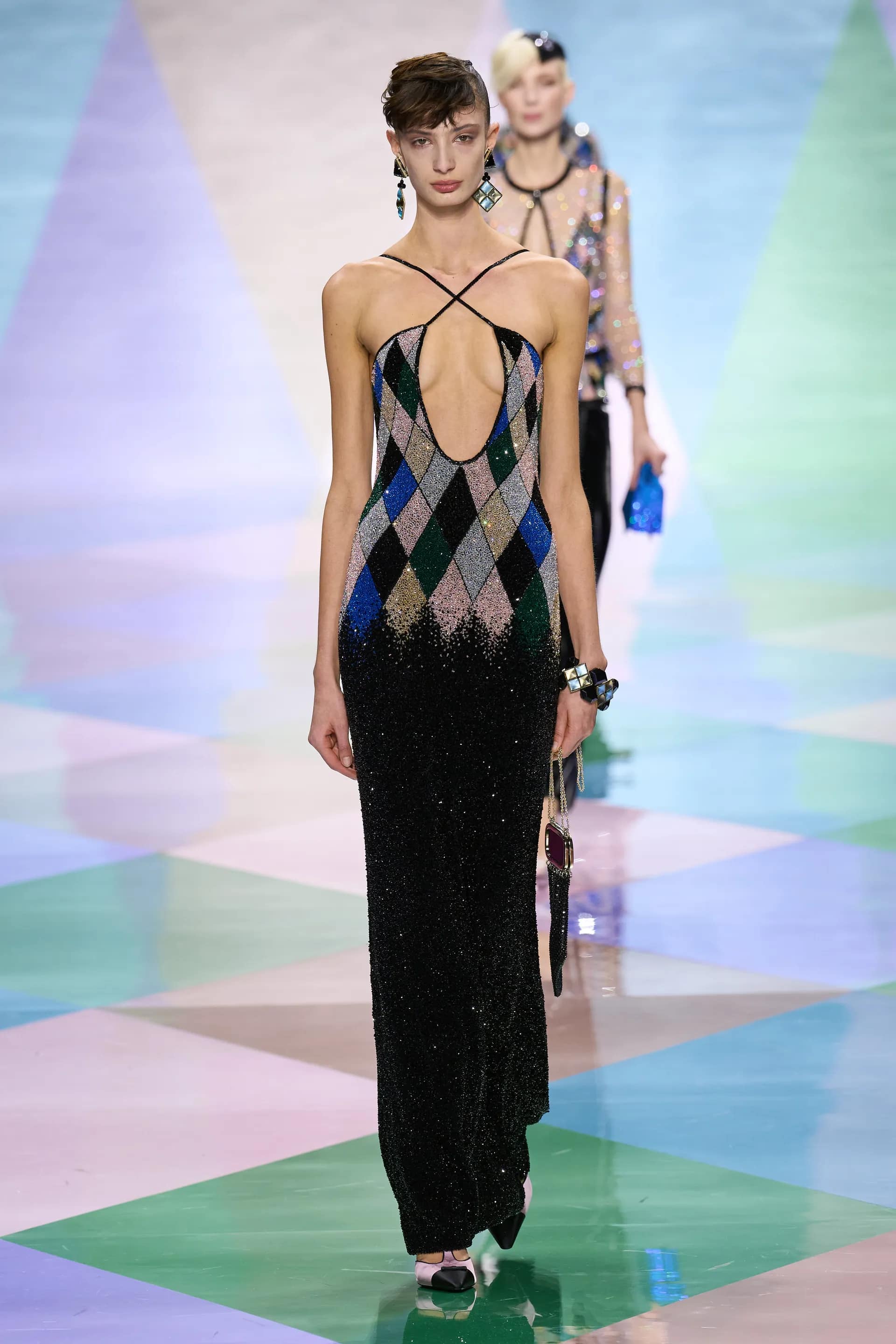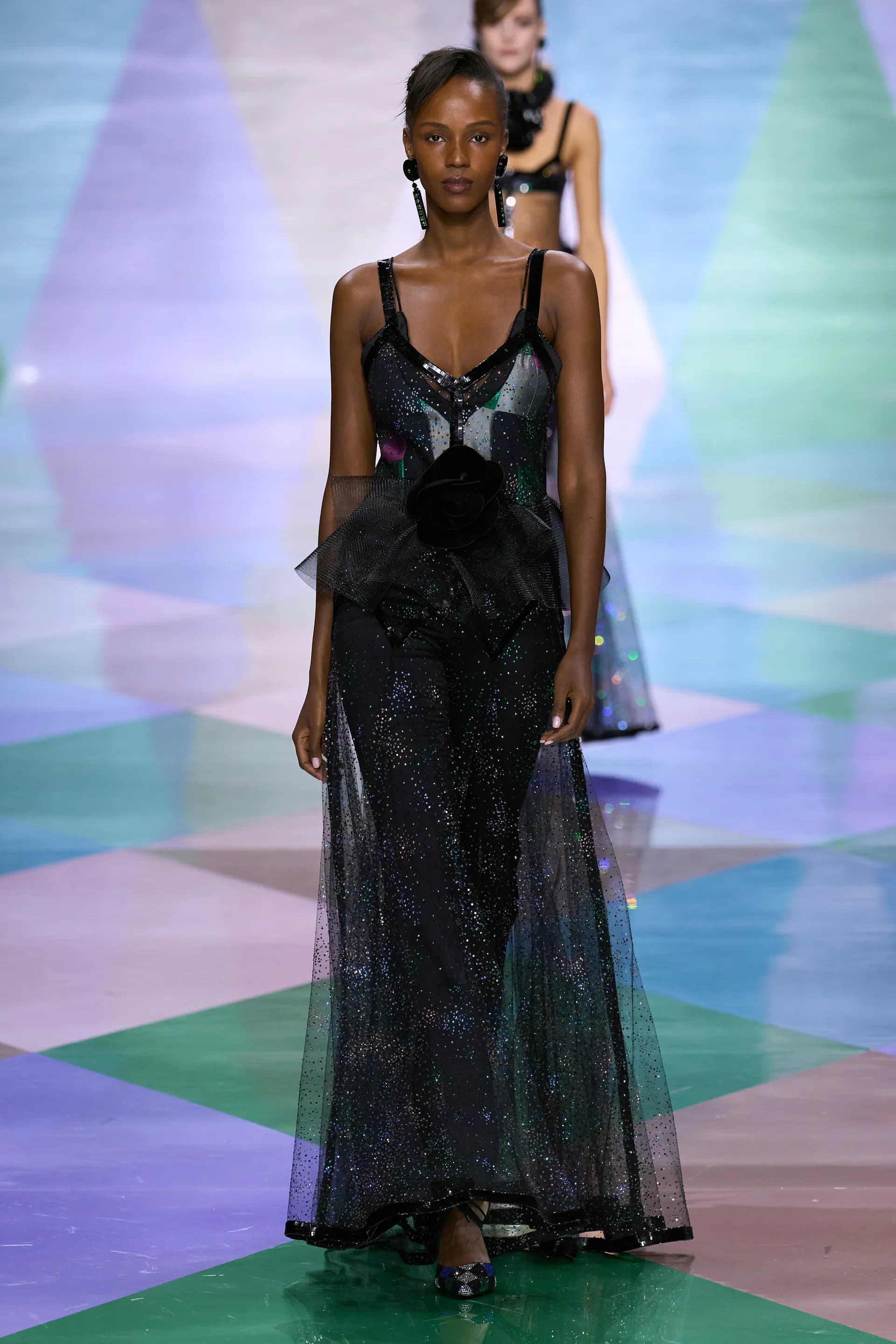 Модний дім створив арлекініану зі своїми яскравими кольорами, комірцями-фрезами, розшитими, напів ювелірними піджаками та простими силуетами довгого крою у тканині, фактура якої буквально сама створює гру з тілом.
