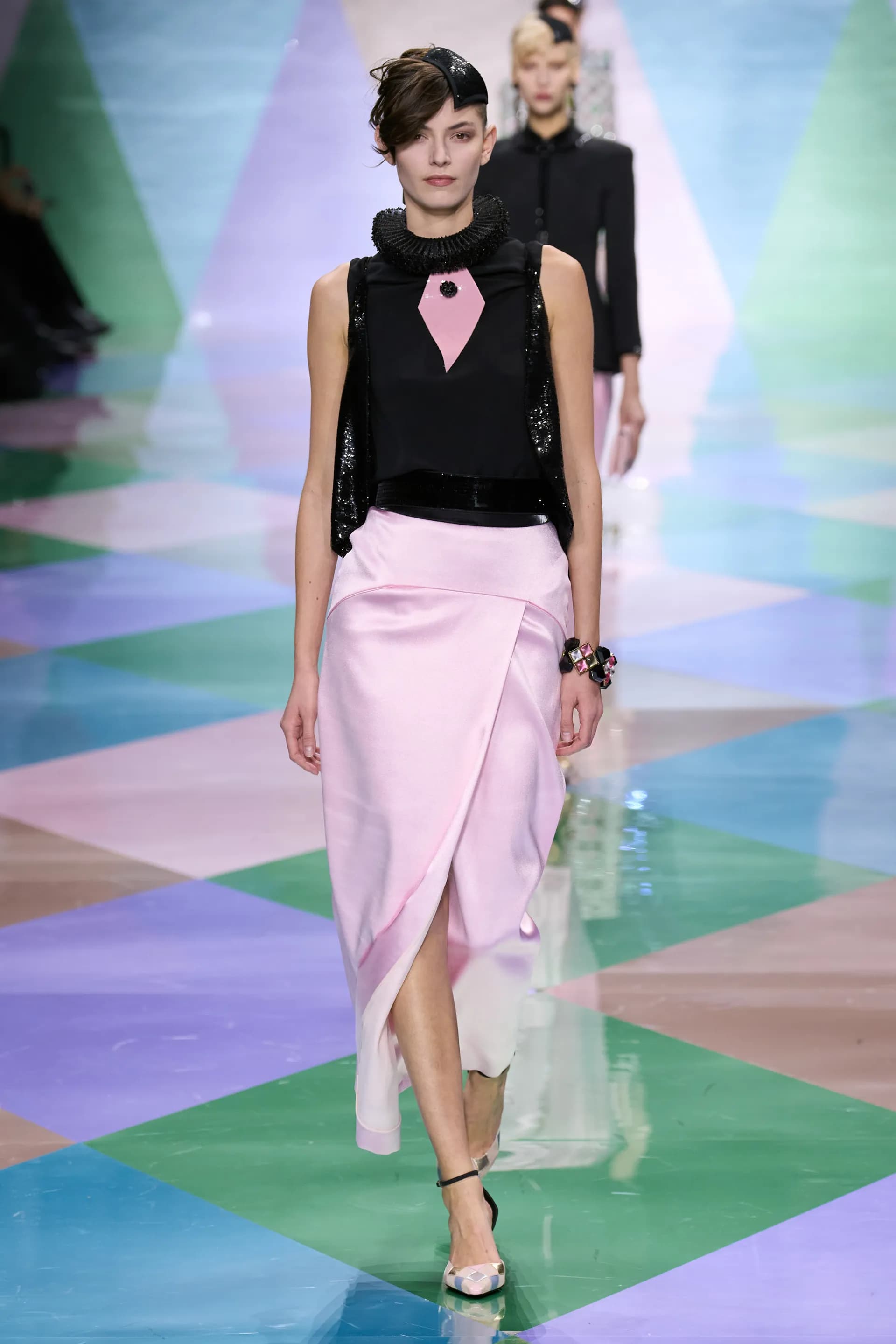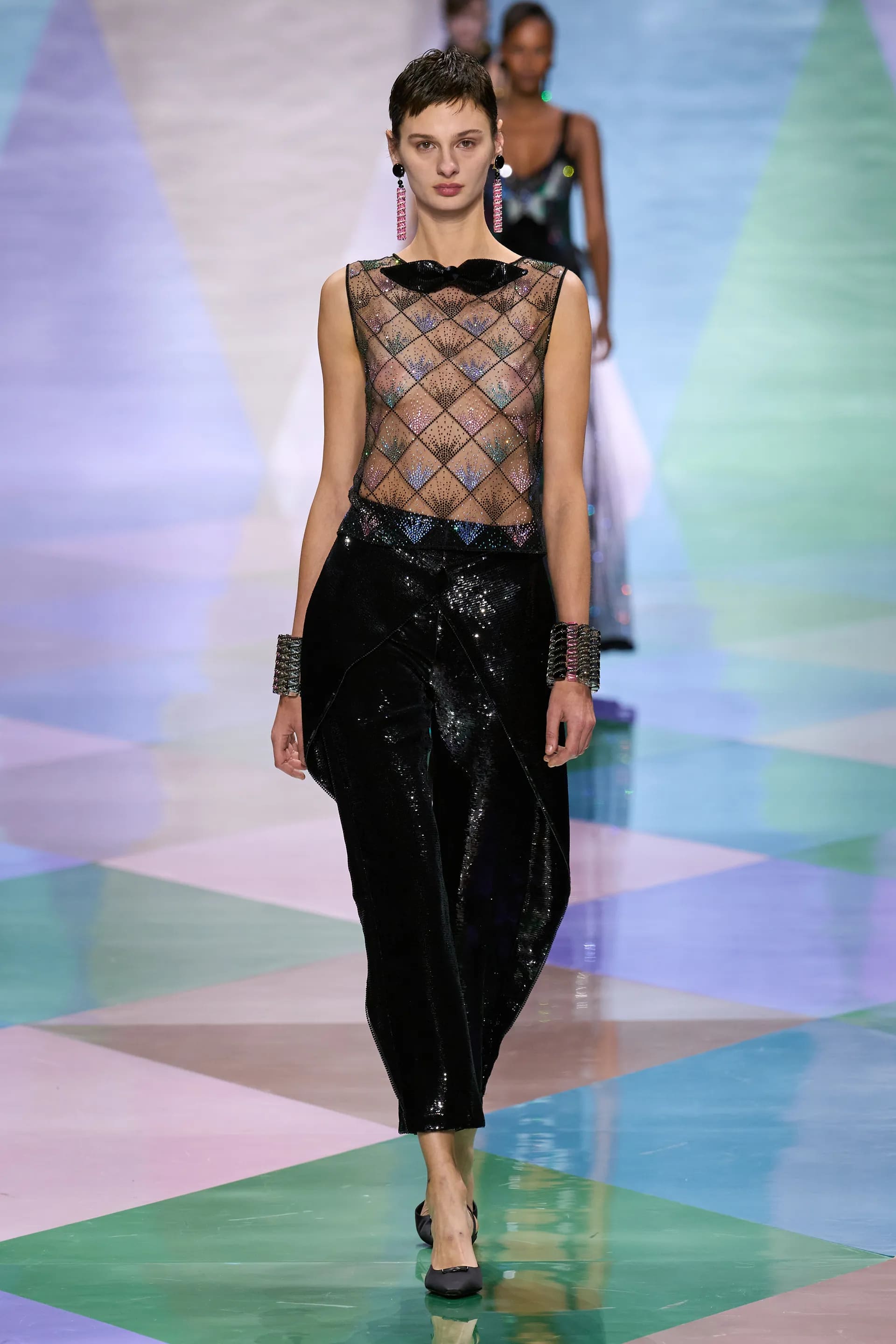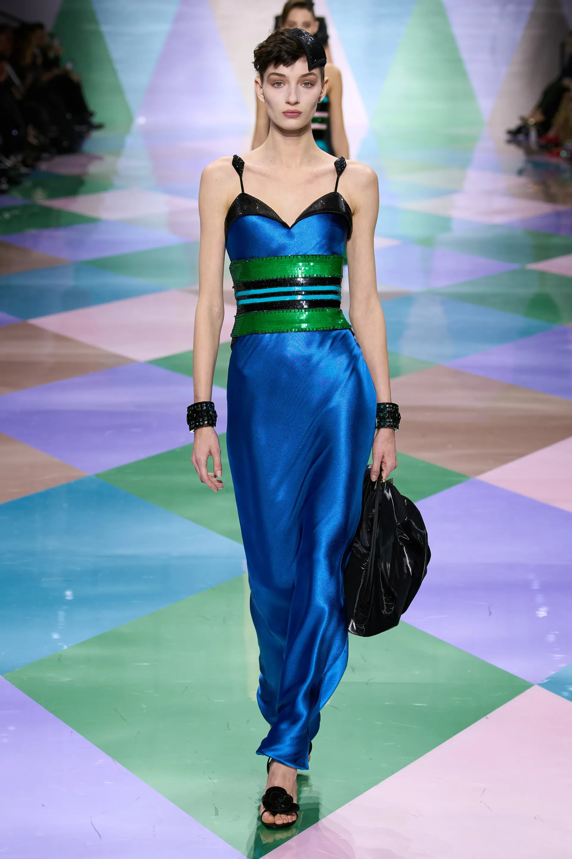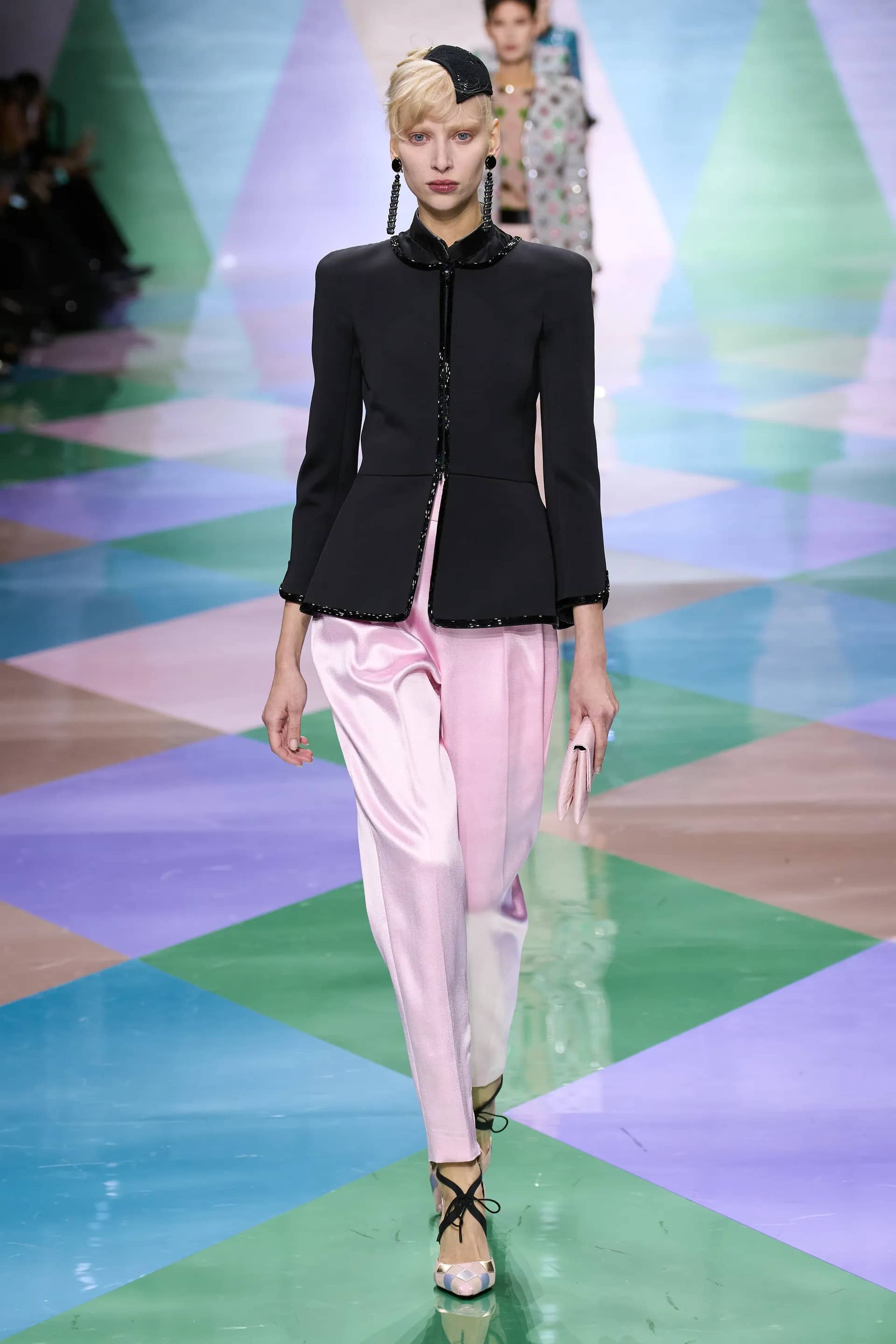 Модний дім створив арлекініану зі своїми яскравими кольорами, комірцями-фрезами, розшитими, напів ювелірними піджаками та простими силуетами довгого крою у тканині, фактура якої буквально сама створює гру з тілом.