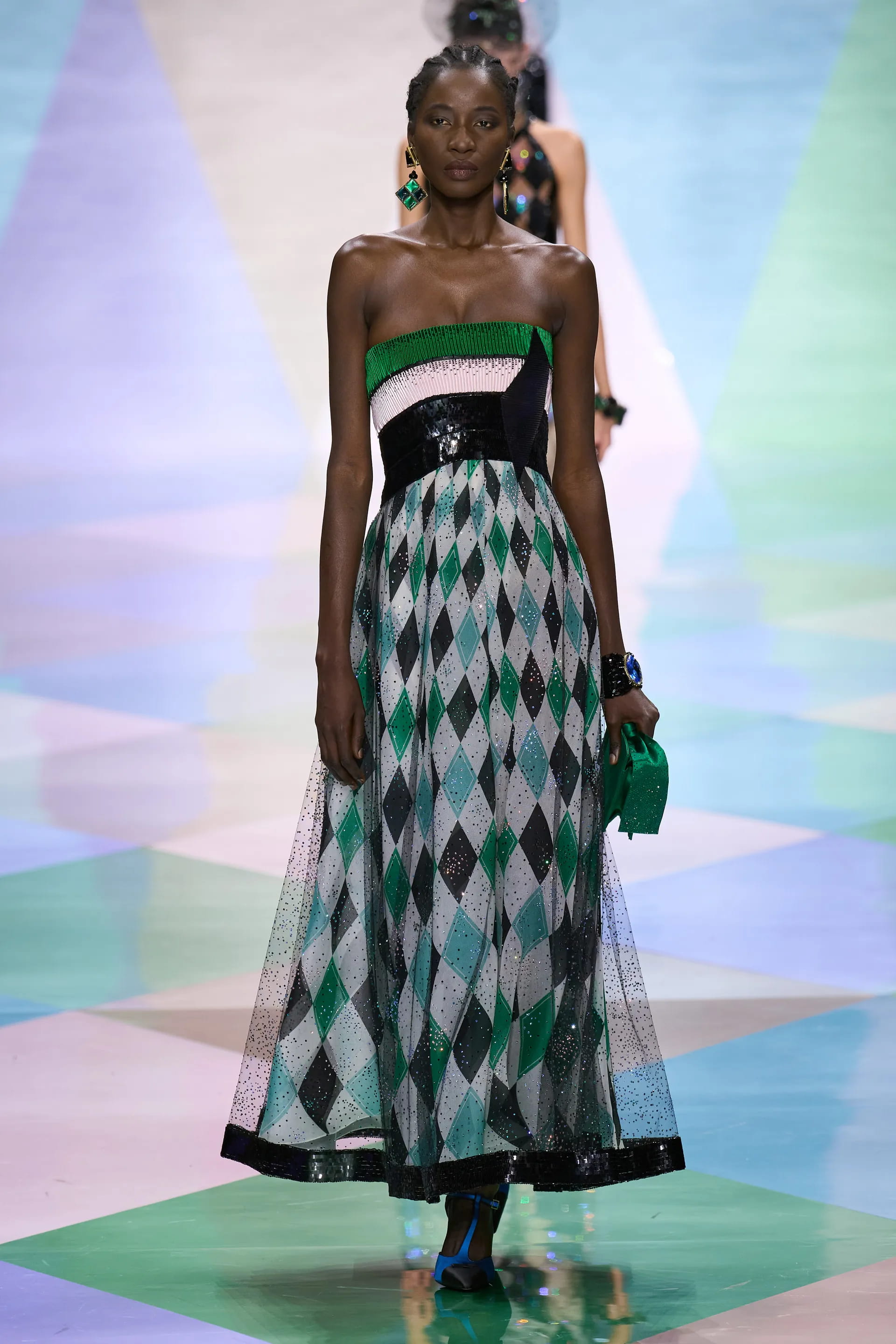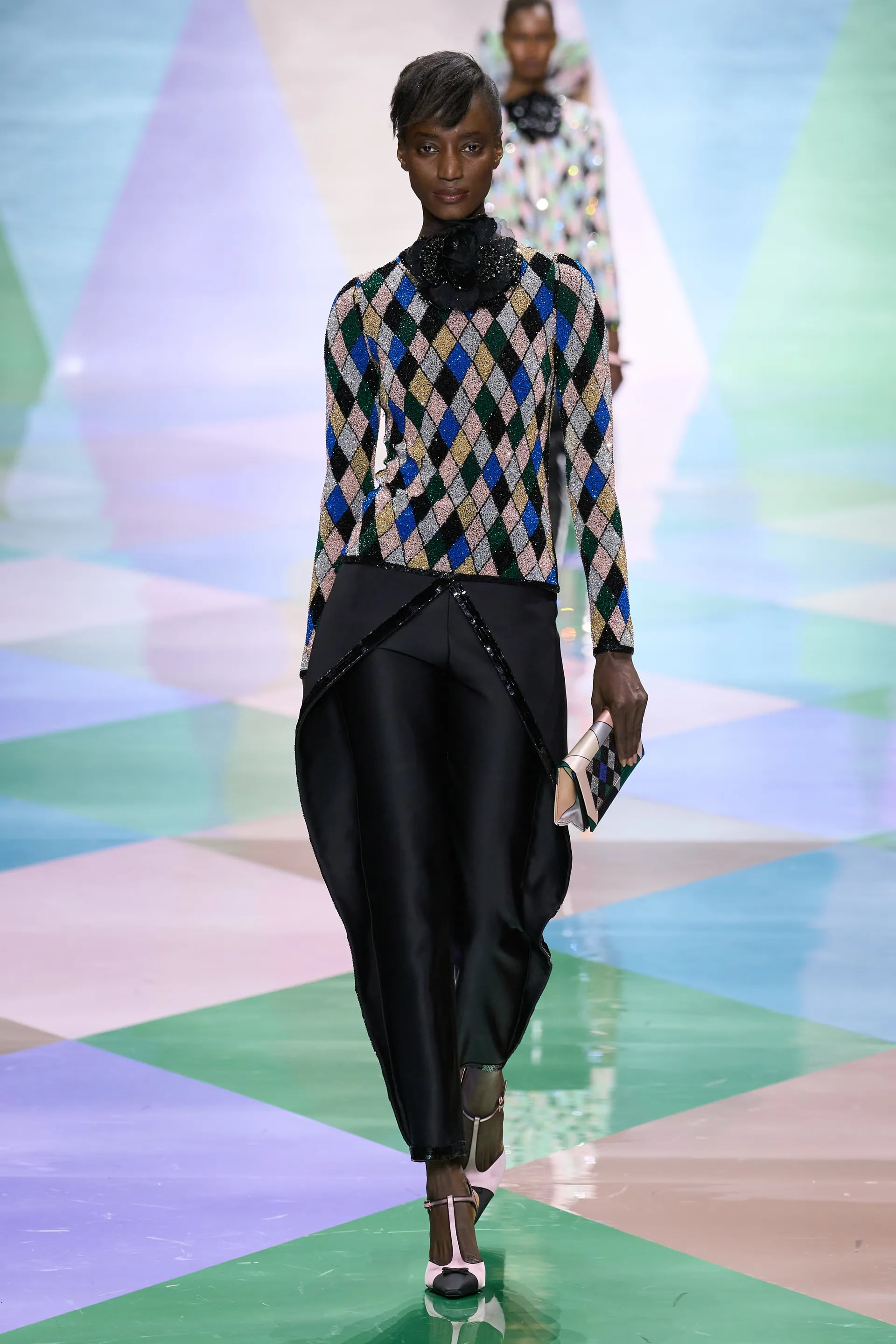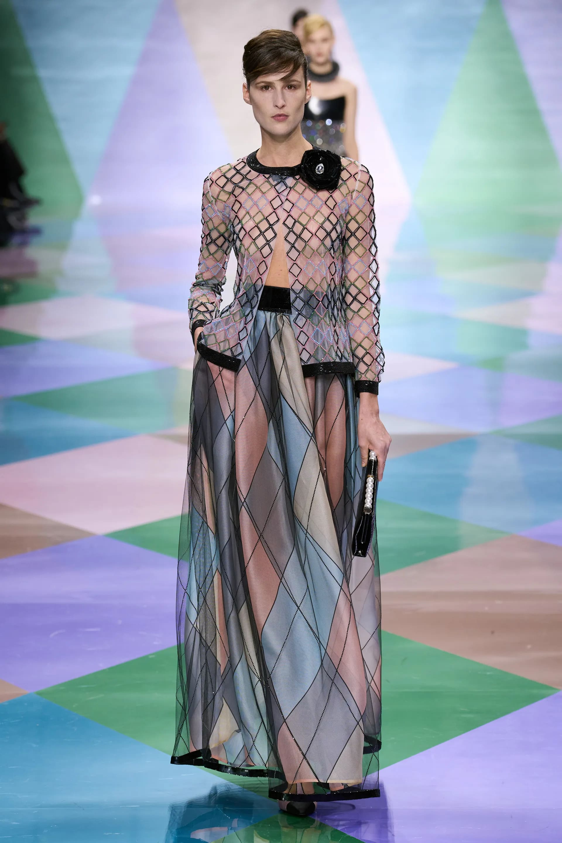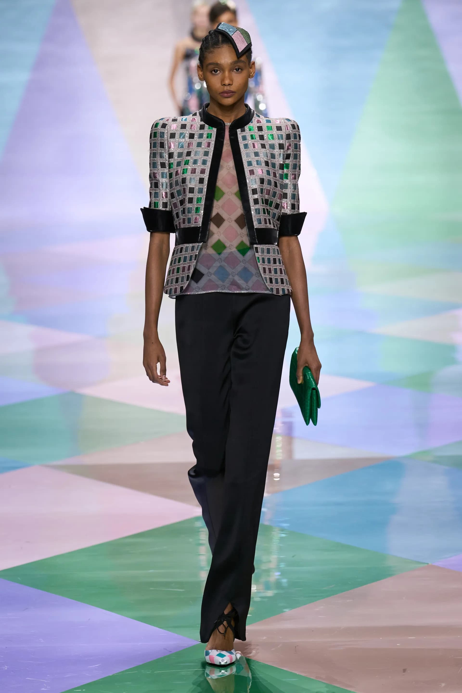 Armani Haute Couture SS ‘23 — це дуже грайлива, яскрава історія, де натхнення йде не лише від відчуття міста, а й від самої фантазії дизайнера. Дім моди зазначає, що “ця колекція — яскрава фантазія, у якій речі танцюють та сяють”. І дійсно, діамантовий шик задає показу особливого настрою.