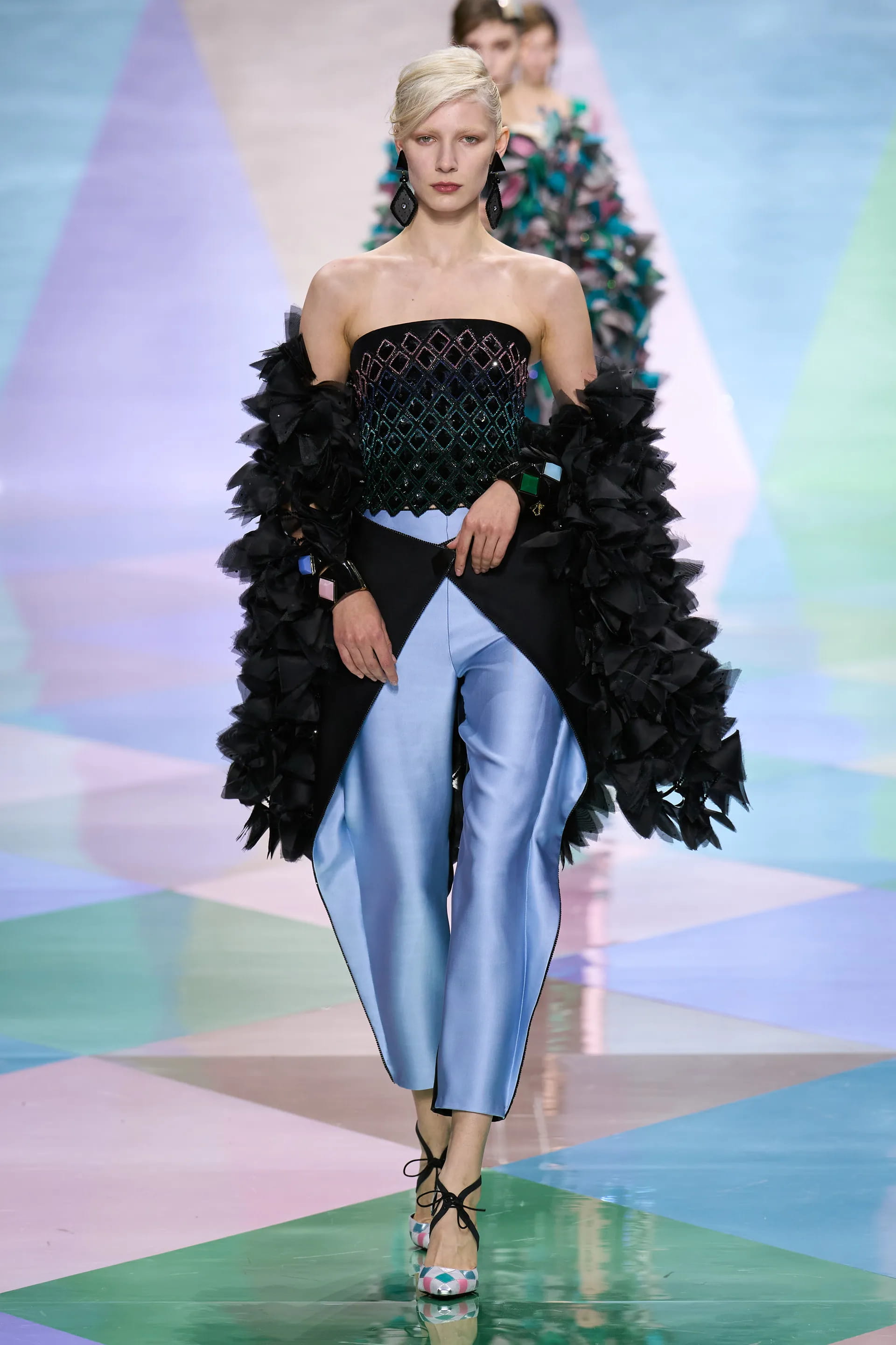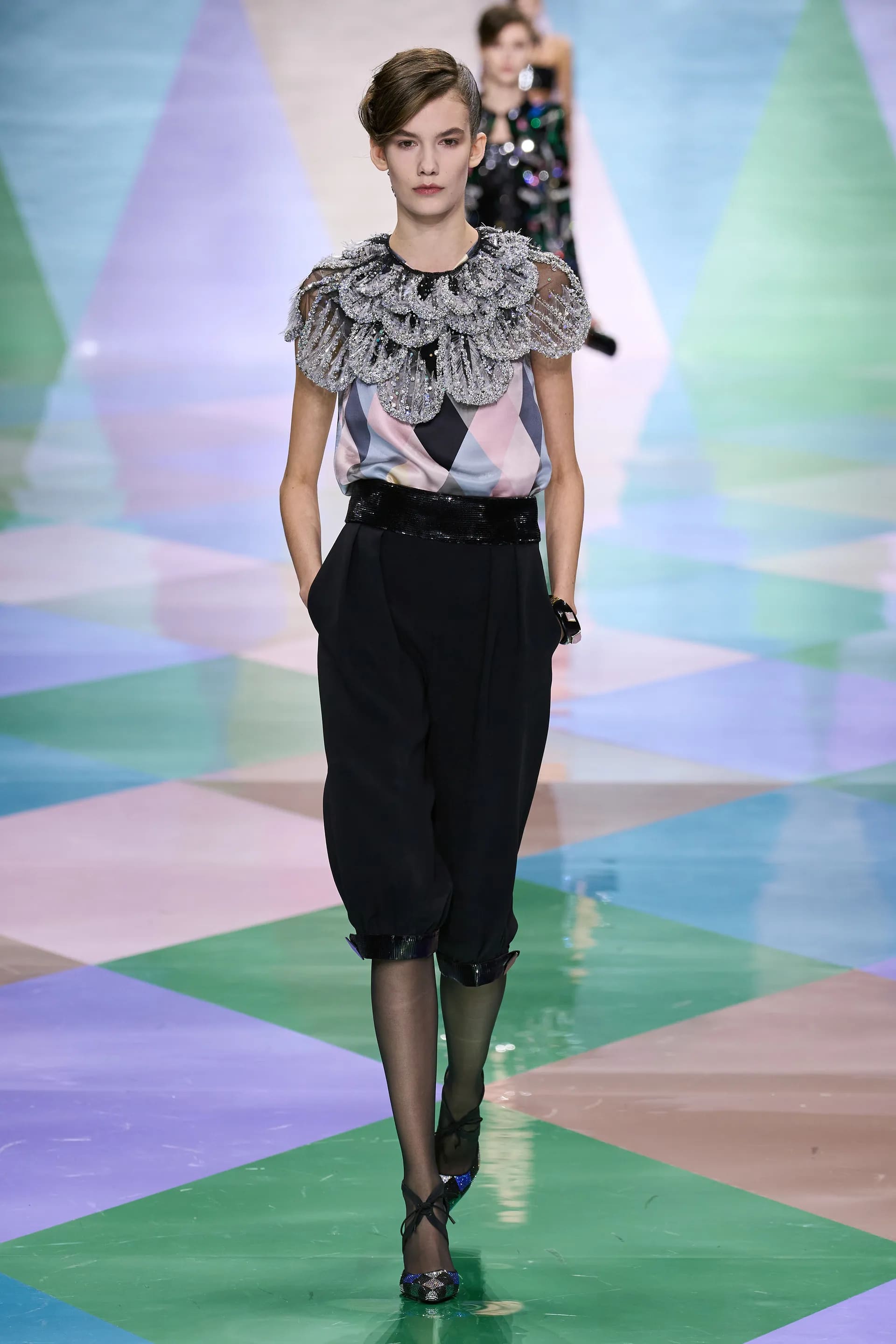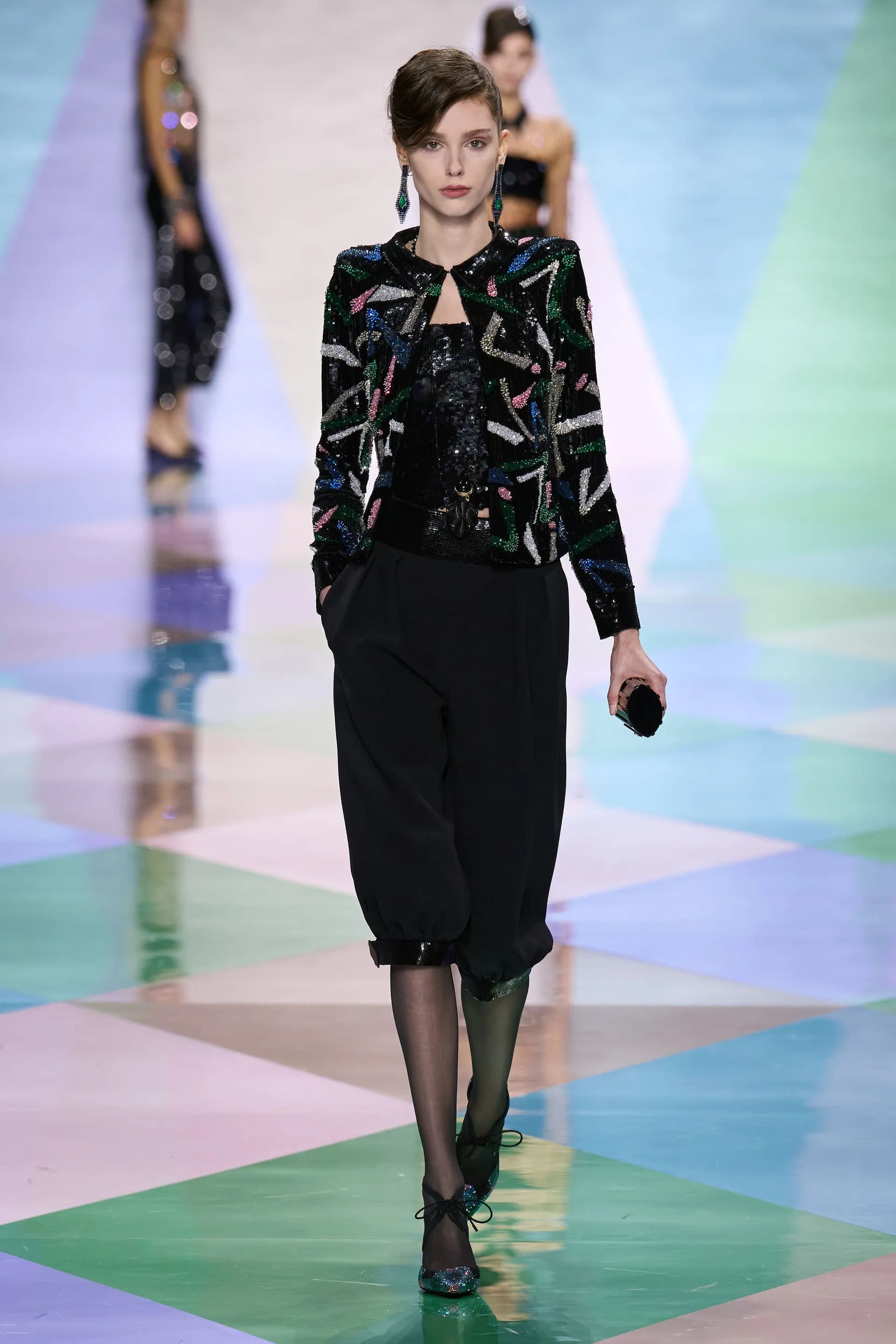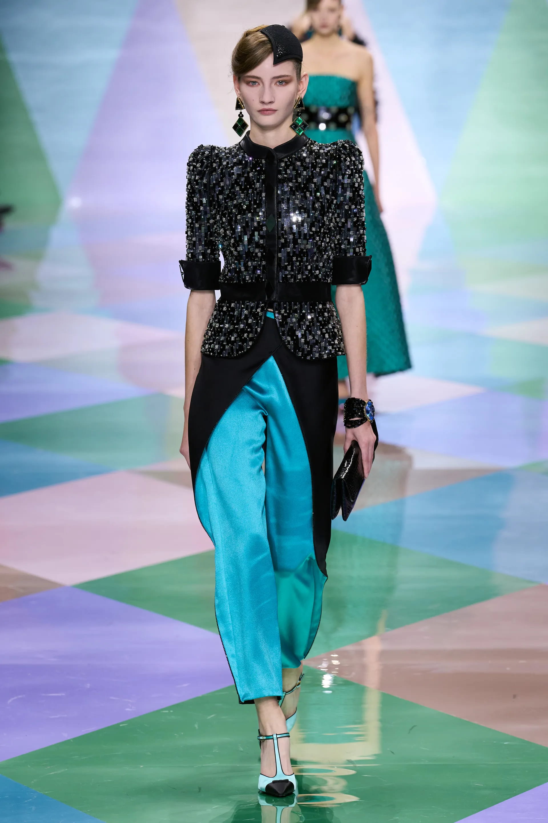Armani Haute Couture SS ‘23 — це дуже грайлива, яскрава історія, де натхнення йде не лише від відчуття міста, а й від самої фантазії дизайнера. Дім моди зазначає, що “ця колекція — яскрава фантазія, у якій речі танцюють та сяють”. І дійсно, діамантовий шик задає показу особливого настрою.