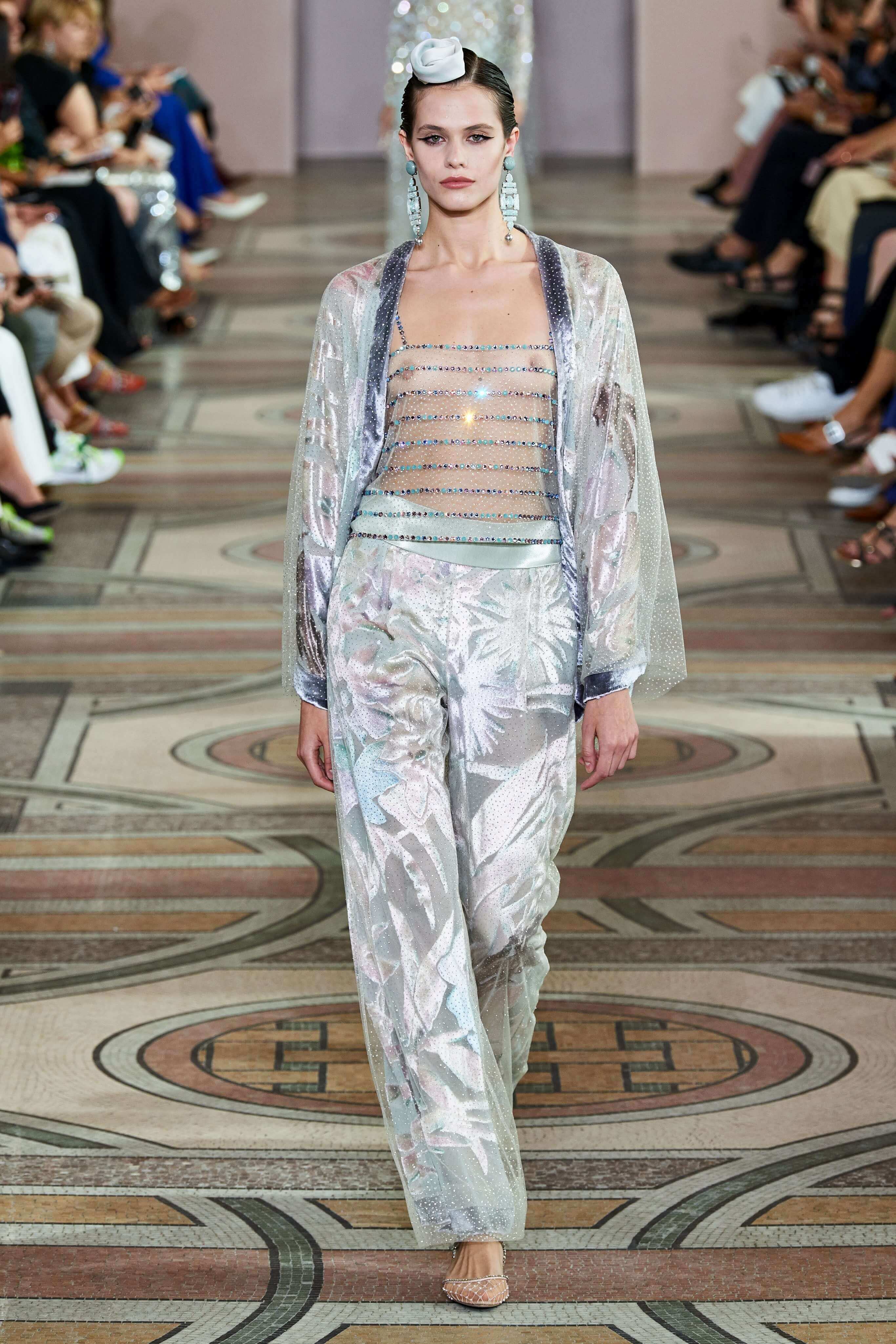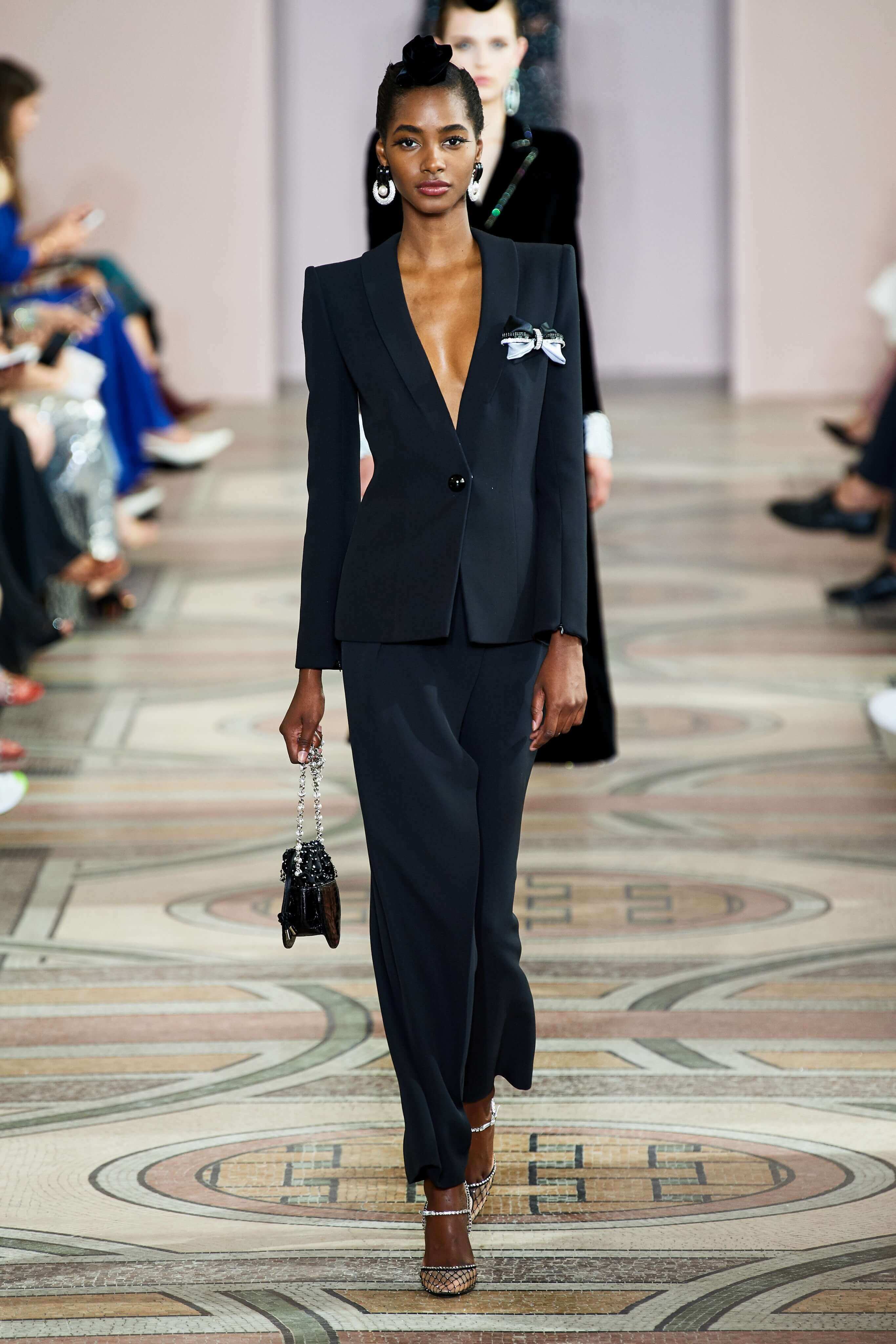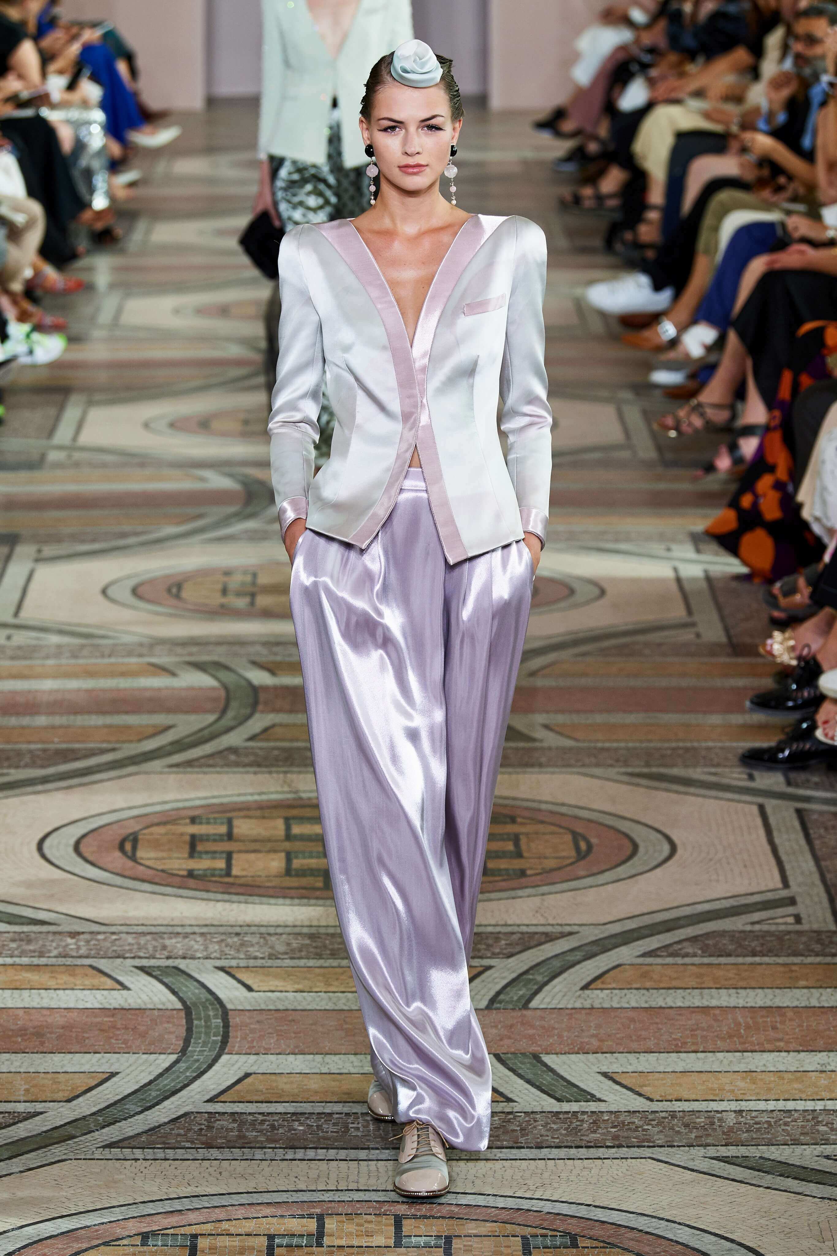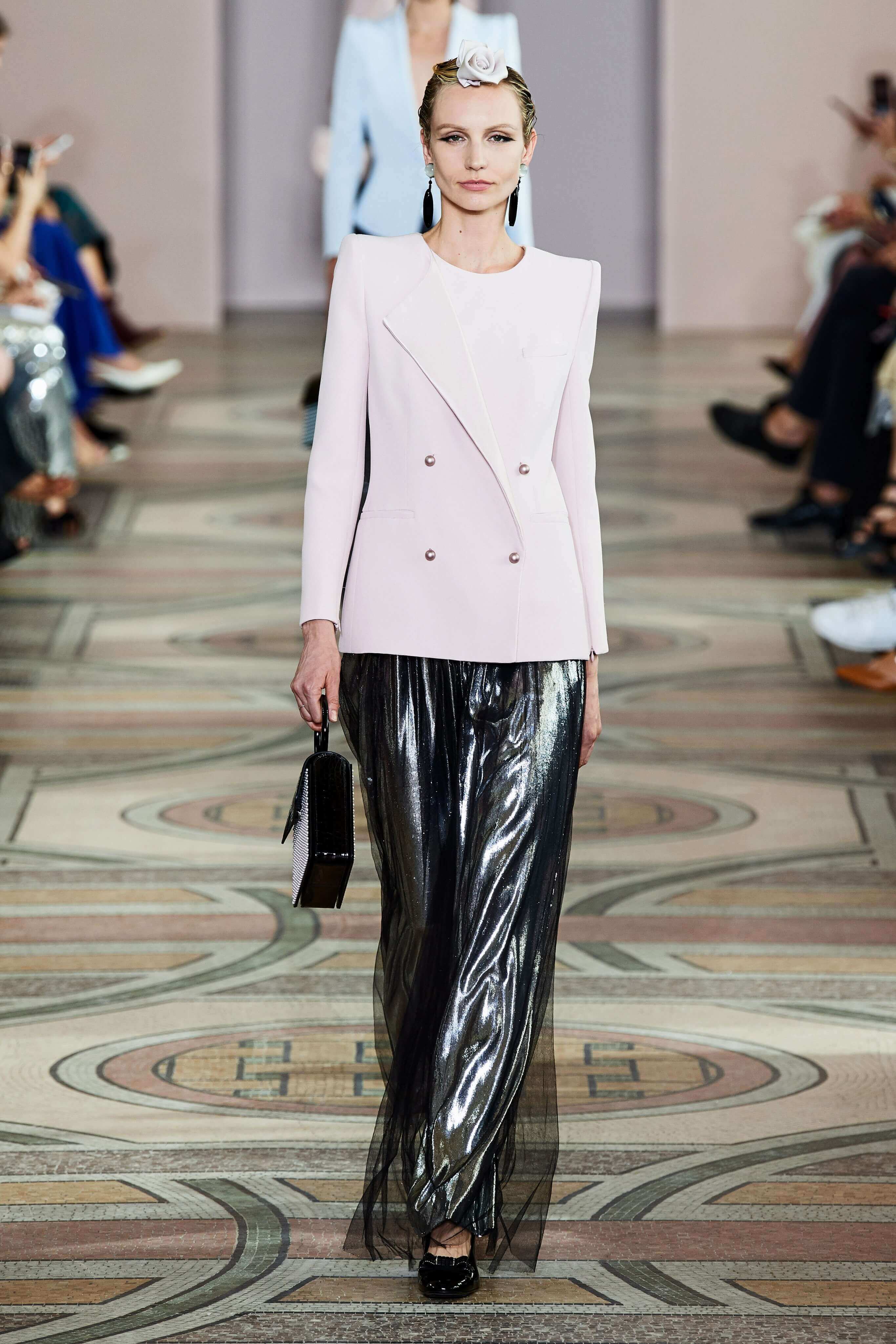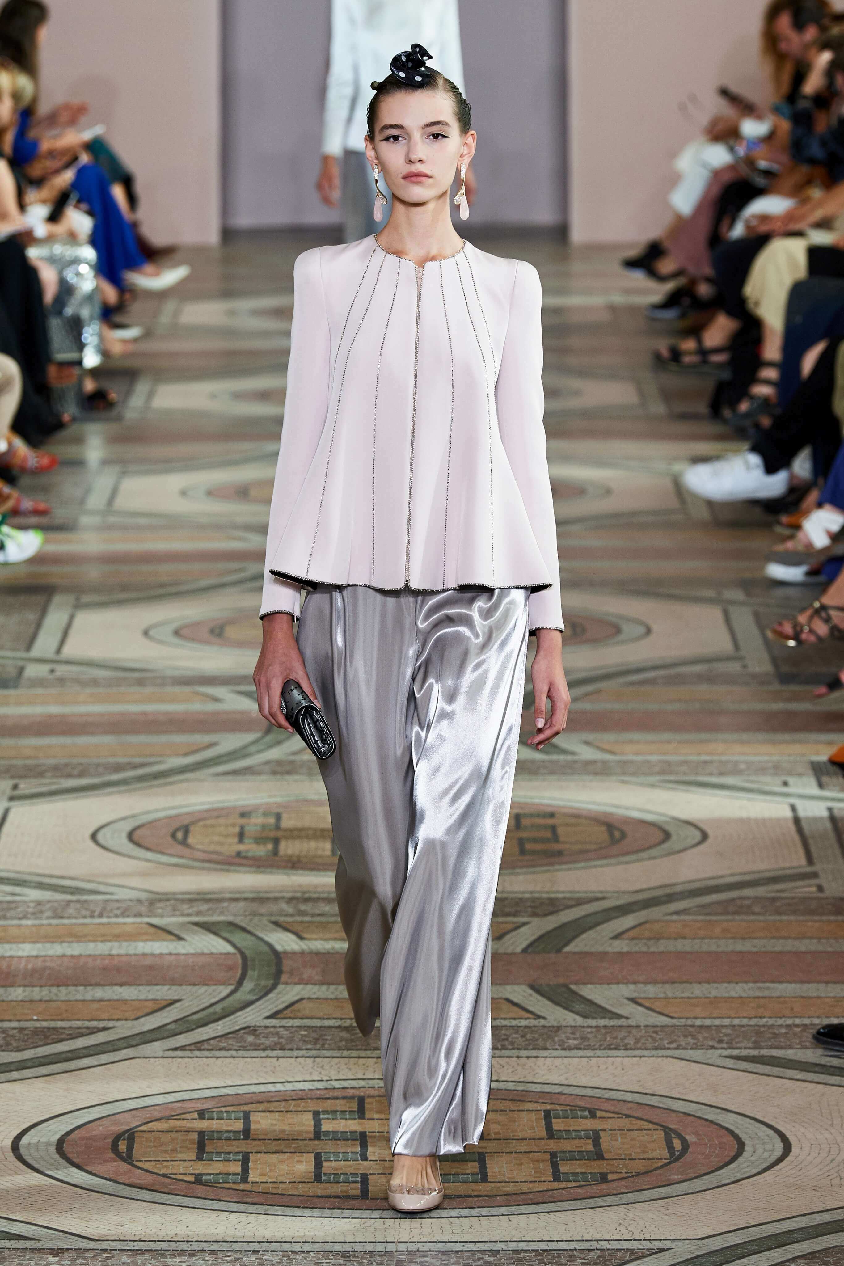 Идеальная формула роскоши от Armani Privé — структурированный жакет полуприлегающего кроя, струящиеся пижамные брюки и маленькая шляпка. На этот раз в качестве аксессуара на укладках моделей располагались миниатюрные текстильные узелки в форме розы, прикрепленные к волосам.