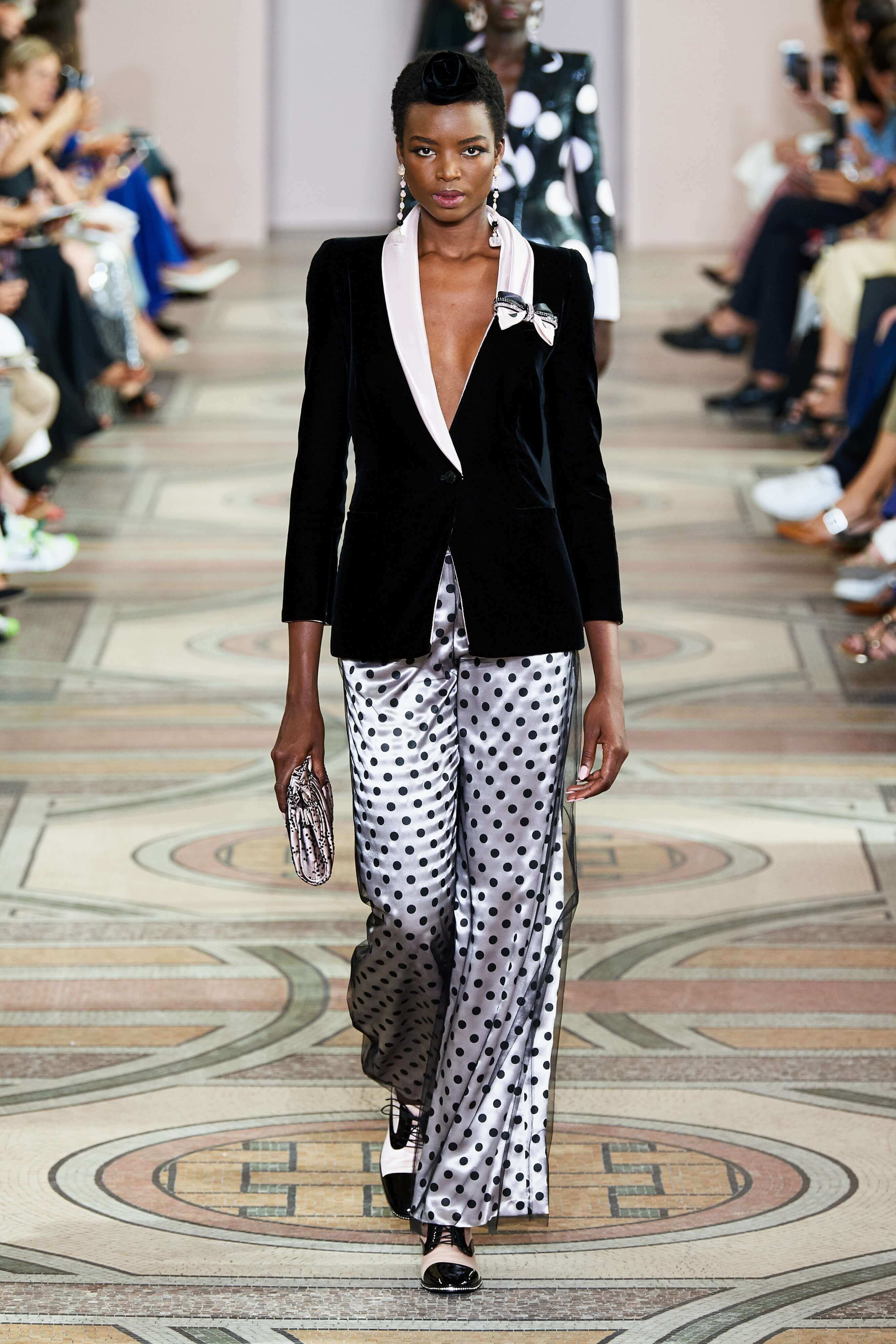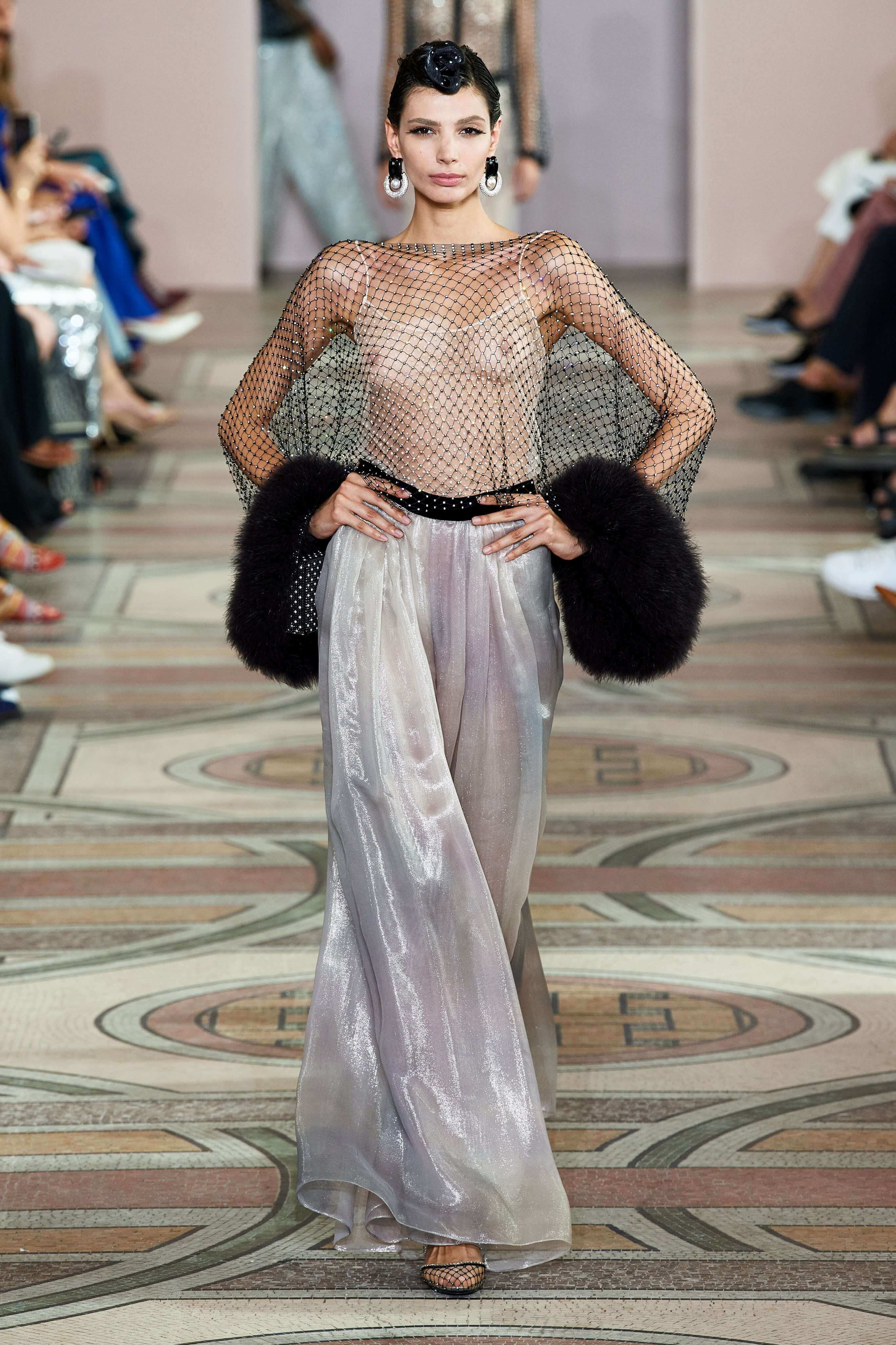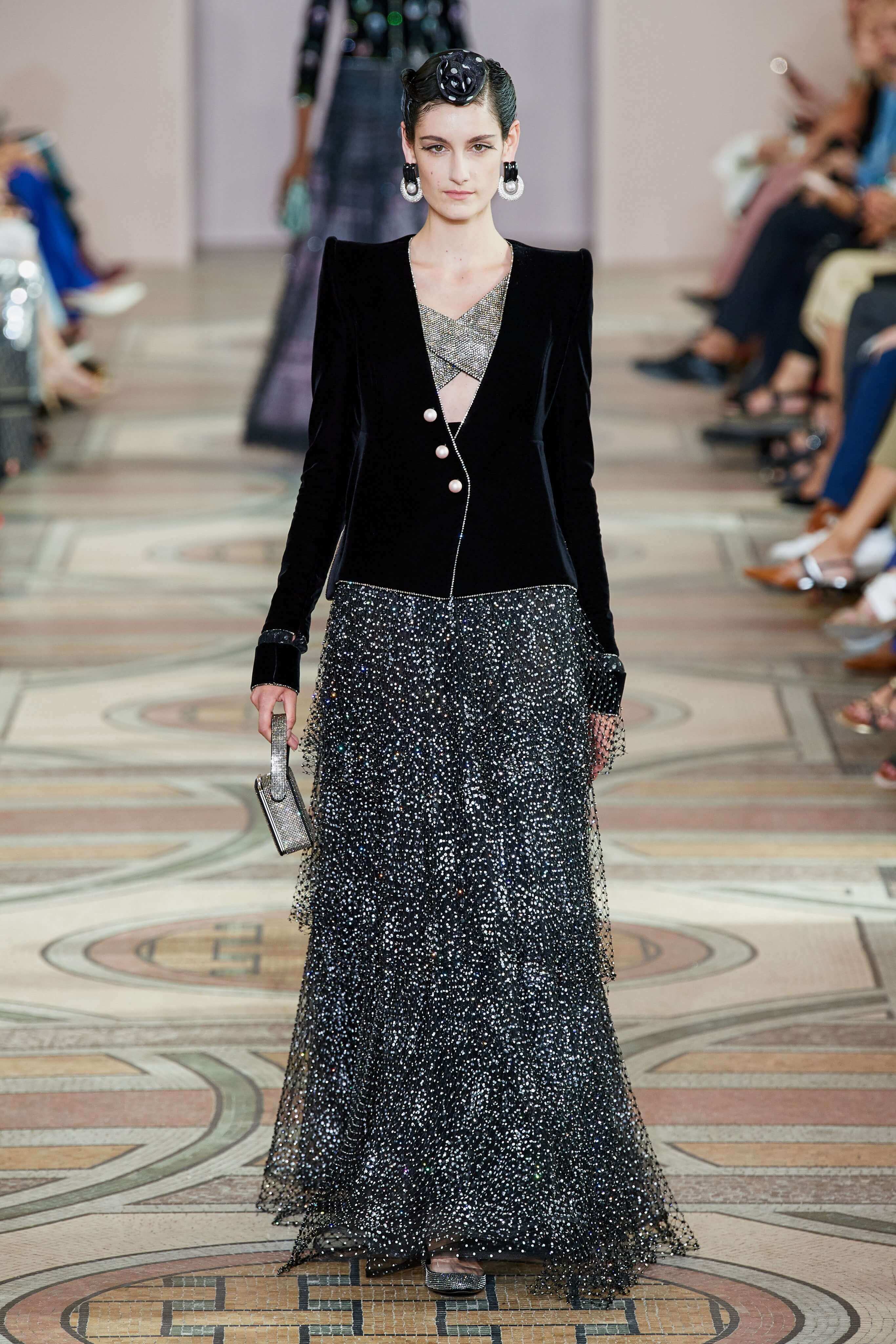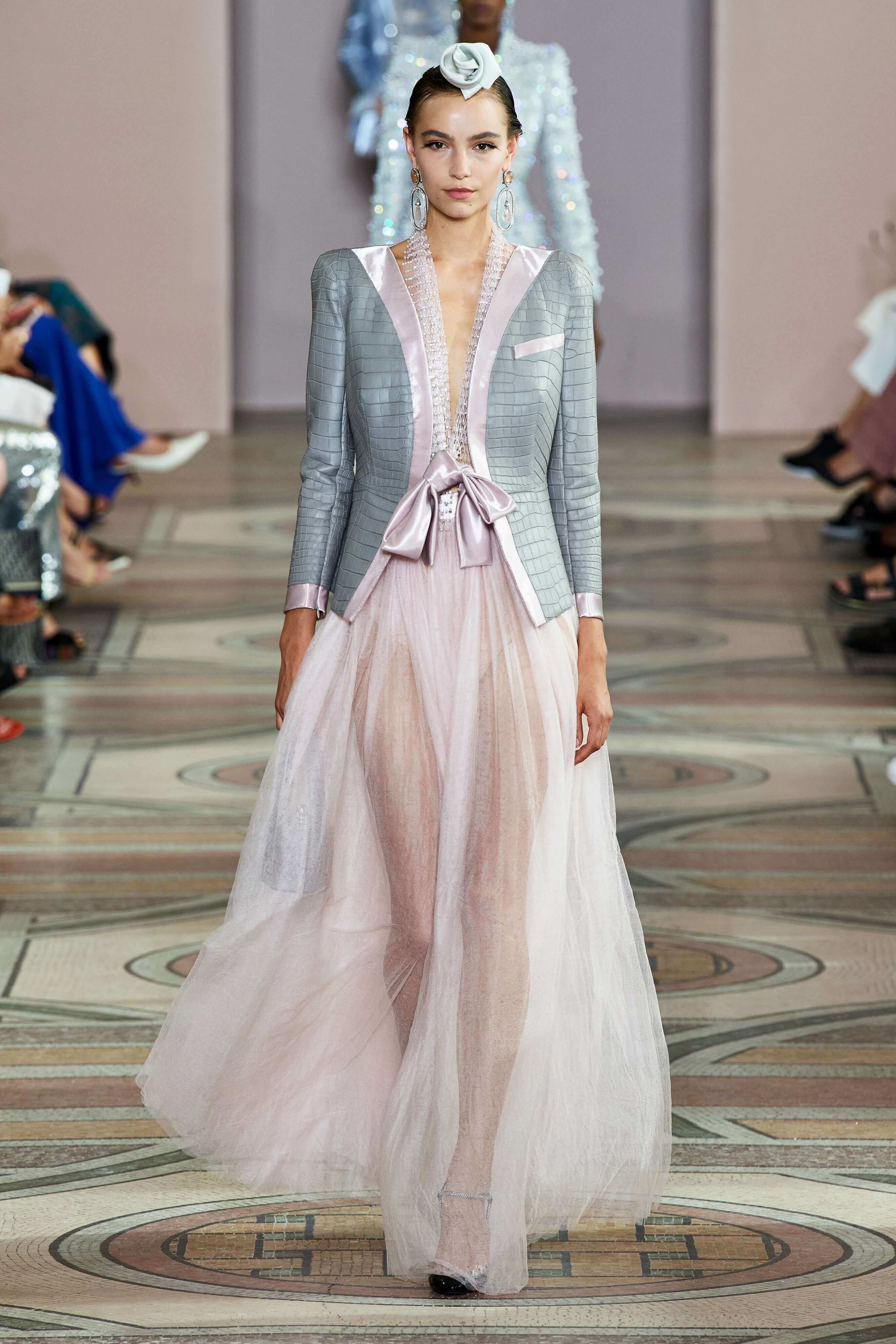 Идеальная формула роскоши от Armani Privé — структурированный жакет полуприлегающего кроя, струящиеся пижамные брюки и маленькая шляпка. На этот раз в качестве аксессуара на укладках моделей располагались миниатюрные текстильные узелки в форме розы, прикрепленные к волосам.